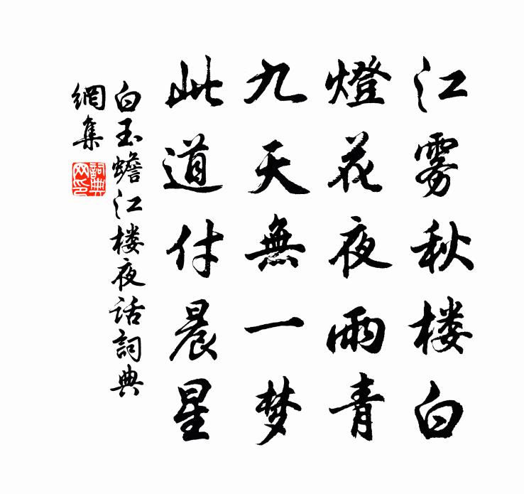 詩詞名句歷史字典書法欣賞書法字典國語詞典說文解字康熙字典古漢語字典標 題 作 者 詩 句 江樓夜話作者:白玉蟾 朝代:宋代江樓夜話原文江霧秋樓白,燈花夜雨青。九天無一夢,此道付晨星。詩詞問答問:江樓夜話的作者是誰?答:白玉蟾問:江樓夜話寫於哪個朝代?答:宋代問:江樓夜話是什麼體裁?答:五絕白玉蟾江樓夜話書法欣賞江樓夜話書法作品詩詞推薦四明山詩過雲陸龜蒙〔唐代〕相訪一程雲,雲深路僅分。嘯台隨日辨,樵斧帶風聞。曉著衣全濕,寒沖酒不醺。幾回歸思靜,仿佛見蘇君。四月晦日小雨陸游〔宋代〕霏霏亂點暗朝光,蔌蔌奇聲渡野塘。一浦未輸新漲綠,四郊聊壓旱塵黃。風生團扇清無暑,衣覆熏籠潤有香。竹屋李才翁懶窩林憲〔宋代〕鴞鳴夜沉沉,蛩語露泥泥。飛雲帶月來,投我襟袖裹。心自徹太虛,痱纇忽一洗。世念償盡消,萬法亦聊爾。西江月朱敦儒〔宋代〕琴上金星正照,硯中鸖眼相青。閒來自覺有精神。心海風恬浪靜。且喜面前花好,更聽林外鶯新。瓮頭清辣洞庭春寄張郎中文同〔宋代〕常慚無才動有權,十年鄉里但留連。養成答颯人應笑,學得支離自謂賢。三館舊遊層漢上,一麾今守亂峰前。幸逢醉蓬萊(癸丑壽呂馬帥)李曾伯〔宋代〕問金城方略,數十年來,誰堪稱許。萬福威名,草木識淮浦。西顧天長,中流地重,著此巨鰲柱。見說棋邊,風聲謾成鄭俠〔宋代〕琴雖古意元無取,詩近虛名亦懶吟。不是將心就無事,都緣無事可關心。贈歌者薛能〔唐代〕一字新聲一顆珠,轉喉疑是擊珊瑚。聽時坐部音中有,唱後櫻花葉里無。漢浦蔑聞虛解佩,臨邛焉用枉當壚。誰人念奴嬌·春雪詠蘭陳子龍〔明代〕問天何意,到春深、千里龍山飛雪?解佩凌波人不見,漫說芷珠宮闕。楚殿煙微,湘潭月冷,料得都攀折。嫣然幽張山人草堂會王方士韓翃〔唐代〕嶼花晚,山日長,蕙帶麻襦食草堂。一片水光飛入戶,千竿竹影亂登牆。園梅熟,家醞香。新濕頭巾不復篸,相看野塘秋鷺史彌寧〔宋代〕玉產秋塘一振衣,竦肩莫是為尋詩。近來絕洗了和樣,島瘦郊寒渠得之。裴侍中晉公以集賢林亭即事詩三十六韻見贈…以伸酬獻白居易〔唐代〕三江路千里,五湖天一涯。何如集賢第,中有平津池。池勝主見覺,景新人未知。竹森翠琅玕,水深洞琉璃。水竹詠白蓮皮日休〔唐代〕膩於瓊粉白於脂,京兆夫人未畫眉。靜婉舞偷將動處,西施嚬效半開時。通宵帶露妝難洗,盡日凌波步不移。願作著書陸游〔宋代〕平生著書汗馬牛,一事不施今白頭。河洛未清非我責,山林高臥復何求!愚公可笑金堆屋,老子唯須糟築丘。華表聞子耕司戶兄非一日昨見墨帖於中州又誦五言趙蕃〔宋代〕墨妙初看眼自明,誦詩還見五言城。不惟喜獲吾黨士,要是未忘山谷盟。我亦可憐耽句癖,君其勉力振家聲。只今藥園司空曙〔唐代〕春園芳已遍,綠蔓雜紅英。獨有深山客,時來辨藥名。錦堂春/錦堂春慢黃裳〔宋代〕天女多情,梨花碎翦,人間贈與多才。漸瑤池瀲灩,粉翹徘徊。面不禁風力,背人飛去還來。最清虛好處,遙度幽雜興宋祁〔宋代〕商君要術惟強國,孟子深心肯信書,大抵空言是糟粕,斲輪甘苦定何如。減字木蘭花(和孔純老送鄭深道移守嚴州)王之道〔宋代〕金尊頻倒。照坐梅花清更好。春到長楊。寵拜三公入鄭莊。月城兩載。千里生靈蒙惠愛。舞徹歌詞。並立新妝綠帶惜梅滕岑〔宋代〕牧孺樵童不管風,亂攀曾不比荊榛。那知立馬江南客,一萼真香淚一巾。名句推薦邯鄲驛里逢冬至,抱膝燈前影伴身。白居易《邯鄲冬至夜思家》 為學不外靜敬二字,教人先去驕惰二字。王永彬《圍爐夜話·第一四八則》 今夜送歸燈火冷,河塘,墮淚羊公卻姓楊。蘇軾《南鄉子·和楊元素時移守密州》 四月十七,正是去年今日,別君時。韋莊《女冠子·四月十七》 凝恨對殘暉,憶君君不知。韋莊《菩薩蠻》 越女新妝出鏡心,自知明艷更沉吟。張籍《酬朱慶餘》 百囀千聲隨意移,山花紅紫樹高低。歐陽修《畫眉鳥》 問余何意棲碧山,笑而不答心自閒。李白《山中問答 / 山中答俗人問》 天清一雁遠,海闊孤帆遲。李白《送張舍人之江東》 水何澹澹,山島竦峙曹操《觀滄海》