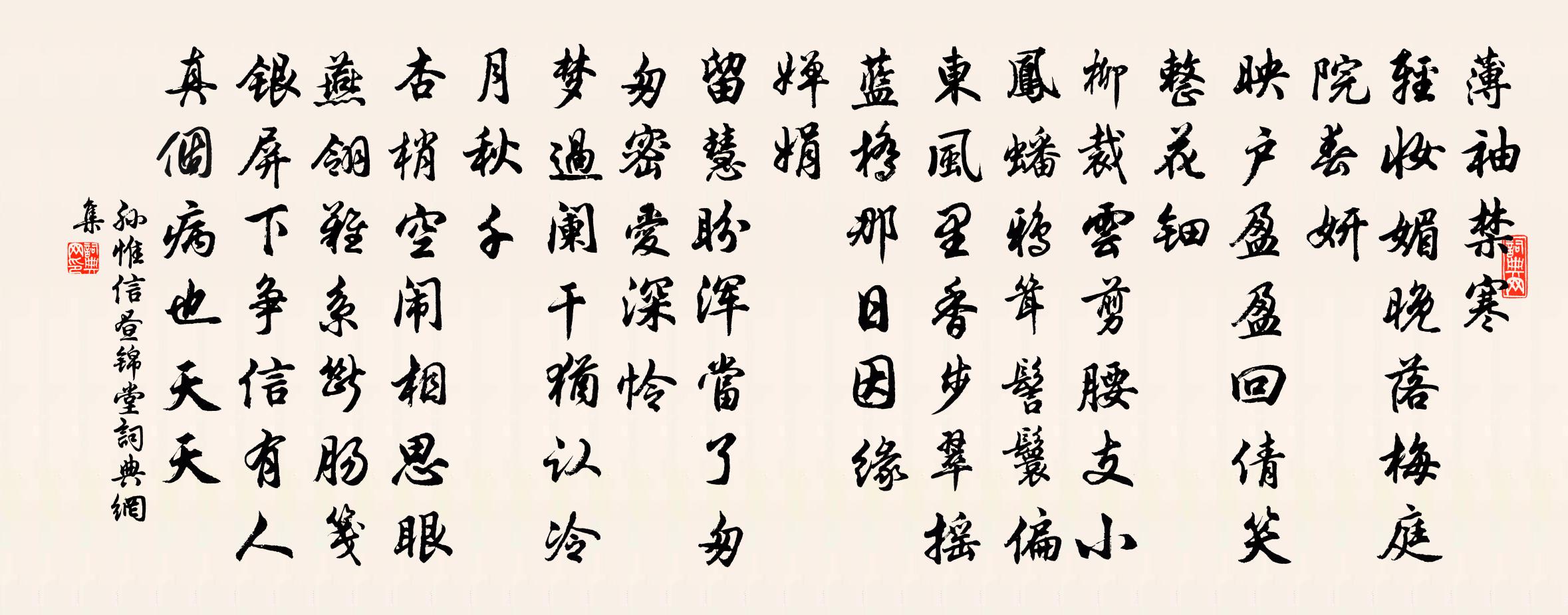 詩詞名句歷史字典書法欣賞書法字典國語詞典說文解字康熙字典古漢語字典標 題 作 者 詩 句 晝錦堂作者:孫惟信 朝代:宋代晝錦堂原文薄袖禁寒。輕妝媚晚,落梅庭院春妍。映戶盈盈,回倩笑整花鈿。柳裁雲剪腰支小,鳳蟠鴉聳髻鬟偏。東風裡,香步翠搖,藍橋那日因緣。嬋娟。留慧盼,渾當了、匆匆密愛深憐。夢過闌乾,猶認冷月鞦韆。杏梢空鬧相思眼,燕翎難系斷腸箋。銀屏下,爭信有人,真箇病也天天。詩詞問答問:晝錦堂的作者是誰?答:孫惟信問:晝錦堂寫於哪個朝代?答:宋代問:晝錦堂是什麼體裁?答:詞孫惟信晝錦堂書法欣賞晝錦堂書法作品詩詞推薦滿庭芳 冀德修生朝李庭〔元代〕燕寢凝香,金貂貰酒,挽將天上春回。踵門為壽,盡道謫仙才。誰識元龍豪氣,沈雄自、湖海中來。十年夢,新亭再作十絕寄胡伯負兵侍仲方尚書李元實〔宋代〕公家富貴足掀天,都出新州十九年。若念象台今日客,方知澹老子孫賢。驀山溪晁端禮〔宋代〕輕衫短帽,重入長安道。屈指十年中,一回來、一回漸老。朋游在否,落托更能無,朱弦悄。知音少。撥斷相思調夜泊越州逢北使沈佺期〔唐代〕天地降雷雨,放逐還國都。重以風潮事,年月戒回艫。容顏荒外老,心想域中愚。憩泊在茲夜,炎雲逐斗樞。風音圓機再賦紳字韻詩深得淒切之格降嘆之餘敘事晁說之〔宋代〕軔車邂逅便相親,同是山公啟事人。短髮何堪臨石鏡,長懷謾自落泉紳。談窮漢士三千牘,問盡胡僧十二因。茅屋一翦梅程垓〔宋代〕舊日心期不易招。重來孤負,幾個良宵。尋常不見盡相邀。見了知他,許大無聊。昨夜梅花插翠翹。影落清溪,應憶江南·春去也劉禹錫〔唐代〕春過也,共惜艷陽年。猶有桃花流水上,無辭竹葉醉樽前,惟待見青天。春去也,多謝洛城人。弱柳從風疑舉袂,飲酒二十首同蘇翰林先生次韻追和陶淵明三晁補之〔宋代〕陶公群於人,而無人之情。詩豈世外語,世語不可名。東坡憐此翁,同調但隔生。形光來戶屨,真處人不驚。得酒聞南陽呂諫議長逝鄭獬〔宋代〕子文三仕去何頻,一臥南陽竟沒身。明主自應容直道,皇天何事殺忠臣。拄天力屈空留草,貫日心存不化塵。黃壤和張功父見寄陸游〔宋代〕佐命貂蟬再世孫,手鉏瓜壟傍青門。超騰已得丹換骨,戀著肯求香返魂?正復悲秋如騎省,可令病渴似文園?庭前阻風游銅陵護法寺鄭獬〔宋代〕白浪浮江打白沙,江頭綠竹對僧家。春風也似玉京好,一樹殘紅山杏花。讀句踐傳呂溫〔唐代〕丈夫可殺不可羞,如何送我海西頭。更生更聚終須報,二十年間死即休。牡丹花羅隱〔唐代〕似共東風別有因,絳羅高卷不勝春。若教解語應傾國,任是無情亦動人。芍藥與君為近侍,芙蓉何處避芳塵。可憐太常引姬翼〔元代〕賢愚汲汲斗經營。唯是利和名。渾似弄潮人。與千丈、風波競爭。百年光景,一堆塵土,碌碌苦勞生。回首問前程句張釜〔宋代〕三杯軟飽千林暝。九月二十日率趙彥和王平叔劉誼夫游棲岩寺彥郭印〔宋代〕少時苦愛山,藜杖春復秋。峰巒如佳人,一顧銷百憂。野性不受羈,思與麋鹿游。失腳名宦場,冠纓絡人頭。州家挽王柳州程珌〔宋代〕才華唐令君,名勝晉參軍。善政流郴水,遺風襲縉雲。寶釵當自合,神劍不中分。心折白岩路,猿吟日未曛。入蒲關先寄秦中故人岑參〔唐代〕秦山數點似青黛,渭上一條如白練。京師故人不可見,寄將兩眼看飛燕。第二百卷思江南筍蕨姚勉〔宋代〕先生亟去理山齋,筍蕨春甜味正佳。一夜東風催變綠,筍吹成竹蕨成柴。步出武陵東亭臨江寓望劉禹錫〔唐代〕鷹至感風候,霜餘變林麓。孤帆帶日來,寒江轉沙曲。戍搖旗影動,津晚櫓聲促。月上彩霞收,漁歌遠相續。名句推薦舟非水不行,水入舟則沒佚名《孔子家語·六本》 同居長乾里,兩小無嫌猜。李白《長干行二首》 游女帶花偎伴笑,爭窈窕,競折團荷遮晚照。李珣《南鄉子·乘彩舫》 刷羽同搖漾,一舉還故鄉。沈約《詠湖中雁》 暮雨忽來鴻雁杳,莽關山、一派秋聲里。龔自珍《金縷曲·癸酉秋出都述懷有賦》 堂上謀臣尊俎,邊頭將士干戈辛棄疾《西江月其六》 夢斷香消四十年,沈園柳老不吹綿。陸游《沈園二首》 笛中聞折柳,春色未曾看。李白《塞下曲六首·其一》 一霎荷塘過雨,明朝便是秋聲。項鴻祚《清平樂·池上納涼》 驟雨過,珍珠亂撒,打遍新荷。元好問《驟雨打新荷》