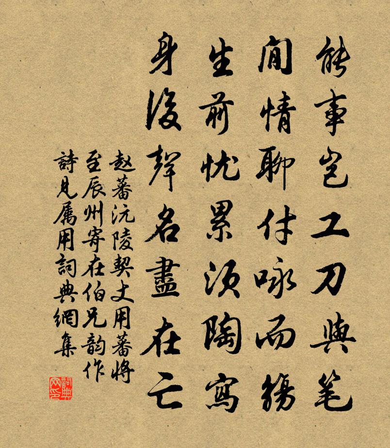 詩詞名句歷史字典書法欣賞書法字典國語詞典說文解字康熙字典古漢語字典標 題 作 者 詩 句 沅陵契丈用蕃將至辰州寄在伯兄韻作詩見屬用作者:趙蕃 朝代:宋代原文能事豈工刀與筆,閒情聊付詠而觴。生前憂累須陶寫,身後聲名盡在亡。詩詞問答問:《沅陵契丈用蕃將至辰州寄在伯兄韻作詩見屬用》的作者是誰?答:趙蕃問:該詩寫於哪個朝代?答:宋代書法欣賞沅陵契丈用蕃將至辰州寄在伯兄韻作詩見屬用書法作品詩文賞析【原題】:沅陵契丈用蕃將至辰州寄在伯兄韻作詩見屬用韻奉答二首詩詞推薦安樂寺童謠佚名〔唐代〕可憐安樂寺,了了樹頭懸。讀《山海經》 其八陶淵明〔魏晉〕自古皆有沒,何人得靈長?不死復不死,萬歲如平常。赤泉給我飲,員丘足我糧。方與三辰游,壽考豈渠央!採蓮曲鄭愔〔唐代〕錦dh沙棠艦,羅帶石榴裙。綠潭采荷芰,清江日稍曛。魚鳥爭唼喋,花葉相芬氳。不覺芳洲暮,菱歌處處聞。蘇幕遮高道寬〔元代〕這無為,先天造。有有無無,端的無窮妙。最上不空誰曾到。強曰為名,假作字之號。道真常,大秘奧。覺象圓明如夢令(和張文伯芍藥)王之道〔宋代〕綽約一枝紅怨。疏雨淡煙池館。梅子欲黃時,日倚朱闌幾遍。爭看。爭看。人在沈香亭畔。寄題朱元晦武夷精舍十二寒棲館楊萬里〔宋代〕鏈王雲粘杵,朝真露濕衣。一聲半夜鶴,月里羽人歸。送李誠之知瀛州蘇轍〔宋代〕少年封學詩封,晚封歲探至道封。豈伊封疆臣,乃是廊廟寶。苦恨富貴遲,聲名得空早。憶惟西羌桀,始建元戎纛即事陸游〔宋代〕幽鳥呼人出睡鄉,層層露葉漏朝陽。臨池只欲消殘醉,無奈鵝兒似酒黃。捉船行吳偉業〔清代〕官差捉船為載兵,大船買脫中船行。中船蘆港且潛避,小船無知唱歌去。郡符昨下吏如虎,快槳追風搖急櫓。村人寄題龍泉李氏萬卷堂周必大〔宋代〕斷簡殘編已可披,排簽插架有餘師。五三載籍多為貴,九百虞初小不遺。潤屋殊非阿堵物,傳家自是寧馨兒。老來溪村王鎡〔宋代〕水路隨山轉,溪晴踏軟沙。斜陽曬魚網,疏竹露人家。行蟹上枯岸,飢禽銜落花。老翁分石坐,閒話到桑麻。時升詠雪禁體物矣而彥序復為之取韻尤嚴勉強郭印〔宋代〕朔風吹空高岡裂,忍凍幽人心似鐵。今朝雲色一天同,片片如簁墮濃雪。影搖寒水照曈曨,聲瀉黃蘆聽騷屑。澗谷和柳子玉官舍十首之土榻黃庭堅〔宋代〕榻前鼓吹蛙一部,榻上古木吟風雨。客來相倚竹根眠,免令不解陳登去。讀秦紀二首張耒〔宋代〕汲汲威刑繼祖龍,收功終在望夷宮。未應家國歸車府,卻有山東老沛公。友人惠酒殊佳用清光滑辣四字為韻以謝馮時行〔宋代〕六府萃百感,攻愁須酒兵。故人如我知,侵月走雙甖。手裂絳泥封,瓦盆貯瑤瓊。我生百世後,見此聖之清。一飲新亭薄暮錢時〔宋代〕讀罷羲經笑倚空,蜀溪溪上蜀溪翁。詩成斷雨流雲外,人在光風霽月中。送陳叔方侍郎二首劉克莊〔宋代〕猶記同穿豹尾中,一翻覆手異蛇龍。呂侯賜履作方伯,毛穎免冠成禿翁。清苦吏人無厚祿,殷勤軍將有斜封。君歸偶作因懷大同道友貫休〔唐代〕蠻木葉不落,微吟漳水濱。二毛空有雪,萬事不如人。氵塹水平芳草,山花落淨巾。天童好真伴,何日更相親。烏夜啼庾信〔南北朝〕桂樹懸知遠。風竿詎肯低。獨憐明月夜。孤飛猶未棲。虎賁誰見惜。御史詎相攜。雖言入弦管。終是曲中啼。題大賽山中人家董嗣杲〔宋代〕課孫課子業桑麻,最喜無人識故家。八口日支資地力,一頭雪色感年華。甜瓜苦過王戎李,古木枯如博望槎。豈得名句推薦日長籬落無人過,惟有蜻蜓蛺蝶飛。范成大《四時田園雜興·其二》 敵之大,無過不知;禍之烈,友敵為甚。來俊臣《羅織經·制敵卷第五》 東風靜、細柳垂金縷。万俟詠《三台·清明應制》 何處可為別,長安青綺門。李白《送裴十八圖南歸嵩山二首》 萬事到頭都是夢,休休。明日黃花蝶也愁。蘇軾《南鄉子·重九涵輝樓呈徐君猷》 何計長來此,閒眠過一生。姚合《秋夜月中登天壇》 堪笑楚江空渺渺,不能洗得直臣冤。文秀《端午》 曲終漏盡嚴具陳,月沒星稀天下旦。佚名《雞鳴歌》 辭多類非而是,多類是而非。是非之經,不可不分。呂不韋《呂氏春秋·論·慎行論》 終日望君君不至,舉頭聞鵲喜。馮延巳《謁金門·風乍起》