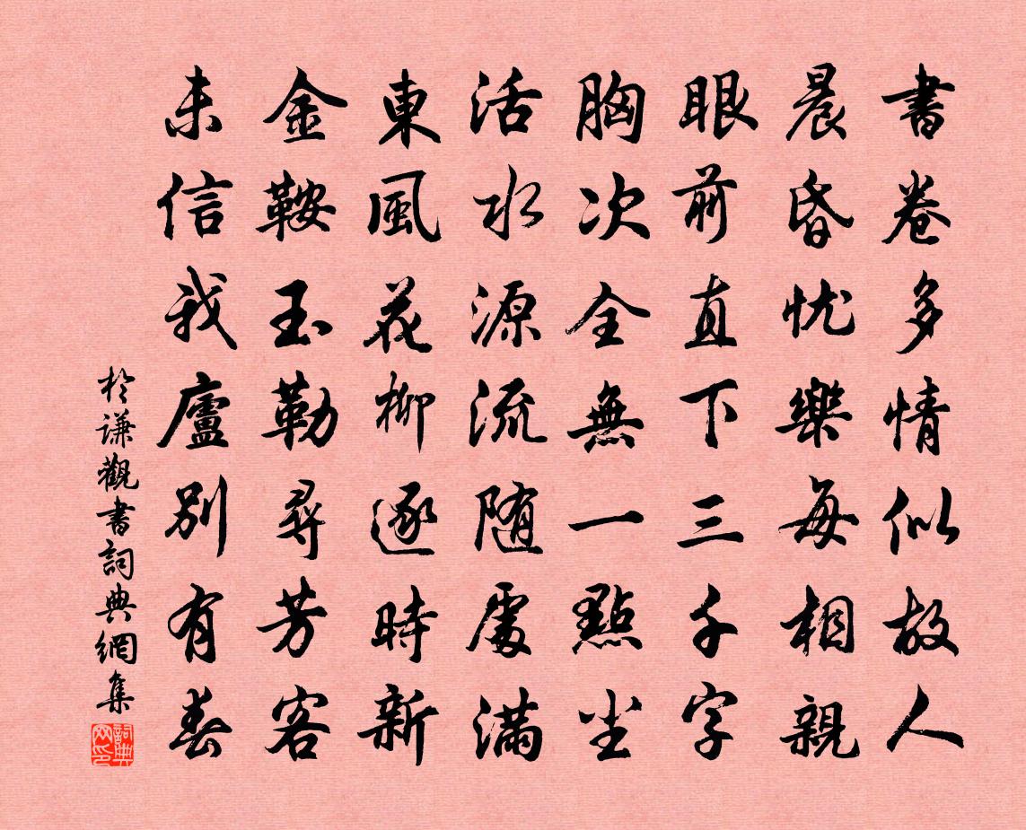 “活水隨流隨處滿,東風花柳逐時新。”活水句,化用朱熹《觀書有感》“問渠那得清如許,謂有源頭活水來”句,是說堅持經常讀書,就象池塘不斷有活水注入,不斷得到新的營養,永遠清澈。“東風”句是說勤奮攻讀,不斷增長新知,就象東風催開百花,染綠柳枝一樣,依次而來,其樂趣令人心曠神怡 。