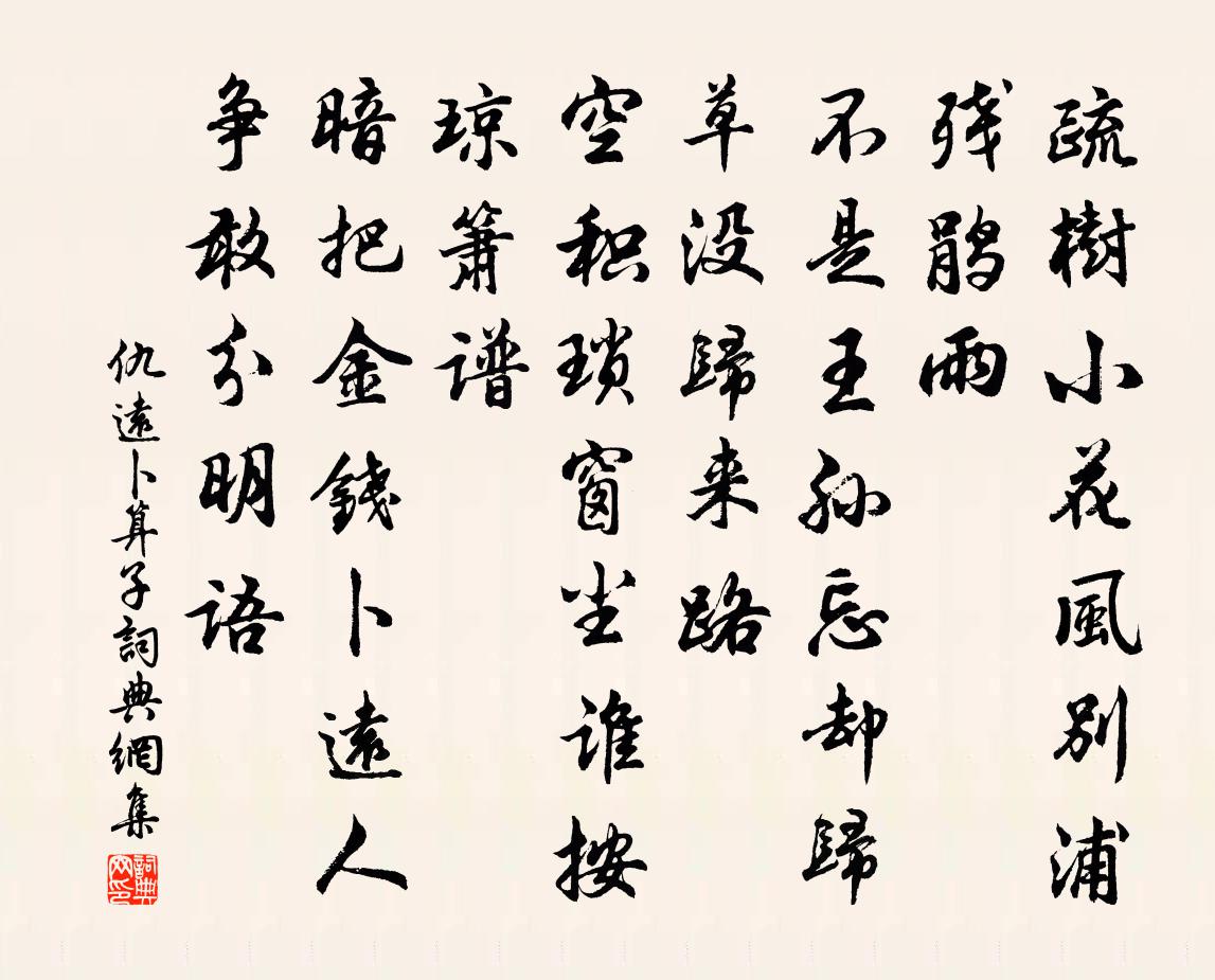 詩詞名句歷史字典書法欣賞書法字典國語詞典說文解字康熙字典古漢語字典標 題 作 者 詩 句 卜運算元作者:仇遠 朝代:宋代卜運算元原文疏樹小花風,別浦殘鵑雨。不是王孫忘卻歸,草沒歸來路。空積瑣窗塵,誰按瓊簫譜。暗把金錢卜遠人,爭敢分明語。詩詞問答問:卜運算元的作者是誰?答:仇遠問:卜運算元寫於哪個朝代?答:宋代問:卜運算元是什麼體裁?答:詞仇遠卜運算元書法欣賞卜運算元書法作品詩詞推薦西齋秋感二十首方回〔宋代〕老態夜乃見,終無甜夢期。西齋臥空壁,適值殘□□。□□寒雨來,此聲世誰知。四更遠雞鳴,披衣起題詩。舌根酬許十三秀才兼依來韻杜牧〔唐代〕多為裁詩步竹軒,有時凝思過朝昏。篇成敢道懷金璞,吟苦唯應似嶺猿。迷興每慚花月夕,寄愁長在別離魂。煩君和梅臞瀑布韻胡仲弓〔宋代〕銀河清夜決,一派落岩前。雷激驚龍蟄,霜飛冷鶴眠。醉鄉思入聖,吟骨欲登仙。世路風波惡,山中別有天。贈宋校書李洞〔唐代〕曾伴元戎獵,寒來夢北軍。閒身不計日,病鶴放歸林。石上鋪棋勢,船中賭酒分。長言買天姥,高臥謝人群。早興白居易〔唐代〕晨光出照屋樑明,初打開門鼓一聲。犬上階眠知地濕,鳥臨窗語報天晴。半銷宿酒頭仍重,新脫冬衣體乍輕。睡覺初秋感事三首劉克莊〔宋代〕跌盪當年賦兩京,晚拋筆硯事春耕。達空函啟已心懶,讀夾注書猶眼明。金匱舊聞虛論次,香奩少作悔流行。而今論政邵謁〔唐代〕賢哉三握髮,為有天下憂。孫弘不開閣,丙吉寧問牛。內政由股肱,外政由諸侯。股肱政若行,諸侯政自修。一物和元遺山八首王奕〔宋代〕荒荒望魯甸,姬孔廟粼粼。允祚五十代,顏孟東西鄰。旁求侍坐翁,草莽迷城闉。豈應髮膚體,竟此成湮淪。鏗爾奉和襲美公齋四詠次韻小松陸龜蒙〔唐代〕擢秀逋客岩,遺根飛鳥徑。因求飾清閟,遂得辭危夐。貞同柏有心,立若珠無脛。枝形短未怪,鬣數差難定。況密苦熱行齊己〔唐代〕離宮劃開赤帝怒,喝出六龍奔日馭。下土熬熬若煎煮,蒼生惶惶無處處。火雲崢嶸焚泬寥,東皋老農腸欲焦。何當浣溪沙·春點疏梅雨後姜夔〔宋代〕己酉歲,客吳興,收燈夜闔戶無聊,俞商卿呼之共出,因記所見。春點疏梅雨後枝,翦燈心事峭寒時。市橋攜手步洪澤守閘和二十二弟韻晁說之〔宋代〕小舟洪澤嘆嗟余,欲說人間孰得如。蝙蝠倒懸徒頡頏,獼猴徐步謾趑趄。歲窮雲際行求雁,日暮溪頭坐羨魚。何處滿江紅(病中俞山甫教授訪別,病起寄之)辛棄疾〔宋代〕曲幾 * ,方丈里、君來問疾。更夜雨、匆匆別去,一杯南北。萬事莫侵閒鬢髮,百年正要佳眠食。最難忘、此語哀病驄呈致用元稹〔唐代〕櫪上病驄啼褭褭,江邊廢宅路迢迢。自經梅雨長垂耳,乍食菰蔣欲折腰。金絡頭銜光未滅,玉花衫色瘦來燋。曾聽小圃茅亭初成即事十絕句程公許〔宋代〕一時花木斬新栽,露萼煙苞逐漸開。好事人人能愛惜,莫教容易擁蒿萊。贈圓昉公(昉,蜀僧。僖宗幸蜀,昉堅免紫衣)司空圖〔唐代〕天階讓紫衣,冷格鶴猶卑。道勝嫌名出,身閒覺老遲。曉香延宿火,寒磬度高枝。每說長松寺,他年與我期。南園周元明〔宋代〕熳爛花時錦繡張,無端下馬擊垂楊。山亭水閣笙歌地,合與行人作醉鄉。夜坐偶成葉茵〔宋代〕蓴鱸江上鄉,穩處著虛堂,卻掃百念息,貪吟萬景忙。螢流風戶牖,蛙鬧雨池塘。夢熟田家事,牛衣趁蒔秧。陪李北海宴歷下亭杜甫〔唐代〕東藩駐皂蓋,北渚凌青荷。海內此亭古,濟南名士多。雲山已發興,玉佩仍當歌。修竹不受暑,交流空涌波。蘊真遇仇仁近出齋小飲次前韻五首方回〔宋代〕知君胸次藹春陽,與世多炎豈有涼。書室相迎黃卷積,羽人同坐白須長。此翁久客貧兼病,今歲奇寒雪更霜。一餉名句推薦內省不疚,夫何憂何懼!孔子弟子《論語·顏淵篇》 以國為國,以天下為天下。劉向 編《六親五法》 夫死戰場子在腹,妾身雖存如晝燭。張籍《征婦怨》 人間有味是清歡。蘇軾《浣溪沙·細雨斜風作曉寒》 心事孤山春夢在,到思量、猶斷詩魂吳文英《極相思·題陳藏一水月梅扇》 鄉淚客中盡,孤帆天際看。孟浩然《早寒江上有懷 / 早寒有懷 / 江上思歸》 高岸為谷,深谷為陵。佚名《十月之交》 萬樹寒無色,南枝獨有花。道源《早梅》 重陽獨酌杯中酒,抱病起登江上台。杜甫《九日五首·其一》 臣聞君子樂得其志,小人樂得其事。姜子牙《六韜·文韜·文師》