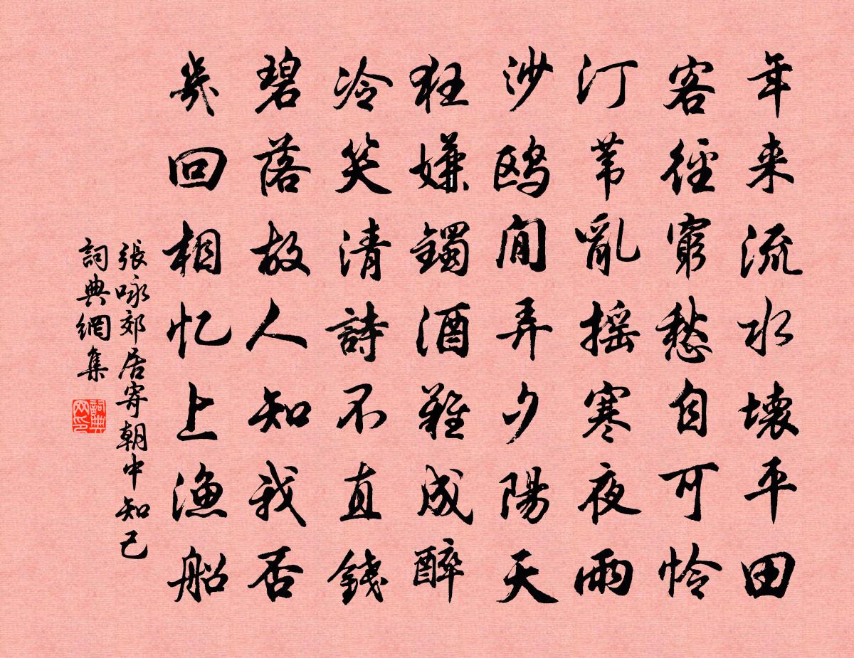 詩詞名句歷史字典書法欣賞書法字典國語詞典說文解字康熙字典古漢語字典標 題 作 者 詩 句 郊居寄朝中知己作者:張詠 朝代:宋代郊居寄朝中知己原文年來流水壞平田,客徑窮愁自可憐。汀葦亂搖寒夜雨,沙鷗閒弄夕陽天。狂嫌鐲酒難成醉,冷笑清詩不直錢。碧落故人知我否,幾回相憶上漁船。詩詞問答問:郊居寄朝中知己的作者是誰?答:張詠問:郊居寄朝中知己寫於哪個朝代?答:宋代張詠郊居寄朝中知己書法欣賞郊居寄朝中知己書法作品詩詞推薦蝶戀花劉仙倫〔宋代〕小立東風誰共語。碧盡行雲,依約蘭皋暮。誰問離懷知幾許。一溪流水和煙雨。媚盪楊花無著處。才伴春來,忙底和文與可洋州園亭三十詠其二十八金登徑蘇轍〔宋代〕葉如石楠堅,實比霜柑大。穿徑得新苞,令公憶鱸鱠。懷州客舍方乾〔唐代〕誤飲覃懷酒,誰知滯去程。朝昏太行色,坐臥沁河聲。白道穿秦甸,嚴鼙似戍城。鄰雞莫相促,遊子自晨征。以詩句詠梅暗香浮動月黃昏方蒙仲〔宋代〕但見白磑磑,香從何處來。廣寒異人世,莫是桂花開。酹江月(秋夕興元使院作,用東坡赤壁韻)胡世將〔宋代〕神州沉陸,問誰是、一范一韓人物。北望長安應不見,拋卻關西半壁。塞馬晨嘶,胡笳夕引,贏得頭如雪。三秦往春夜高翥〔宋代〕小窗兀兀守更殘,案上詩書亦懶觀。頻翦燭花聽夜雨,盡垂簾影隔春寒。破除夢幻從頭了,安置身心向下看。老子暮村趙釴夫〔宋代〕陰村煙樹暝黃昏,一簇人家半掩門。看盡棲鴉啼噪後,牧童歸去雨聲繁。折桂令·丙子游越懷古喬吉〔元代〕蓬萊老樹蒼雲,禾黍高低,孤兔紛紜。半折殘碑。空餘故址,總是黃塵。東晉亡也再難尋個右軍,西施去也絕不見金山寺蘇紳〔宋代〕九派分流涌化城,登臨潛覺骨毛清。僧依玉鑒光中住,人踏金鰲背上行。鍾阜雲開春雨霽,海門雷吼夜潮生。因思戲答元珍歐陽修〔宋代〕春風疑不到天涯,二月山城未見花。殘雪壓枝猶有橘,凍雷驚筍欲抽芽。夜聞歸雁生鄉思,病入新年感物華。曾是許介之以丞相周益公所書古樂府四篇見寄敬題樂雷發〔宋代〕紙上珊瑚間木難,曾敲黃閣卸吟鞍。賞音今有平園否,得句堪尋岣嶁刊。鸚鵡夜棲金屋冷,的盧秋戰玉關寒。春風和樂天尋郭道士不遇昔嘗為僧,於荊州相別。元稹〔唐代〕昔年我見杯中渡,今日人言鶴上逢。兩虎定隨千歲鹿,雙林添作幾株松。方瞳應是新燒藥,短腳知緣舊施舂。為僧鳳簫閣翫月四首白玉蟾〔宋代〕畫閣巋然百尺危,吹來花片點春衣。黃昏璧月溪心浴,白晝銀盤水面飛。奉陪府公賽雪橋公廟紀事兼呈粹幕諸君蘇頌〔宋代〕北走出都門,寒坰冒初雪。言瞻漢三公,嚴祠奉遺烈。襜帷未行春,首茲薦腥血。念昨冬愆陽,時風少凝冽。長人旅夢羅隱〔唐代〕旅夢思遷次,窮愁有嘆嗟。子鵝京口遠,粳米會稽賒。漏澀才成滴,燈寒不作花。出門聊一望,蟾桂向人斜。經孺子亭觀龍井趙蕃〔宋代〕寒泉百尺幾秋春,祠禱流傳信若神。何事古先殊昧此,為霖顧取築岩人。贈周書記李誨言〔宋代〕早悟功名歲月空,衲衣何處不從容。幾回渡水自尋鶴,豈但買山方種松。麾玉固嘗聞咳唾,擲金未盡寫心胸。與君倦眼陸游〔宋代〕看書澀似上羊腸,得睡甘如飲蜜房。起坐藤床搔短髮,數聲畫角報斜陽。題方仙翁點易圖陸宗亮〔宋代〕雲鎖瑤扉童未起,樹搖涼露鶴初還。曲肱道士清溪水,心在羲皇未畫前。酬王太博見寄魏野〔宋代〕錦川誰為寄陽春,清淨堂中清淨人。二十八言刊石處,長如列宿照閒身。名句推薦斷香殘酒情懷惡。西風催襯梧桐落。李清照《憶秦娥·詠桐》 但使龍城飛將在,不教胡馬度陰山。王昌齡《出塞二首》 故鄉遙,何日去。家住吳門,久作長安旅。周邦彥《蘇幕遮·燎沉香》 老子有見於詘,無見於信。荀子《荀子·天論》 今逢四海為家日,故壘蕭蕭蘆荻秋。劉禹錫《西塞山懷古》 春去花還在,人來鳥不驚。王維《畫》 台榭空濛煙柳暗,白鳥銜魚欲舞。納蘭性德《摸魚兒·午日雨眺》 林壑斂暝色,雲霞收夕霏。謝靈運《石壁精舍還湖中作》 是非只為多開口,煩惱皆因強出頭。佚名《增廣賢文·上集》 憶對中秋丹桂叢。花在杯中。月在杯中。辛棄疾《一剪梅·中秋元月》