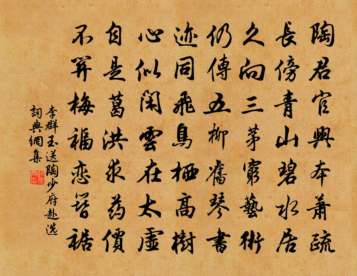詩詞名句歷史字典書法欣賞書法字典國語詞典說文解字康熙字典古漢語字典標 題 作 者 詩 句 送陶少府赴選作者:李群玉 朝代:唐代送陶少府赴選原文陶君官興本蕭疏,長傍青山碧水居。久向三茅窮藝術,仍傳五柳舊琴書。跡同飛鳥栖高樹,心似閒雲在太虛。自是葛洪求藥價,不關梅福戀簪裾。詩詞問答問:送陶少府赴選的作者是誰?答:李群玉問:送陶少府赴選寫於哪個朝代?答:唐代李群玉送陶少府赴選書法欣賞送陶少府赴選書法作品注釋全唐詩:卷569-65詩詞推薦陝州醉贈裴四同年杜牧〔唐代〕淒風洛下同羈思,遲日棠陰得醉歌。自笑與君三歲別,頭銜依舊鬢絲多。滿庭芳周邦彥〔宋代〕花撲鞭梢,風吹衫袖,馬啼初趁輕裝。都城漸遠,芳樹隱斜陽。未慣羈游況味,征鞍上、滿目淒涼。今宵里,三更望巫山張喬〔唐代〕溪疊雲深轉谷遲,暝投孤店草蟲悲。愁連遠水波濤夜,夢斷空山雨雹時。邊海故園荒後賣,入關玄發夜來衰。東歸和吳侍御被使燕然盧照鄰〔唐代〕春歸龍塞北,騎指雁門垂。胡笳折楊柳,漢使采燕支。戍城聊一望,花雪幾參差。關山有新曲,應向笛中吹。句丁謂〔宋代〕子美集開詩世界。記箕山商野事一首劉克莊〔宋代〕放勛禪飲牛父,軒皇問牧馬童。曰夫子致南面,稱天師拜下風。學詩吳可〔宋代〕學詩渾似學參禪,自古圓成有幾聯。春草池塘一句子,驚天動地至今傳。冬述四首示子培 之三陳衍〔清代〕往余游京華,鄭君過我邸。告言子沈子,詩亦同光體。雜然見贈答,色味若粢醴。十年始會面,輟樂正讀禮。從之過柳溪道院戴叔倫〔唐代〕溪上誰家掩竹扉,鳥啼渾似惜春暉。日斜深巷無人跡,時見梨花片片飛。謁江華曾百里劉過〔宋代〕鬢髮已皤非故吾,依然破帽老騎驢。江邊遊了斷腸句,漢殿逐臣流涕書。父祖松楸三世冢,弟兄桑梓百年居。狐丘奉和聖制九月十八日賜百僚追賞因書所懷權德輿〔唐代〕錫宴朝野洽,追歡堯舜情。秋堂絲管動,水榭煙霞生。黃花媚新霽,碧樹含餘清。同和六律應,交泰萬宇平。春藻招鶴所詞為澉浦監稅趙潛夫作葛紹體〔宋代〕君之來兮鶴自九皋,駕以去兮渺天地而逍遙。縞衣玄裳兮橫大海之驚濤,雲旗先驅兮霓旌旖旎。月皓皓兮風灑灑,飲闌月上不能留客再成一篇王炎〔宋代〕綠幄陰深數樹梅,胡床相對手行杯。茫茫世事愁眉斂,亹亹談諧笑口開。欲把清風留客至,更呼明月出雲來。咄嗟詩送陳促思參佐廣右幕府張栻〔宋代〕舊說桂林好,君今幕府游。江山資暇日,梅雪類吾州。煮海何多說,安邊更預謀。政應勤婉畫,不用賦離憂。到官三歲四首宋祁〔宋代〕儒帥非真帥,瓜時定幾時。丹心雖許壯,白髮不藏衰。罟密游鱗駭,山遙倦翼遲。歲成無奏最,準擬雁門踦。巴南舟中,思陸渾別業岑參〔唐代〕瀘水南州遠,巴山北客稀。嶺雲撩亂起,谿鷺等閒飛。鏡里愁衰鬢,舟中換旅衣。夢魂知憶處,無夜不先歸。真陽峽楊萬里〔宋代〕清遠雖佳未足觀,真陽佳絕冠南蠻。一泉嶺背懸崖出,亂灑江邊怪石間。來岸對排雙玉筍,此峰外面萬青山。險艱留別常著郎士元〔唐代〕歲晏蒼郊蓬轉時,遊人相見說歸期。宓君堂上能留客,明日還家應未遲。同誼夫國才餞季然於普門院取壁間五字詩各探王灼〔宋代〕暑途勸加餐,養成摩天翮。中車寶帶黃,小隊油幢碧。儒富莊謝枋得〔宋代〕東觀群儒作好官,束書不許散人看。何時遂作西林友,讀得韓文熟已難。名句推薦寢興目存形,遺音猶在耳。潘安《悼亡詩三首》 知者行之始。行者知之成。王陽明《傳習錄·卷上·門人陸澄錄》 背法而治,此任重道遠而無馬、牛,濟大川而無舡、楫也。商鞅《商君書·弱民》 乍暖還輕冷。張先《青門引·春思》 數回細寫愁仍破,萬顆勻圓訝許同杜甫《野人送朱櫻》 來是春初,去是春將老。曾允元《點絳唇·一夜東風》 千尋鐵鎖沉江底,一片降幡出石頭。劉禹錫《西塞山懷古》 薊庭蕭瑟故人稀,何處登高且送歸。王之渙《九日送別》 相思黃葉落,白露濕青苔。李白《長相思三首》 第四橋邊,擬共天隨住。姜夔《點絳唇·丁未冬過吳松作》