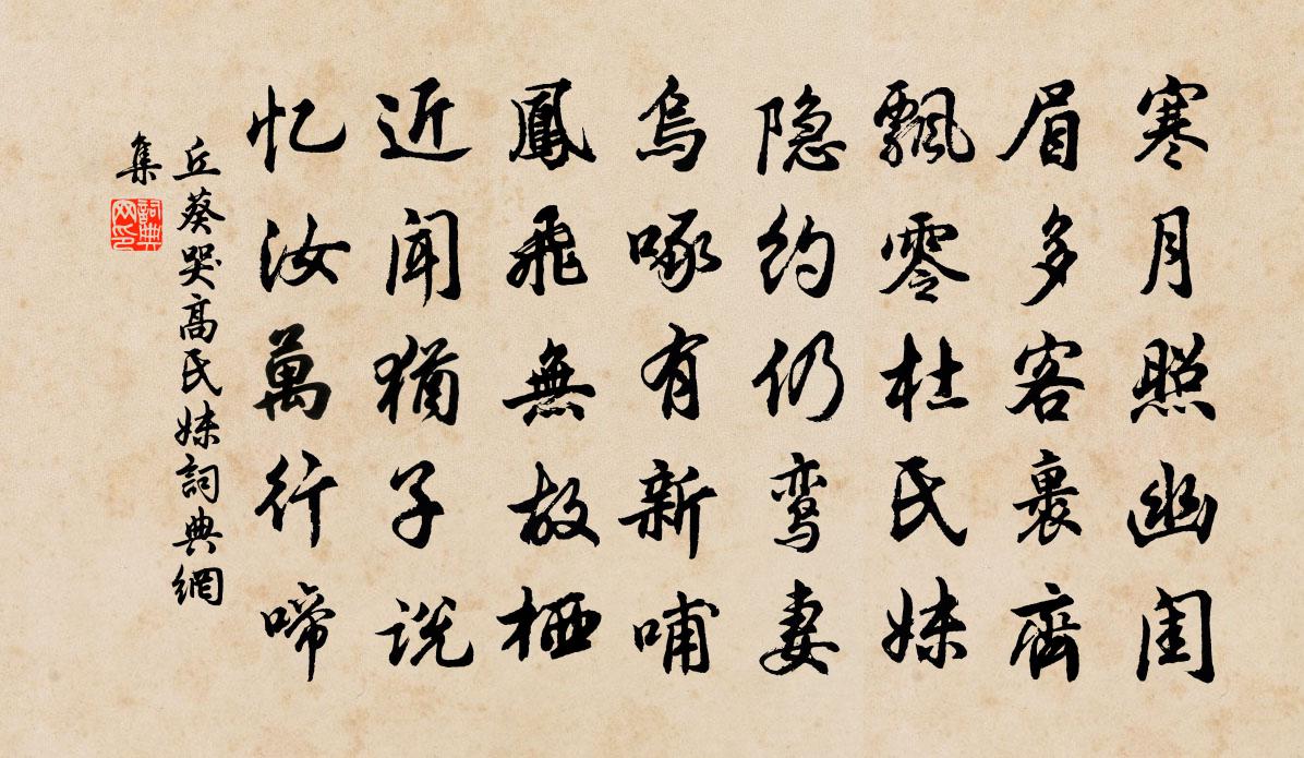 詩詞名句歷史字典書法欣賞書法字典國語詞典說文解字康熙字典古漢語字典標 題 作 者 詩 句 哭高氏妹作者:丘葵 朝代:宋代哭高氏妹原文寒月照幽閨,眉多客裹齊。飄零杜氏妹,隱約仍鸞妻。烏啄有新哺,鳳飛無故棲。近聞猶子說,憶汝萬行啼。詩詞問答問:哭高氏妹的作者是誰?答:丘葵問:哭高氏妹寫於哪個朝代?答:宋代丘葵哭高氏妹書法欣賞哭高氏妹書法作品詩詞推薦壽星泉喻良能〔宋代〕水邊豈無清江使,石上自有黃冠仙。更須喚取遼東鶴,便是人間不老泉。池陽醉歌贈匡廬處士姚岩傑顧雲〔唐代〕九華太守行春罷,高絳紅筵壓花榭。四面繁英拂檻開,帖雪團霞墜枝亞。空中焰若燒藍天,萬里滑靜無纖煙。弦索傷丘中丞劉禹錫〔唐代〕鄴下殺才子,蒼茫冤氣凝。枯楊映漳水,野火上西陵。馬鬣今無所,龍門昔共登。何人為弔客,唯是有青蠅。次韻學士兄春日謾成李彌遜〔宋代〕飄泊悲生事,人情翻手雲,習閒真似懶,補拙謾知勤。老作漁樵計,夢觀鐘鼎動。成虧皆一戲,不復問斯文。初夏六首方回〔宋代〕衰懶新詩少,芳菲急景過。來牟初餅餌,科斗已笙歌。獨幸閒扃戶,誰方遠荷戈。隔牆落金彈,但避勿誰何。江上逢許逸人趙嘏〔唐代〕是非處處生塵埃,惟君襟抱無嫌猜。收帆依雁湓浦宿,帶雨別僧衡岳回。芳樽稍駐落日唱,醉袖更拂長雲開。清秋臘月十四日雨陸游〔宋代〕歲晚深居嬾出遊,小窗終日寄悠悠。雨聲到枕助詩律,花氣襲衣生客愁。殘齒不堪添臲卼,瘦肩轉復覺颼飀。春前醜奴兒(壽詞)姚述堯〔宋代〕曉來佳氣穿簾幕,鬱鬱蔥蔥。寶鴨煙濃。戲采庭前玉樹叢。肌膚綽約真仙子,王母宮中。歡會曾同。笑問蟠桃幾度送葉秀才王初〔唐代〕快騎璁瓏刻玉羈,河梁返照上征衣。層冰春近蟠龍起,九澤雲閒獨鶴飛。行想北山清夢斷,重遊西洛故人稀。漢庭記夢許渾〔唐代〕曉入瑤台露氣清,座中唯有許飛瓊。塵心未盡俗緣在,十里下山空月明。聞雁施樞〔宋代〕飛盡沙田到水鄉,年年來往為誰忙。只貪月夜蘆花宿,不是將身傍稻粱。漫興 其四王冕〔元代〕壯心殊未已,望望盡黃沙。韋帽籠鴉鶻,氈囊載駱駝。過關南客少,出塞北風多。田牧俱荒廢,空懷馬伏波。春過趙墟劉言史〔唐代〕下馬邯鄲陌頭歇,寂寥崩隧臨車轍。古柏重生枝亦乾,餘燎見風幽焰滅。白蒿微發紫槿新,行人感此復悲春。虞美人呂本中〔宋代〕平生臭味如君少。自是君難老。似儂憔悴更誰知。只道心情、不似少年時。春風也到江南路。小檻花深處。對人不秋日田園雜興范成大〔宋代〕屋上添高一把茅,密泥房壁似僧寮。從教屋外陰風吼,臥聽籬頭響玉簫。上清宮鄭清之〔宋代〕雨余日腳到天涯,十里平山戴晚霞。疑是千虹蟠絳闕,頻移光景入仙家。登姑蘇台李嘯軒〔宋代〕規模高敞俯城池,未必斯台是故基。風月只招人感慨,江山不管國興衰。幾年勾踐仇思復,終日吳王醉不知。卻使句袁抗〔宋代〕壓江揖翠鎮庚方,一帶藍光屬豫章。去州三宿八公山宛然在望宋祁〔宋代〕山長如不去,三宿趁行舟。未必緣人意,祗能攪客愁。倦程方浩蕩,回首更夷猶。獨有相思恨,因之東北流。曉角方乾〔唐代〕畫角吹殘月,寒聲發戍樓。立霜嘶馬怨,攢磧泣兵愁。燕雁鳴雲畔,胡風冷草頭。罷聞三會後,天迥曉星流。名句推薦王者之宰民也,莫不同四海,一遠近, 為父母而子之。令狐德棻《周書·本紀·卷四》 黃霧漲天雪晦冥,黑雲拂地風膻腥沈約《昭君辭》 春眠不覺曉,處處聞啼鳥。孟浩然《春曉》 幾日喜春晴,幾夜愁春雨。高觀國《卜運算元·泛西湖坐間寅齋同賦》 野橋梅幾樹,並是白紛紛。洪升《雪望》 寂寂柴門村落里,也教插柳記年華。趙鼎《寒食》 待人寬一分是福,利人實利己的根基。洪應明《菜根譚·概論》 女為君子儒,無為小人儒。孔子弟子《論語·雍也篇》 紅豆不堪看,滿眼相思淚。牛希濟《生查子·新月曲如眉》 塞上長城空自許,鏡中衰鬢已先斑。陸游《書憤五首·其一》
