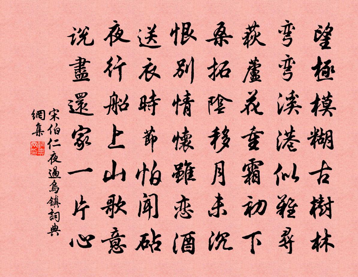 詩詞名句歷史字典書法欣賞書法字典國語詞典說文解字康熙字典古漢語字典標 題 作 者 詩 句 夜過烏鎮作者:宋伯仁 朝代:宋代夜過烏鎮原文望極模糊古樹林,彎彎溪港似難尋。荻蘆花重霜初下,桑拓陰移月未沉。恨別情懷雖戀酒,送衣時節怕聞砧。夜行船上山歌意,說盡還家一片心。詩詞問答問:夜過烏鎮的作者是誰?答:宋伯仁問:夜過烏鎮寫於哪個朝代?答:宋代宋伯仁夜過烏鎮書法欣賞夜過烏鎮書法作品詩詞推薦轉運少卿生日朱長文〔唐代〕昔在章聖朝,先君為名臣。入陪儒林老,出擁使者輪。忠漠與休烈,萬世永不泯。惜哉未大任,天意昌後人。公生逢雪宿芙蓉山主人劉長卿〔唐代〕日暮蒼山遠,天寒白屋貧。柴門聞犬吠,風雪夜歸人。送顧子敦赴河東三首黃庭堅〔宋代〕頭白書林二十年,印章今領晉山川。紫參可掘宜包貢,青鐵無多莫鑄錢。勸課農桑誠有道,折衝樽俎不臨邊。要知次韻任使君詠梅二首李新〔宋代〕平時化力與扶持,莫道春工未肯私。暗有浮香通淡月,瘦無寒葉到空枝。腹中太白何多錦,句下韋郎自不知。陰谷三月曲水宴得煙字王勃〔唐代〕彭澤官初去,河陽賦始傳。田園歸舊國,詩酒間長筵。列室窺丹洞,分樓瞰紫煙。縈迴亘津渡,出沒控郊鄽。鳳琴贈徐山人李洞〔唐代〕徐生何代降坤維,曾伴園公采紫芝。瓦礫變黃憂世換,髭鬚放白怕人疑。山房古竹粗於樹,海島靈童壽等龜。知嘆即事章甫〔宋代〕兩淮仍蜀道,群寇再侵尋。不戒兵猶火,唯夸旅若林。皇圖終復古,天意亦難諶。咨爾無猖獗,須思後患深。月夜江行 / 旅次江亭權德輿〔唐代〕扣舷不能寐,浩露清衣襟。彌傷孤舟夜,遠結萬里心。幽興惜瑤草,素懷寄鳴琴。三奏月初上,寂寥寒江深。祝君適中所所居南山岩花二種日玉梅日含笑者趙蕃〔宋代〕含笑初無巧笑容,未知名字復誰從。爾今顧有嫣然狀,不笑春風卻笑冬。春從天上來 至元六年庚辰元日立春,將為山宋褧〔元代〕許可用大參,陳景議憲副旭日暾暾。爛春餅堆盤,壽酒盈尊。玉帛交錯,襟佩翩翻。想像虎豹天門。靄蓬萊雲氣,次韻陳正之團扇畫一魚二首方回〔宋代〕莫想銀絲膾,冰盤一醉吞。好為玉帶佩,朝謁九重門。水調歌頭(中秋)劉褒〔宋代〕天淡四垂幕,雲細不成衣。西風掃盡繡翳,涼我鬢邊絲。破匣菱花飛動,跨海清光無際,草露滴明璣。杯到莫停手祝英台近向希尹〔宋代〕曉簾櫳,晴院宇,空鴨冷沉水。翠被欺寒,嬌困未忺起。厭厭兩點眉峰,一痕酒暈,正人在、溫柔鄉里。甚情味。鷓鴣天(次曾守游梅園韻)洪适〔宋代〕領客攜尊花底開。薄寒初送雨聲來。一聲未弄林間笛,幾片低飛閣下梅。酬的皪,少遲回。不妨春雪撒銀杯。玉肌恭題觀堂曹勛〔宋代〕松篁深靚隱新宮,十六清真位位同。笙鶴似臨三境上,佩環應下五雲中。煙霞頓隔塵寰路,道德追還太古風。固已燈下讀書陸游〔宋代〕少年喜書策,白首意未足。幽窗燈一點,樂處超五欲。而況黃州路,小雨漁村宿。蕭蕭蒹葭聲,為我洗暑毒。琅然奉和王世弼寄上七兄先生用其韻黃庭堅〔宋代〕宮槐弄黃黃,蓮葉綠婉婉。時同二三友,竹軒涼夏晚。駕言都城南,以望徵車返。何知苦淹回,及此秋景短。愁思和阻風潛江以詩禱神廖行之〔宋代〕江行幾日風打頭,江上客子添牢愁。人言水神喜作祟,客欲精禱姑維舟。平生結習口語業,篇詩敢告波神休。欣然奉和聖制送張說上集賢學士賜宴賦得蓮字趙冬曦〔唐代〕淺術方觀海,深恩忽見天。學開丹殿籍,名與石渠賢。良輔膺休命,微生謬采甄。春餘仍哢鳥,夏近未舒蓮。箋札金陵雜興二百首蘇泂〔宋代〕二月風和日暖時,淡黃楊柳一絲絲。向人無限隋唐意,猶是橋南楊柳枝。名句推薦步從容,立端正。揖深圓,拜恭敬。李毓秀《弟子規·謹》 江皋樓觀前朝寺,秋色入秦淮。徐再思《人月圓·甘露懷古》 荻花秋,瀟湘夜,橘洲佳景如屏畫。李珣《漁歌子·荻花秋》 曉風催我掛帆行,綠漲春蕪岸欲平。查慎行《曉過鴛湖》 風雨送人來,風雨留人住。游次公《卜運算元·風雨送人來》 百年成之不足,一旦壞之有餘。佚名《增廣賢文·上集》 突營射殺呼延將,獨領殘兵千騎歸。李白《從軍行》 蘭生幽谷,不為莫服而不芳。舟在江海,不為莫乘而不浮。君子行義,不為莫知而止休。劉安及其門客《淮南子·說山訓》 筆落驚風雨,詩成泣鬼神杜甫《寄李十二白二十韻》 芙蓉老秋霜,團扇羞網塵。李白《中山孺子妾歌》