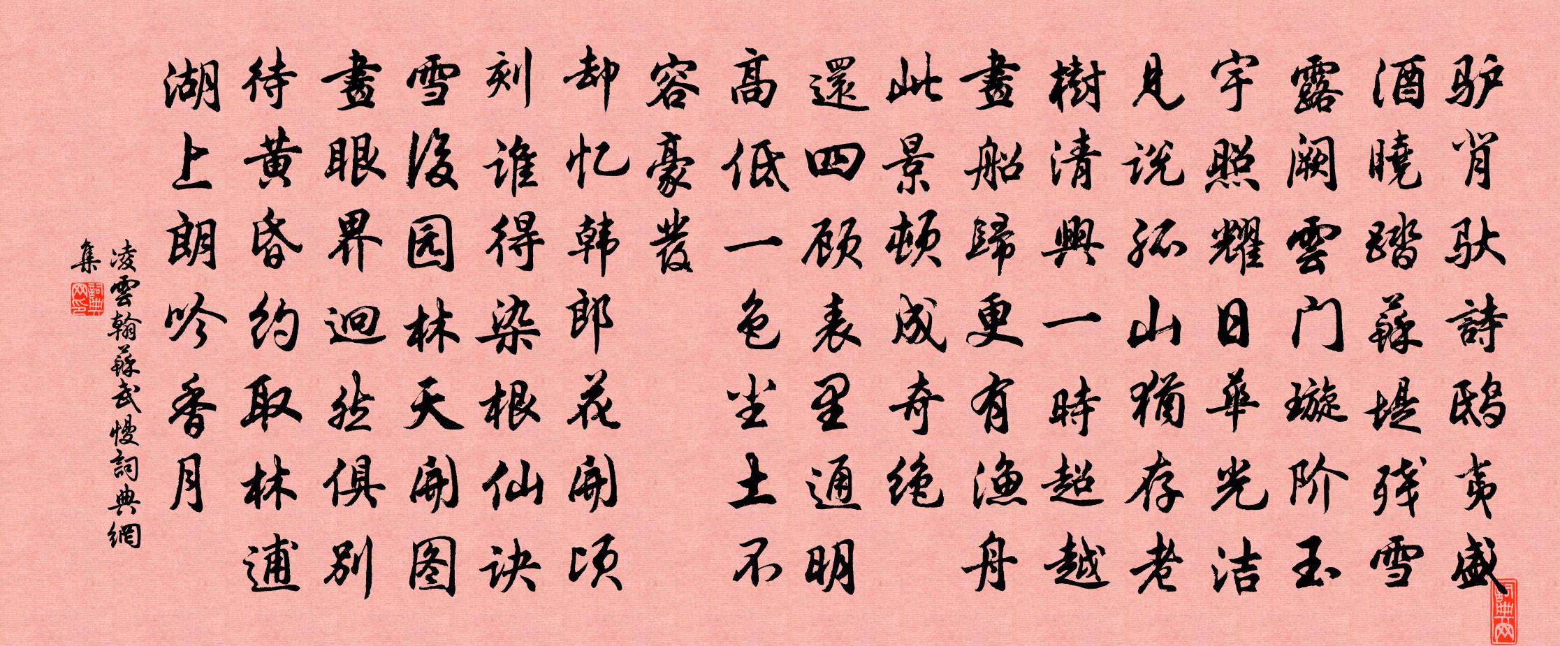 詩詞名句歷史字典書法欣賞書法字典國語詞典說文解字康熙字典古漢語字典標 題 作 者 詩 句 蘇武慢作者:凌雲翰 朝代:元代蘇武慢原文驢背馱詩,鴟夷盛酒,曉踏蘇堤殘雪。露闕雲門,璇階玉宇,照耀日華光潔。見說孤山,猶存老樹,清興一時超越。畫船歸、更有漁舟,此景頓成奇絕。還四顧、表里通明,高低一色,塵土不容豪發。卻憶韓郎,花開頃刻,誰得染根仙訣。雪後園林,天開圖畫,眼界迥然俱別。待黃昏、約取林逋,湖上朗吟香月。詩詞問答問:蘇武慢的作者是誰?答:凌雲翰問:蘇武慢寫於哪個朝代?答:元代問:蘇武慢是什麼體裁?答:詞凌雲翰蘇武慢書法欣賞蘇武慢書法作品詩詞推薦奉川道中四絕釋寶曇〔宋代〕千峰萬峰雲意動,十里五里溪聲喧。人在昏沉黑甜里,屋山烏鵲兩無言。和韓子云見寄四首吳芾〔宋代〕鬱郁愁懷不自傾,時時倒指勘歸程。情知歲月來無幾,心著湖山去未成。惡語豈能賡絕唱,故人聊欲話平生。頗思晚夏逢友人楊凝〔唐代〕一別同袍友,相思已十年。長安多在客,久病忽聞蟬。驟雨才沾地,陰雲不遍天。微涼堪話舊,移榻晚風前。劍客齊己〔唐代〕拔劍繞殘樽,歌終便出門。西風滿天雪,何處報人恩。勇死尋常事,輕讎不足論。翻嫌易水上,細碎動離魂。明月照高樓慢(中秋應制)万俟詠〔宋代〕平分素商。四垂翠幕,斜界銀潢。顥氣通建章。正煙澄練色,露洗水光。明映波融太液,影隨簾掛披香。樓觀壯麗傅岩叟見和用韻答之辛棄疾〔宋代〕萬里魚龍會有時,壯懷歌罷涕交頤。一毛未許楊朱拔,三戰空懷鮑叔知。明月夜光多白眼,高山流水自朱絲。塵埃落葉周端臣〔宋代〕燮燮霜經不自持,半隨流水半沾泥。歸巢便覺棲禽冷,覓穴空教返蟻迷。風徑學花飛上下,夜窗疑雨灑東西。滿階浣溪沙周密〔宋代〕不下竹簾怕燕瞋。旋移芳檻引流鶯。春光卻早又中分。杏火無煙然綠暗,梨雲如雪冷清明。冶遊天氣冶遊心。隆興書堂自警三十五首陳淳〔宋代〕人稟五行秀,卓然與物異。由其達大經,秉彝不容己。閨詞沈說〔宋代〕密幄香燒錦瑟橫,佳人半醉覺寒輕。忽思塞下新番曲,彈作黃蘆孤雁聲。陶穀題南唐官舍壁佚名〔唐代〕西川狗,百姓眼。馬包兒,御廚飯。出玉關來濟〔唐代〕斂轡遵龍漢,銜淒渡玉關。今日流沙外,垂涕念生還。送棋僧惟照文同〔宋代〕不成九章開方訣,誦得一行乘除詩。自然天性曉絕藝,可敵國手應吾師。窗前橫榻擁爐處,門外大雪壓屋時。獨翻二郎神吳潛〔宋代〕小樓向晚,正柳鎖、一城煙雨。記十里吳山,繡簾朱戶,曾學宮詞內舞。浪逐東風無人管,但脈脈、歲移年度。嗟臨江仙·送宇文德和被召赴行在所張元乾〔宋代〕露坐榕陰須痛飲,從渠疊鼓頻催。暮山新月兩徘徊。離愁秋水遠,醉眼曉帆開。泛宅浮家遊戲去,流行坎止忘懷。送古山人李覯〔宋代〕喜聞吉事怕聞凶,天下人心處處同。乍出山來言語拙,莫將刺字謁王公。以舊詩寄投謝昌國三首趙蕃〔宋代〕我有江西役,清江公所鄉。放舟頻下上,欲見苦參商。扁榜書皆到,流傳句必香。何當仍大嚼,鼎味也先嘗。送金卿歸新羅陶翰〔唐代〕奉義朝中國,殊恩及遠臣。鄉心遙渡海,客路再經春。落日誰同望,孤舟獨可親。拂波銜木鳥,偶宿泣珠人。禮樂雜感五首以不愛入州府為韻陸游〔宋代〕鷽鳩搶榆枋,枯魚過河泣;鵬鯤九萬里,此豈汝所及。丈夫志古人,絕世而獨立,遠遊馬蹄穿,高臥劍鋒澀。其初視澇陳剛中〔宋代〕暨陽古澤中,今歲仍大水。舟行民田中,一浪四十里。農夫相對泣,父子飢欲死。酷吏亦何主,誅求殊未已。豈繄名句推薦文武之政,布在方策。其人存,則其政舉;其人亡,則其政息。子思《中庸·第二十章》 莎衫筠笠。正是村村農務急。盧炳《減字木蘭花·莎衫筠笠》 東家頭白雙女兒,為解挑紋嫁不得。元稹《織婦詞》 好言難得,惡語易施。佚名《增廣賢文·上集》 桃花落,閒池閣。山盟雖在,錦書難托。陸游《釵頭鳳·紅酥手》 善惡同,則功臣倦。黃石公《三略·上略》 差之毫厘,失之千里。佚名《增廣賢文·上集》 一枝紅艷露凝香,雲雨巫山枉斷腸。李白《清平調·其二》 知是人家花落盡,菜畦今日蝶來多。高啟《春暮西園》 去年米貴闕軍食,今年米賤大傷農。杜甫《歲晏行》