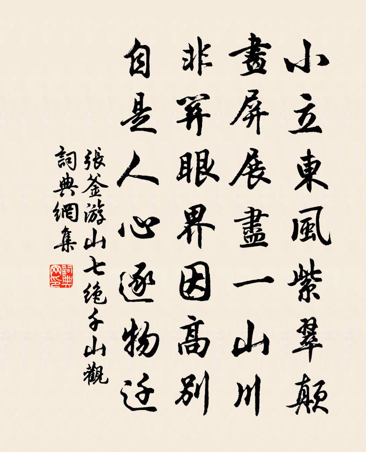 詩詞名句歷史字典書法欣賞書法字典國語詞典說文解字康熙字典古漢語字典標 題 作 者 詩 句 游山七絕千山觀作者:張釜 朝代:宋代游山七絕千山觀原文小立東風紫翠顛,畫屏展盡一山川。非關眼界因高別,自是人心逐物遷。詩詞問答問:游山七絕千山觀的作者是誰?答:張釜問:游山七絕千山觀寫於哪個朝代?答:宋代張釜游山七絕千山觀書法欣賞游山七絕千山觀書法作品詩詞推薦八景勝概卦尖望鼎方鳳〔宋代〕遙岑誰畫卦,置此荊山鼎。乍可奼女飛,千秋覘溟涬。和群貺幕秋四日登入石寺閣泛洛舟右泛舟司馬光〔宋代〕葉下宮槐老,雲飛洛浦秋。復陪元禮棹,卻望仲宣樓。曲岸迷頻轉,遙山碎不流。夷猶聊寓賞,浩蕩得忘憂。晨出山中晚興陸游〔宋代〕薄酒亦陶然,偃蹇澗石側。巾墮拄杖橫,意象頗自得。青山受落日,忽作玻璃色。躊躇不忍去,下磴天已黑。水西館泛舟送王員外獨孤及〔唐代〕單醪敢獻酢,曲沼荷經過。泛覽親魚鳥,夤緣涉芰荷。劇談增惠愛,美景借清和。明日汀洲草,依依奈別何。柘溪道中釋文珦〔宋代〕荒煙迷小市,細雨隔遙津。麥浪農疇晚,桐花客路春。幾番時序換,兩鬢雪霜新。唯有溪邊鷺,相看似故人。帆徐夤〔唐代〕豈勞孤棹送行舟,輕過天涯勢未休。斷岸曉看殘月掛,遠灣寒背夕陽收。川平直可追飛箭,風健還能溯急流。幸遇七兄以庚戌重陽前解江東常平印泝江而歸先寄周必大〔宋代〕早日常同席,中間屢話離。呂梁今破夢,曹發共深期。菊圃新開徑,茅齋正築基。不妨風雨夜,酌酒更論詩。哭戴敬夫劉城〔清代〕青山來此赴,白日欲成陰。已痛故人絕,更傷節士心。衣冠猶就殮,宗祏不俱沉。洞腹逃禪事,千秋名自今。奉和張僕射朝天行權德輿〔唐代〕元侯重寄貞師律,三郡四封今靜謐。丹轂常思闕下來,紫泥忽自天中出。軍裝喜氣倍趨程,千騎鳴珂入鳳城。周王舅氏自壽陽由京師歸安陸宋祁〔宋代〕道舊欣來駕,銷魂遽遠離。顛毛同白日,俗眼暫青時。客飯稽留數,齋醪酪酊遲。風波須畏險,老大共餘悲。楚莽莊鵾辭海鄭獬〔宋代〕歸路漸驚紅葉老,舊山已落白雲深。莊鵾聊欲辭滄海,越鳥終須憶故林。送人謁柳開釋正緣〔宋代〕柳牆高於花,怒飛方可至。奇哉游夏徒,吐辭作雄翅。送劉前豀李新〔宋代〕耀靈浴虞淵,光屬朝夕池。氤氳滿寰宇,幽草無閒枝。岷山玉嶺花,寸根武陵西。寒搖塞北霜,疏影何葳蕤。春意秋日二首李世民〔唐代〕菊散金風起,荷疏玉露圓。將秋數行雁,離夏幾林蟬。雲凝愁半嶺,霞碎纈高天。還似成都望,直見峨眉前。爽氣題宿雲軒王之道〔宋代〕朝來怯秋霜,生撇瓮里清。我老顏已衰,一杯聊發赬。村龍怪我醉,忽吠三二聲。蜀月不可見,宿雲有新行。念奴嬌程公許〔宋代〕曉涼散策,恨西風不貸,一池殘綠。誰與冰輪撝玉斧,恰好今宵圓足。樹杪翻光,莎庭轉影,零亂昆台玉。盪胸清一日曲梅堯臣〔宋代〕妾家鄧侯國,肯愧邯鄲姝。世本富繒綺,嬌愛比明珠。十五學組紃,未嘗開戶樞。十六失所適,姓名傾里閭。十七漢宮春·會稽蓬萊閣懷古辛棄疾〔宋代〕秦望山頭,看亂雲急雨,倒立江湖。不如雲者為雨,雨者云乎。長空萬里,被西風、變滅須臾。回首聽,月明天籟和姚令威春陰四絕王之望〔宋代〕休對風光感物華,且將春酒趁春賒。一聲杜宇芳菲晚,只有荼蘼芍藥花。初冬雜題陸游〔宋代〕勳業文章意已闌,暮年不足是看山。江南寺寺樓堪倚,安得身如杜牧閒!名句推薦問弄雪飄枝,無雙亭上,何日重遊。鄭覺齊《揚州慢·瓊花》 借問酒家何處有?牧童遙指杏花村。杜牧《清明》 侵陵雪色還萱草,漏泄春光有柳條。杜甫《臘日》 輕解羅裳,獨上蘭舟。李清照《一剪梅·紅藕香殘玉簟秋》 守分安命,順時聽天。朱柏廬《朱子家訓·全文》 雖死之日,猶生之年陳壽《三國志·吳書·吳主五子傳》 閉門覓句陳無己,對客揮毫秦少游。黃庭堅《病起荊江亭即事》 人有不為也,而後可以有為。孟子《孟子·離婁章句下·第八節》 風雨淒淒,雞鳴喈喈。佚名《風雨》 馬蹄濃露,雞聲淡月,寂歷荒村路。張榘《青玉案·被檄出郊題陳氏山居》