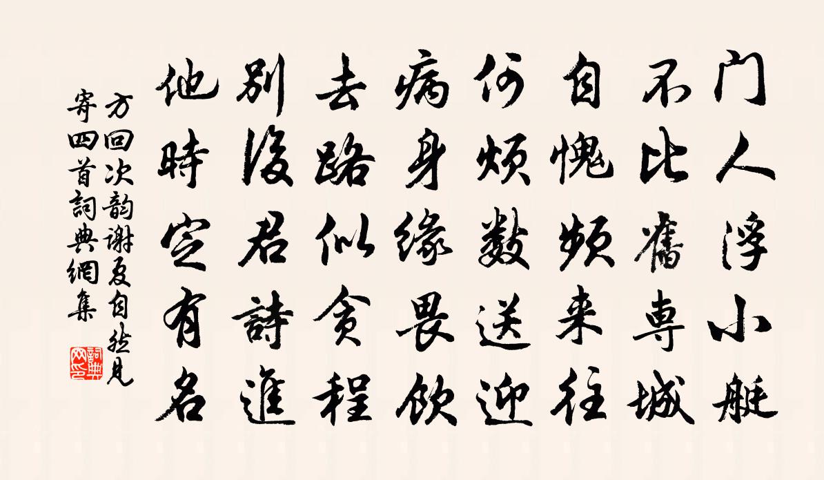 詩詞名句歷史字典書法欣賞書法字典國語詞典說文解字康熙字典古漢語字典標 題 作 者 詩 句 次韻謝夏自然見寄四首作者:方回 朝代:宋代次韻謝夏自然見寄四首原文門人浮小艇,不比舊專城。自愧頻來往,何煩數送迎。病身緣畏飲,去路似貪程。別後君詩進,他時定有名。詩詞問答問:次韻謝夏自然見寄四首的作者是誰?答:方回問:次韻謝夏自然見寄四首寫於哪個朝代?答:宋代方回次韻謝夏自然見寄四首書法欣賞次韻謝夏自然見寄四首書法作品詩詞推薦沁園春 除夕二首元好問〔金代〕腐朽神奇,夢幻吞侵,朝昏變遷。悵殘燈舊歲,雞聲競早,春風歸興,雁影相先。南渡崩奔,東屯留滯,世事悠悠夏日浮舟過陳大水亭 / 浮舟過滕逸人別業孟浩然〔唐代〕水亭涼氣多,閒棹晚來過。澗影見松竹,潭香聞芰荷。野童扶醉舞,山鳥助酣歌。幽賞未雲遍,煙光奈夕何。客杭思李常伯滿粹翁及衡父子權因寄此王令〔宋代〕始予既迂疏,城郭非所樂。聞吳富山水,思往頗計校。脫身東南來,見實與聞效。吳之山稜棱,吳水清不撓。豈無次韻楊明叔見餞十首黃庭堅〔宋代〕虛心觀萬物,險易極變態。皮毛剝落盡,惟有真實在。侍中乃珥貂,御史則冠豸。照影或可羞,短蓑釣寒瀨。與諾侍者釋正覺〔宋代〕夢回茶碗手親扶,雅意溈山轉道樞。自喚主人酬一諾,誰違尊者應三呼。死生到日還能否,辜負當年是有無。妙得樂道未長句輒次韻韓維〔宋代〕雪意凝還解,冰紋結復開。林鴉時嘯侶,城雉不憂媒。造適心無礙,忘機語絕猜。曹溪不欺我,何處有塵埃。山村經行因施藥陸游〔宋代〕兒扶一老侯溪邊,來告頭風久未痊。不用更求芎芷輩,吾詩讀罷自醒然。峽山寺竹枝詞五首楊萬里〔宋代〕龜魚到此總回頭,不但龜魚蟹亦愁。底事詩人輕老命,犯灘沖石去韶州。冬日雜興六首張耒〔宋代〕小園晴自掃,曝日坐前軒。野鼠穿山葉,寒烏啄草根。短籬藩隙地,別逕入孤村。幽趣供岑寂,淹留不復論。架壁許志仁〔宋代〕架壁珍藏萬古書,世間清絕在吾廬。綠瓶香破分家釀,曲圃雲開翦露蔬。白日漸隨秋意短,故人盡向老來疏。今年洞仙歌(丁未壽朱元晦)陳亮〔宋代〕秋容一洗,不受凡塵涴。許大乾坤這回大。向上頭,些子是鵰鶚摶空,籬底下,只有黃花幾朵。騎鯨汗慢,那得人贈王子和吳則禮〔宋代〕二年紫塞頭,日日思都梁。歸來向清淮,白魚初飽霜。走馬脫轡頭,搴旗向沙場。不如把蟹螯,欹帽呼酒觴。要聽次韻簽判丈喜雪二首趙蕃〔宋代〕雲蔽初疑雨,雲開復似晴。北風何自起,南雪驟能成。沴氣應無作,東郊看有耕。怨咨懷往咎,歡喜見今情。道傍得熟人家曹彥約〔宋代〕舊雨留煙飾短垣,淺沙催水撼衡門。旗簾動眼新迎客,{禾罷}稏關心故弄孫。游柏谷寺寄范君武李復〔宋代〕絕塞初歸喜浣休,東城送客偶成游。山前欲訪青蘭若,林下初聞黃鷅鶹。雙屨高窮溪水出,一身輕共野雲浮。寄聲答李邦直蘇軾〔宋代〕美人如春風,著物物未知。羈愁似冰雪,見子先流澌。子從徐方來,吏民舉熙熙。扶病出見之,驚我一何衰。知我胡山人歸王屋,因有贈張籍〔唐代〕轉轉無成到白頭,人間舉眼盡堪愁。此生已是蹉跎去,每事應從鹵莽休。雖作閒官少拘束,難逢勝景可淹留。君歸挽張主簿李流謙〔宋代〕嘗聞種德如種木,百年培壅猶不足。君看牛羊踐履行,豈有寸椽撐破屋。我方撮發訪耆舊,已妝定國多陰德。昆峰溪亭宋祁〔宋代〕規日平空晚,澄波極望鮮。簾飛古陶瓦,梁負會稽椽。戰綠低寒杜,漂紅泊晚蓮。黃昏無限意,江月對娟娟。讀崇禎辛未後十餘年事蕭正模〔清代〕心匪不仁計則窮,減夫派餉事重重。 可憐三百年天下,斷送憂勤惕厲中。 名句推薦錦里開芳宴,蘭缸艷早年。盧照鄰《十五夜觀燈》 砧杵敲殘深巷月,井梧搖落故園秋。陸游《秋思》 撫我則後,虐我則仇。佚名《尚書·周書·泰誓》 誠者,天之道也。誠之者,人之道也。誠者,不勉而中不思而得:從容中道,聖人也。誠之者,擇善而固執之者也子思《中庸·第二十章》 若到江南趕上春,千萬和春住。王觀《卜運算元·送鮑浩然之浙東》 荊吳相接水為鄉,君去春江正淼茫。孟浩然《送杜十四之江南 / 送杜晃進士之東吳》 花開堪折直須折,莫待無花空折枝。杜秋娘《金縷衣》 竹里繰絲挑網車,青蟬獨噪日光斜。李賀《南園十三首》 秋江帶雨,寒沙縈水,人瞰畫閣愁獨。史達祖《八歸·秋江帶雨》 士有妒友,則賢交不親;君有妒臣,則賢人不至。荀子《荀子·大略》