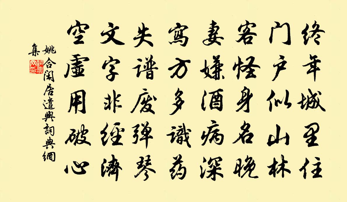 詩詞名句歷史字典書法欣賞書法字典國語詞典說文解字康熙字典古漢語字典標 題 作 者 詩 句 閒居遣興作者:姚合 朝代:唐代閒居遣興原文終年城裡住,門戶似山林。客怪身名晚,妻嫌酒病深。寫方多識藥,失譜廢彈琴。文字非經濟,空虛用破心。詩詞問答問:閒居遣興的作者是誰?答:姚合問:閒居遣興寫於哪個朝代?答:唐代問:閒居遣興是什麼體裁?答:五律姚合閒居遣興書法欣賞閒居遣興書法作品注釋全唐詩:卷498-8詩詞推薦點絳唇(汪汝馮置酒請賦芍藥)曾協〔宋代〕亂疊香羅,玉纖微把燕支污。靚妝無數。十里揚州路。怨綠啼紅,總道春歸去。君知否。畫闌幽處。留得韶光住。紀行雜詩李洪〔宋代〕石罅飛泉鳴佩玉,灘頭怒石響驚雷。故人相見應相笑,愛底微官觸暑來。明日重九亦以病不赴述古會再用前韻蘇軾〔宋代〕月入秋帷病枕涼,霜飛夜簟故衾香。可憐吹帽狂司馬,空對親舂老孟光。不作雍容傾座上,翻成骯髒倚門旁。人間贈妓兜娘張先〔宋代〕十載芳洲撫白苹,移舟弄水賞青春。當時自倚青春力,不信東風解誤人。早行鳴山二首楊萬里〔宋代〕雲山未見見龜山,且卷詩書子細看。春日幸從年後暖,春風須帶臘前寒。花庵詩寄邵堯夫司馬光〔宋代〕洛陽四時常有花,雨晴顏色秋更好。誰能相與共此樂,坐對年華不知老。恭謝慶成詩十闋武衍〔宋代〕宮前儀衛尚般還,花里聲傳午漏殘。見說御園才放水,聖心游泳正觀瀾。三日兄弟侍老人展墓歸和尊韻洪咨夔〔宋代〕雲淡風柔霽色輕,瀧岡阡上氣和明。莫思舊日遨頭出,且試新年便面行。飽飯即為君子泰,濁醪不失聖人清。一翁過蔣學正三徑庵史才〔宋代〕紛紛處世羨鳴珂,君隱考盤詩獨喔。三徑早知皆坦路,一庵聊復障頹波。田園無悔歸家晚,松柏存看繞舍多。笑我夏日陪提刑彭學士登周襄王故城梅堯臣〔宋代〕聊隨漢使者,一上周王城。片雨北郊晦,殘陽西嶺明。野禽呼自別,香草問無名。誰復黍訥詠,但興箕潁情。行春辭九首白玉蟾〔宋代〕一斗百篇誠有之,無人知我只春知。吟逢蝴蝶即莊子,醉見海棠真貴妃。送徐正時之官贛州四首曹勛〔宋代〕君方贛水赴除書,百舵橫江信所扶。他日雁山新雁到,問先曾這赤城無。病中遣懷陸游〔宋代〕菘芥煮羹甘勝蜜,稻粱炊飯滑如珠。上方香積寧過此?慚愧天公養病夫。西江月(三)張伯端〔宋代〕我性入諸佛性,諸方佛性皆然。亭亭蟾影照寒泉。一月千潭普現。小則毫分莫識,大時遍滿三千。高低不約信方圓寄石溪何文季〔宋代〕龐老多年不入州,一竿危坐石溪頭。山中飽食魚羹飯,不博人間萬戶侯。題蔡君謨墨跡後李廌〔宋代〕古人托一技,身死名不滅。賢愚置不論,筆畫觀可閱。嶧山刻秦銘,斯篆屈金鐵。雖在眾憎惡,恨不頸薦鉞。褚令雪中答僧書熊孺登〔唐代〕八行銀字非常草,六出天花儘是梅。無所與陳童子別,雪中辛苦遠山來。送石都官赴闕黃庶〔宋代〕為郎四十者,堂有二親稀。止爺官為養,行應淚在衣。白雲偏佇立,黃犬好頻歸。去有山公啟,天心正似飢。金陵雜興二百首蘇泂〔宋代〕憶殺仙人白仲都,江邊遺蹟尚樓居。驂鸞翳鳳如容我,拜作先師定肯無。游洞霄宮潘良正〔宋代〕百壇風冷露華凝,群玉崢嶸族畫屏。水赤久傳丹作井,山高時借翠為庭。鶴迎仙馭迷三島,雲入洞天朝百靈。回首名句推薦國亡身殞今何有,只留離騷在世間。張耒《和端午》 飢不擇食,寒不擇衣,慌不擇路,貧不擇妻。施耐庵《水滸傳·第三回》 詩家清景在新春,綠柳才黃半未勻。楊巨源《城東早春》 罔游於逸,罔淫于樂。佚名《尚書·虞書·大禹謨》 離情被橫笛,吹過亂山東。王安石《江上》 黃葉仍風雨,青樓自管弦。李商隱《風雨》 晴風初破凍,柳眼梅腮,已覺春心動。李清照《蝶戀花·暖雨晴風初破凍》 老翁逾牆走,老婦出門看。杜甫《石壕吏》 我欲乘槎,直窮銀漢,問津深入。許有壬《水龍吟·過黃河》 數點雨聲風約住,朦朧淡月雲來去李冠《蝶戀花·春暮》