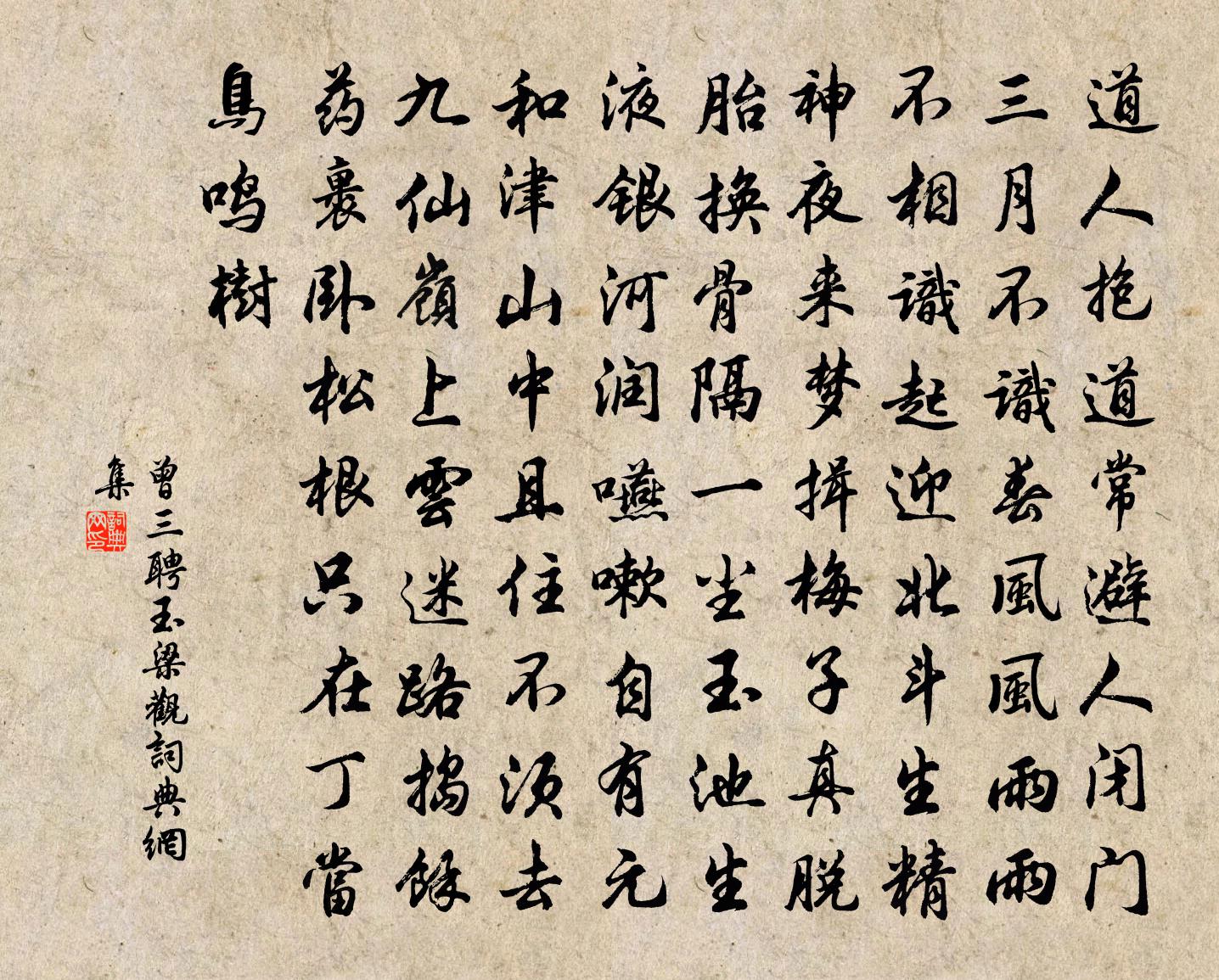 詩詞名句歷史字典書法欣賞書法字典國語詞典說文解字康熙字典古漢語字典標 題 作 者 詩 句 玉梁觀作者:曾三聘 朝代:宋代玉梁觀原文道人抱道常避人,閉門三月不識春。風風雨雨不相識,起迎北斗生精神。夜來夢揖梅子真,脫胎換骨隔一塵。玉池生液銀河潤。嚥嗽自有元和津。山中且住不須去,九仙嶺上雲迷路。搗余藥裹臥松根,只在丁當鳥鳴樹。詩詞問答問:玉梁觀的作者是誰?答:曾三聘問:玉梁觀寫於哪個朝代?答:宋代曾三聘玉梁觀書法欣賞玉梁觀書法作品詩詞推薦和黃山谷龜殼詩韻二首易祓〔宋代〕一枝自足鷦鷯巢,一居猶勝蝸牛屋。道人身外本無求,況有龜軒可棲宿。南坡口號十八首鄭清之〔宋代〕管弦不礙登山屐,梁肉何妨滿腹書。豈是清談愧夷甫,為無阿堵繞吾廬。送潘恭叔提乾往潭州省侍釋寶曇〔宋代〕父子湖海心,歲月易波盪。長沙固艱難,不在九天上。風塵護衣篝,花柳謝屏障。車行無多乘,雷動有餘壯。閬風送王齊卿教授造朝袁說友〔宋代〕江淨孤月寒,山空野梅白。我是天涯人,卻送東行客。送君直上蓬山首,莫忘西南困征取。功名富貴不須多,只把昭君行洪咨夔〔宋代〕紅嫣翠濕平陽里,轤轆游車汛流水。蒼頭擁騎知謂誰,草草人家寄生子。君王神武重邊功,不愛稼華勝桃李。青鸞詠史詩烏江胡曾〔唐代〕爭帝圖王勢已傾,八千兵散楚歌聲。烏江不是無船渡,恥向東吳再起兵。挽何司令二首李曾伯〔宋代〕太學何蕃譽,當時藹帝鄉。五聯棣華萼,三折桂枝香。司社騰聲望,題輿迓寵光。奇才今已矣,流慶在虹梁。古別離張玉孃〔宋代〕永夜無人玉漏遲,圃圃月上海棠枝。月留涼露芳塵暗,花弄清暉淑影移。粉黛三千春對鏡,銀波萬頃曉凝脂。深閨虞美人(次韻葉少蘊懷隱庵作)李彌遜〔宋代〕方壺小有人誰到。底事春知早。使君和氣粲如花。更築百花深處、駐春華。雲關遠枕苕溪淺。未放歸懷展。看殘紅小山游翠峰寺攜枕席宿僧堂僧甚多而不與人相衛涇〔宋代〕痴坐禪關日亭午,靜看博山香一縷。欲知世上炎與涼,三扣金仙三不語。使牛子曹冠〔宋代〕晚天雨霽橫雌霓。簾卷一軒月色。紋簟坐苔茵,乘興高歌飲瓊液。翠瓜冷浸冰壺碧。茶罷風生兩腋。四座沸歡聲,李行中秀才醉眠亭三首蘇軾〔宋代〕孝先風味也堪憐,肯為周公晝日眠。枕麴先生猶笑汝,枉將空腹貯遺編。朝中措(為人壽)辛棄疾〔宋代〕年年金蕊艷西風。人與菊花同。霜鬢經春重綠,仙姿不飲長紅。焚香度日盡從容。笑語調兒童。一歲一杯為壽,從黃澄伯下第以詩來訪次韻陶夢桂〔宋代〕平塘水外竹三畝,古木陰中屋數間。天幸諸賢皆大用,分甘少病比長閒。百年世事皆前定,一枕清負無後艱。多謝臨泛東湖(時任洪州)張九齡〔唐代〕郡庭日休暇,湖曲邀勝踐。樂職在中和,靈心挹上善。乘流坐清曠,舉目眺悠緬。林與西山重,雲因北風卷。晶明敘十五日事張耒〔宋代〕五更聞鍾自驚起,坐守殘燈具冠履。昏昏睡眼正團花,獨愛當庭月如水。強驅睡味誰不仁,漠漠黑甜留兩眥。忽驚頌古釋道顏〔宋代〕有句無句藤倚樹,元來白飯用米飯。高樓吹笛柳如煙,滿地春風落飛絮。秋懷十首張耒〔宋代〕歲暮無所為,官門聊飲酒。家貧乏餚果,擷蔬不盈手。要歸一醉爾,寧復計薄厚。頹然几案間,樗散忘宇宙。古來姑惡邵定〔宋代〕姑惡,姑惡。姑不惡,新婦惡。不聞姑聲罵婦錯,但聞婦聲數姑虐。汝夫汝夫汝所嚴,汝姑又知天之天。高高在上答王立之惠書潘大臨〔宋代〕歸自江南即定居,漫勞新友問何如。剛腸肯為藜羹轉,病骨聊憑竹杖扶。南圃土腴千樹橘,東湖春水百金魚。明年名句推薦如是滅度無量無數無邊眾生。實無眾生得滅度者。鳩摩羅什譯《金剛經·大乘正宗》 犬吠水聲中,桃花帶露濃。李白《訪戴天山道士不遇》 酒濃春入夢,窗破月尋人。毛滂《臨江仙·都城元夕》 紛紛暮雪下轅門,風掣紅旗凍不翻。岑參《白雪歌送武判官歸京》 歌沉玉樹,古寺空有疏鍾發。李綱《六么令·次韻和賀方回金陵懷古鄱陽席上作》 黃河捧土尚可塞,北風雨雪恨難裁。李白《北風行》 寧做太平犬,莫做離亂人!佚名《增廣賢文·下集》 天南地北雙飛客,老翅幾回寒暑。元好問《摸魚兒·雁丘詞 / 邁陂塘》 大道之行也,天下為公。戴聖《禮記·禮運》 鶯花猶怕春光老,豈可教人枉度春?佚名《增廣賢文·上集》