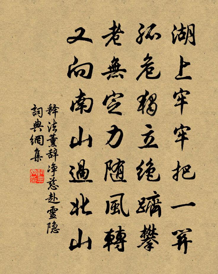 詩詞名句歷史字典書法欣賞書法字典國語詞典說文解字康熙字典古漢語字典標 題 作 者 詩 句 辭淨慈赴靈隱作者:釋法薰 朝代:宋代辭淨慈赴靈隱原文湖上牢牢把一關,孤危獨立絕躋攀。老無定力隨風轉,又向南山過北山。詩詞問答問:辭淨慈赴靈隱的作者是誰?答:釋法薰問:辭淨慈赴靈隱寫於哪個朝代?答:宋代釋法薰辭淨慈赴靈隱書法欣賞辭淨慈赴靈隱書法作品詩詞推薦桂林送人之瓊州招捕海寇樂雷發〔宋代〕訾家洲畔路,別爾苦匆匆。說劍令人喜,耽吟與我同。旌旗楓鬼雨,舟楫鱟簰風。想到瓊峰頂,題詩更紀功。對酒次韻寄懷元翁黃庭堅〔宋代〕花光漸寒食,木燧催國火。沽酒鳥勸人,懷賢吾忘我。事往墮甑休,心知求田可。可人不在眼,樽俎思促坐。有生寄題喻叔奇國傅郎中園亭二十六詠磬湖楊萬里〔宋代〕洞庭張樂起天風,玉磬吹來隨圃中。卻被仙人熔作水,為君到底寫秋空。史院書懷陸游〔宋代〕後死與斯文,猶能讀典墳。雖慚千載事,要是一生勤。石磑霏霏雪,銅爐裊裊雲。扶衰又秋晚,何以報吾君?夜歸陸游〔宋代〕今年寒到江鄉早,未及中秋見雁飛。八十老翁頑似鐵,三更風雨采菱歸。陪憲使登榕溪閣蔡戡〔宋代〕歸途重約使軺臨,為愛榕溪十畝陰。俯瞰江流青一帶,坐看山色碧千尋。共拼沉醉酬佳節,暫駐斜暉縱賞心。因念戰掉醜奴兒 本名添字醜奴兒 紫極宮加持,馬鈺〔元代〕萊州道眾修黃,各各虔誠。無不專精。邀我加持默念經。救亡靈。奈何鄰舍屠魁劊,不顧前程。宰殺為生。豬痛妻滿月日相唁元稹〔唐代〕十月辛勤一月悲,今朝相見淚淋漓。狂風落盡莫惆悵,猶勝因花壓折枝。漁父張舜民〔宋代〕家住耒江邊,門前碧水連。小舟勝養馬,大罟當耕田。保甲元無籍,青苗不著錢。桃源在何處,此地有神仙。呈王山父劉過〔宋代〕疏煙淡淡樹重重,略得西南有路通。鍾板不鳴山寺靜,閉門人在月明中。對菊有懷東園陳起〔宋代〕青女凌波楚江冷,庭前一葉鳴金井。砧杵誰家試袷衣,西風攪碎蘆花影。呼童折取籬下金,旋汲山泉注古瓶。細喔中秋前二夕釣雪舟中靜坐二首楊萬里〔宋代〕去歲中秋政病餘,愛他月色強支吾。今年老矣差無病,後夜中秋有月無?夏杪陳師道〔宋代〕一室青蕪長,終朝靜不嘩。聖賢開美酒,子母破新瓜。綠筱初翻籜,紅蕖稍薦花。咄嗟功業晚,覽照鬢初華。九鎖山十詠王易簡〔宋代〕蕭灑殊庭西,玉室青孱顏。華陽隱邃道,元蓋浮塵寰。紞紞天鼓鳴,爛爛岩屋斑。誰懸隔凡石,此已非人間。群仙和居厚弟一首劉克莊〔宋代〕處處笙歌雜誦謠,盍簪一笑共今宵。宛然上齒尊三老,非若班廷序百僚。鄉飲詎宜先仗出,虞人不必以弓招。明時同莊秀才宿鎮星觀馬戴〔唐代〕的的星河落,沾苔復灑松。濕光微泛草,石翠澹搖峰。野觀雲和月,秋城漏間鍾。知君親此境,九陌少相逢。遣懷陸游〔宋代〕山澤荒寒外,門庭寂寞中。厭聞鳩喚雨,常羨鵲知風。逆境嗟行遍,閒愁幸掃空。今晨有奇事,簫鼓賽年豐。故舊相送出城門薛居寶〔宋代〕策馬國門南,行投感時節。唧唧寒螿亂,皎皎層戀潔。修途遵廣川,衰林夕陽滅。含情不忍語,眷舊詎忍別。抱疴和國信張宗益少卿過潭州朝拜信武殿蘇頌〔宋代〕夷裔陵邊久,文明運算高。三冬馳日御,一夜隕星旄。從此通戎賂,於今襲戰袍。威靈贍廟像,列侍寫賢豪。民獲將歸新城鄉舍邀賦詩贈行廖行之〔宋代〕請君吟詩送我歸,我歸雖作半月期。馬頭黃埃且百里,村店白酒占雙旗。只今柳絲東城路,萬縷方作青青垂。歸來名句推薦風老鶯雛,雨肥梅子,午陰嘉樹清圓。周邦彥《滿庭芳·夏日溧水無想山作》 道可道,非常道;名可名,非常名。劉安及其門客《淮南子·道應訓》 水色淥且明,令人思鏡湖。李白《登單父陶少府半月台》 夔府孤城落日斜,每依北斗望京華。杜甫《秋興八首》 城邊有古樹,日夕連秋聲。李白《沙丘城下寄杜甫》 聽元宵,往歲喧譁,歌也千家,舞也千家。王磐《古蟾宮·元宵》 客行野田間,比屋皆閉戶。姚合《莊居野行》 五更鐘動笙歌散,十里月明燈火稀。賀鑄《思越人·紫府東風放夜時》 紫黯紅愁無緒,日暮春歸甚處?龔自珍《如夢令·紫黯紅愁無緒》 功名炊黍尋常夢,怪事書空感激人。王遜《西夏重陽》