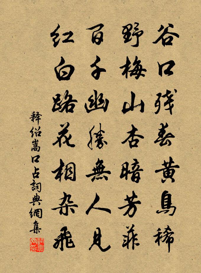 詩詞名句歷史字典書法欣賞書法字典國語詞典說文解字康熙字典古漢語字典標 題 作 者 詩 句 口占作者:釋紹嵩 朝代:宋代口占原文谷口殘春黃鳥稀,野梅山杏暗芳菲。百千幽勝無人見,紅白路花相雜飛。詩詞問答問:口占的作者是誰?答:釋紹嵩問:口占寫於哪個朝代?答:宋代釋紹嵩口占書法欣賞口占書法作品詩詞推薦送胡臣秀才梅堯臣〔宋代〕汴水日夜淺,歸船不可留。天高雲就嶺,地冷雁回洲。江館魚堪食,家林橘已收。平生素業在,莫見里人羞。題花光梅十首五葉聯芳王柏〔宋代〕裁冰鏤雪幾多工,次第開時個個同。夜半傳香來庾嶺,至今拈起作家風。章獻明肅皇太后恭謝太廟佚名〔宋代〕乃祖齊聖,綿瓞其昌。源流濬邈,統毫悠長。如聞肅優,有飶聲香。監觀垂祐,萬葉儲祥。大衍易吟四十首方回〔宋代〕謙卑六位得,豫樂四爻非。莊敬與安肆,冥冥禍福幾。見上林春雁翔青雲,寄楊起居、李員外錢起〔唐代〕上林春更好,賓雁不知歸。顧影憐青籞,傳聲入紫微。夜陪池鷺宿,朝出苑花飛。寧憶寒鄉侶,鸞凰一見稀。歲旦立春張鎡〔宋代〕天心歷數本相同,何事偏窺造化功。蒼震欲承乾健力,歲端春肇一時中。一題白馬館王珪〔唐代〕白馬芒原非路岐,征夫示起雪侵肌。雁思水國猶南翥,人在冰天更北馳。狂吹欲號沙四作,凍雲無賴日西垂。平生臨江仙黃人傑〔宋代〕秋色三分繞過二,江城又近重陽。翠蓂雙莢為誰芳。梅仙生此日,神物自呈祥。陶菊半黃萸斗紫,一時來共飛觴。題草蟲扇二首陳造〔宋代〕捩首一振怒臂,鼓翅雙搖利鋒。底用交綏解鬧,政應沐我仁風。送僧歸護國寺王化基〔宋代〕振錫詣華京,頻頻答龍靈。玉階前見佛,金口內開經。論道窮幽賾,深玄極杳冥。褒崇恩爛熳,教化語丁寧。傳和新秋夜寄江右友人戴叔倫〔唐代〕遙夜獨不寐,寂寥蓬戶中。河明五陵上,月滿九門東。舊知親友散,故園江海空。懷歸正南望,此夕起秋風。永遇樂·探梅次時齋韻吳文英〔宋代〕閣雪雲低,卷沙風急,驚雁失序。戶掩寒宵,屏閒冷夢,燈颭唇似語。堪憐窗景,都閒刺繡,但續舊愁一縷。鄰歌次韻贈趙豈卿吟嘯公之孫乃父亦能詩方回〔宋代〕大門祖父昔聞聲,交臂差池恨晚生。欲與萬山修郡志,誰能三世擅詩名。故知龍頷無魚目,更覺松心異舜英。字穩牛相公留守見示城外新墅有溪竹秋月親情多往…兼命同作劉禹錫〔唐代〕別墅洛城外,月明村野通。光輝滿地上,絲管發舟中。堤艷菊花露,島涼松葉風。高情限清禁,寒漏滴深宮。虢州臥疾,喜劉判官相過水亭岑參〔唐代〕臥疾嘗晏起,朝來頭未梳。見君勝服藥,清話病能除。低柳共系馬,小池堪釣魚。觀棋不覺暝,月出水亭初。潼川孫監稅輓詩魏了翁〔宋代〕平寺九折坂,通天一片心。寧甘門骯髒,不與俗浮沉。方授縱橫對,忍聞虞殯音。平都秋月白,精爽伴王陰。續南有樛木曾豐〔宋代〕彼樛者木,輪囷其質。既乾既跋,匪枉伊直。時平倒植。自卑自抑。偈頌一百三十六首釋惟一〔宋代〕宗通說通,抹過西東。無兩舌頭,有雙箭鋒。因甚如此,閩蜀同風。春末蘭溪道中作貫休〔唐代〕山花零落紅與緋,汀煙濛茸江水肥。人擔犁鋤細雨歇,路入桑柘斜陽微。深喜東州雲寇去,不知西狩幾時歸。清平夏雲曲齊己〔唐代〕紅嵯峨,爍晚波,乖龍慵臥旱鬼多。燭燭萬里壓天塹,颺雷電光空閃閃。好雨不雨風不風,徒倚穹蒼作岩險。男巫名句推薦觸簾風送景陽鍾,鴛被繡花重。顧敻《虞美人·觸簾風送景陽鍾》 君子矜而不爭,群而不黨。孔子弟子《論語·衛靈公篇》 細柳開營揖天子,始知灞上為嬰孩李白《司馬將軍歌》 扣舷獨嘯,不知今夕何夕。張孝祥《念奴嬌·過洞庭》 牛羊自歸村巷,童稚不識衣冠。王維《田園樂七首·其四》 名聲若日月,功績如天地荀子《荀子·王霸》 毋意,毋必,毋固,毋我。孔子弟子《論語·子罕篇》 忽大風起,塵氣莽莽然,城市依稀而已。蒲松齡《山市》 君人者釋其刑德而使臣用之,則君反制於臣矣。韓非及後人《韓非子·二柄》 白露橫江,水光接天。蘇軾《前赤壁賦》