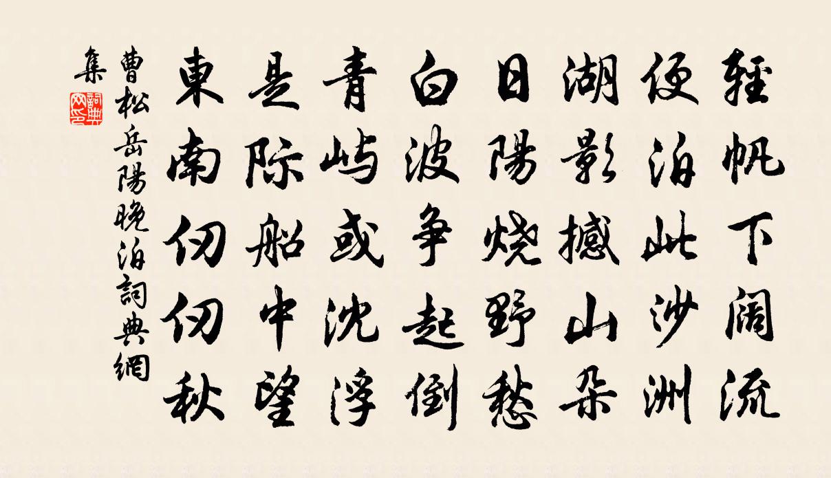 詩詞名句歷史字典書法欣賞書法字典國語詞典說文解字康熙字典古漢語字典標 題 作 者 詩 句 岳陽晚泊作者:曹松 朝代:唐代岳陽晚泊原文輕帆下闊流,便泊此沙洲。湖影撼山朵,日陽燒野愁。白波爭起倒,青嶼或沈浮。是際船中望,東南仞仞秋。詩詞問答問:岳陽晚泊的作者是誰?答:曹松問:岳陽晚泊寫於哪個朝代?答:唐代問:岳陽晚泊是什麼體裁?答:五律曹松岳陽晚泊書法欣賞岳陽晚泊書法作品注釋全唐詩:卷717-13詩詞推薦清明日自西午橋至瓜岩村有懷張繼〔唐代〕晚霽龍門雨,春生汝穴風。鳥啼官路靜,花發毀垣空。鳴玉慚時輩,垂絲學老翁。舊遊人不見,惆悵洛城東。送人紙筆王邁〔宋代〕阿連詩語已通神,玉版霜毫不厭珍,老我簿書安用此,自應回施與青春。次韻游山寺汪炎昶〔宋代〕龕暈描輕蘚,檐陰寞翠藤。追涼有時客,避難盡無僧。法界魔為崇,宗風冷欲冰。不知緣底事,還復有傅燈。將至玉山葛立方〔宋代〕蓐食轉前峰,梅黃細雨中。濤翻疑鷺翿,泉激認松風。山合秧畦窄,林深屐路通。怪來人語別,一置便江東。寄鶴山魏侍郎陳宓〔宋代〕濂洛遺音喜復鳴,未由會面只心傾。平生格物工夫到,好惡真如月樣明。丙寅正月張九成〔宋代〕常年正月未全春,春色今年輒去人。試上小樓南北望,紅英滿地綠粼粼。上崔十五老丈劉商〔唐代〕天漢乘槎可問津,寂寥深景到無因。看花獨往尋詩客,不為經時謁丈人。題柳郎中茅山故居(一作柳谷汧故居)權德輿〔唐代〕下馬荒階日欲曛,潺潺石溜靜中聞。鳥啼花落人聲絕,寂寞山窗掩白雲。寄王少府施肩吾〔唐代〕采松仙子徒銷日,吃菜山僧枉過生。多謝藍田王少府,人間詩酒最關情。次韻張禹直開元寺觀畫壁兼簡李德素蘇轍〔宋代〕丹青古藏壁,風雨飽侵藻。拂塵開蝕鑒,志士淚沾臆。靈山遠飛來,不可以智測。龍神湛回向,擁衛立劍戟。依然滿庭芳 李老先生慶八十姬翼〔元代〕南極儲祥,少微呈瑞,八旬應現人寰。水雲疏散,金鼎煉神丹。玩盡長春洞府,逍遙占、物外高閒。無衰老,龜旋寄從兄遵韋莊〔唐代〕江上秋風正釣鱸,九重天子夢翹車。不將高臥邀劉主,自吐清談護漢儲。滄海十年龍景斷,碧雲千里雁行疏。相逢望雨邵雍〔宋代〕久旱偶成雨,方喜慰愁苦。雖能斂塵土,不能救禾黍。偈頌七十二首釋祖欽〔宋代〕西來十萬路迢迢,智鑒當軒影莫逃。四海浪平龍睡千穩,九霄雲淨鶴飛高。句丁謂〔宋代〕白雪芬芳玉有香。寄題濟源李少卿園亭司馬光〔宋代〕縣僻人事少,土肥風物殊。杖刊靈壽木,輪里溴梁蒲。竹不減淇水,花仍似洛都。主公眉雪白,遊覽未嘗扶。自勉歐陽修〔宋代〕引水澆花不厭勤,便須已有鎮陽春。官居處處如郵傳,誰得三年作主人。詠史八首陶侃母蒲壽宬〔宋代〕坩鮓有幾許,直欲致一甘。豈知聖善意,見此轉不堪。此母天下母,清風使人慚。壽陽罷郡日…瑞物。發壽陽分司敕到又遇新正感懷書事李紳〔唐代〕休為建隼臨淝守,轉作垂絲入洛人。罷閱舊林三載籍,又開新曆四年春。雲遮北雁愁行客,柳起東風慰病身。漸喜奉使契丹二十八首其二十五次韻張君病起二首蘇轍〔宋代〕壯年得疾勢能支,不廢霜螫左手持。漸喜一杯留好客,未應五斗似當時。口中舌在時聞句,雪裡心安不問師。去臥名句推薦松月生夜涼,風泉滿清聽。孟浩然《宿業師山房期丁大不至 / 宿業師山房待丁大不至》 行吟坐嘯獨悲秋,海霧江雲引暮愁。陳子龍《秋日雜感(十首選一)》 得天下英才而教育之,三樂也!孟子《孟子·盡心章句上·第二十節》 一枝紅杏出牆頭,牆外行人正獨愁。吳融《途中見杏花》 心似雙絲網,中有千千結。張先《千秋歲·數聲鶗鴂》 求之有道,得之有命,是求無益於得也,求在外者也。孟子《孟子·盡心章句上·第三節》 青溪水,流得到紅橋。張景祁《小重山·幾點疏雅謄柳條》 還將兩行淚,遙寄海西頭。孟浩然《宿桐廬江寄廣陵舊遊》 朝來嗔寂寞,不肯試新衣。馮夢龍《喻世明言·卷一》 日出扶桑一丈高,人間萬事細如毛。劉叉《偶書》