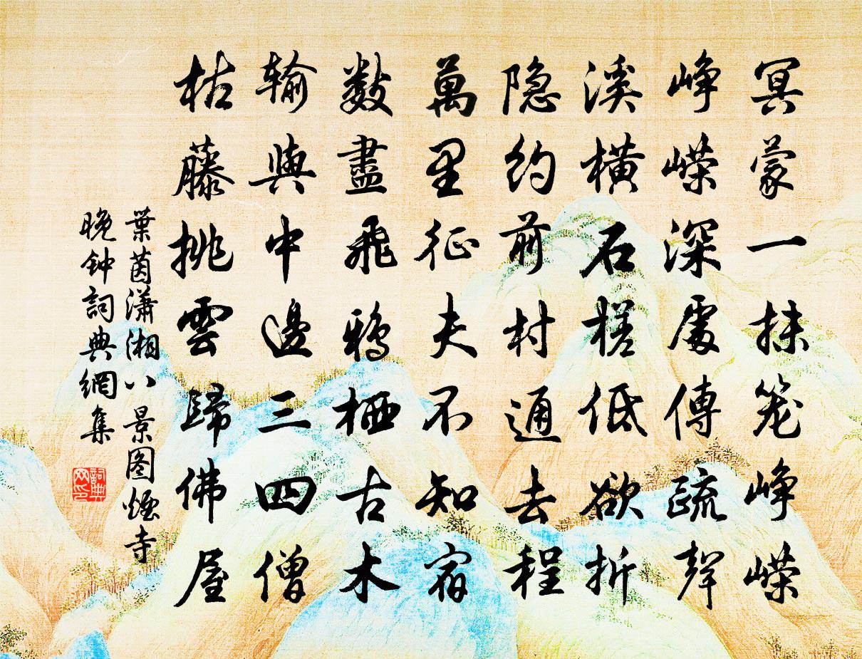 詩詞名句歷史字典書法欣賞書法字典國語詞典說文解字康熙字典古漢語字典標 題 作 者 詩 句 瀟湘八景圖煙寺晚鐘作者:葉茵 朝代:宋代瀟湘八景圖煙寺晚鐘原文冥濛一抹籠崢嶸,崢嶸深處傳疏聲。溪橫石槎低欲折,隱約前村通去程。萬里征夫不知宿,數盡飛鴉棲古木。輸與中邊三四僧,枯藤挑雲歸佛屋。詩詞問答問:瀟湘八景圖煙寺晚鐘的作者是誰?答:葉茵問:瀟湘八景圖煙寺晚鐘寫於哪個朝代?答:宋代葉茵瀟湘八景圖煙寺晚鐘書法欣賞瀟湘八景圖煙寺晚鐘書法作品詩詞推薦上平江徐侍郎十絕句曾協〔宋代〕不但寬平似有功,筆端重睹建安風。邦人競勸金鍾釂,願兒君侯聖一中。題書齋龍輔〔宋代〕深閨漸老大,始學謝娘詩。描筆題成句,良人事作師。白頭慚卓女,團扇愧班姬。豈敢傳千載,聊將遣一時。寄友生齊己〔唐代〕風騷情味近如何,門底寒流屋裡莎。曾摘園蔬留我宿,共吟江月看鴻過。時危苦恨無收拾,道妙深夸有琢磨。涼夜如夢令·門外綠陰千頃曹組〔宋代〕門外綠陰千頃,兩兩黃鸝相應。睡起不勝情,行到碧梧金井。人靜,人靜。風動一庭花影。早春殘雪施肩吾〔唐代〕春景照林巒,玲瓏雪影殘。井泉添碧甃,藥圃洗朱欄。雲路迷初醒,書堂映漸難。花分梅嶺色,塵減玉階寒。遠稱出門寄弟睹子得陳著〔宋代〕半年腿臥近方仁,一出門來拂濯身。交十月天村影好,連三日雨晚晴新。青山無語自知我,黃葉是愁還可人。誰信一上人之徑山釋子益〔宋代〕一處才通處處通,凌霄突兀對青龍。道途不涉最親句,只在平常日用中。同皇甫侍御齋中春望見示之作獨孤及〔唐代〕望遠思歸心易傷,況將衰鬢偶年光。時攀芳樹愁花盡,晝掩高齋厭日長。甘比流波辭舊浦,忍看新草遍橫塘。因君壬辰天中節,赴平江錫燕,因懷去年以侍臣攝范成大〔宋代〕去歲排場德壽宮,薰風披拂酒鱗紅。小臣供奉金龍醆,親到虛皇玉座東。天中繖動玉輿來,萬歲三聲徹九街。想見台州郡治十二詩太守尤延之命賦參雲亭林憲〔宋代〕孤雲不可攀,浩氣相與遙。著亭翠微頂,飛檐侵穴寥。紫麟迂遠駕,黃鵠回扶搖。雲收天籟息,亭影摩重霄。宿陽台觀馬戴〔唐代〕玉洞仙何在,爐香客 * 。醮壇圍古木,石磬響寒雲。曙月孤霞映,懸流峭壁分。心知人世隔,坐與鶴為群。水調歌頭 示眾無分彼此李道純〔元代〕道釋儒三教,名殊理不殊。參禪窮理,只要抱本返元初。解得一中造化,便使三元輻輳,宿疾普消除。屋舍既堅固惜花文同〔宋代〕胡蜂採花花氣薄,黃鳥啄花花蕊落。林風吹花花片亂,池水浸花花色惡。少年惜花會花意,晴張青幃雨油幕。勸君挽蘇少章王義山〔宋代〕曾趁當年桂子秋,煩公引領廣寒游。春官報罷笑歸去,底事無成付命休。詩又江湖一家數,學尋伊洛到源頭。忍將隨州邢恕〔宋代〕荊楚西南地,清明咫尺天。遠山猶帶雪,高柳已藏煙。醉蓬萊(丙申自壽)程珌〔宋代〕記蟾宮桂子,撒向人間,如今時候。□□□□,□□□□□。白下長乾,亂灘橫笛,想昔游依舊。大海一漚,千年觀化楊萬里〔宋代〕道是東風巧,西風未減東。菊黃霜換紫,樹碧露揉紅。須把乖張眼, * 造化工。只愁失天巧,不悔得詩窮。樓樞密輓詞二首蘇籀〔宋代〕決科騰踏無前勇,比牒聯飛第一流。召直毫端準謨誥,甄評皮里韞陽秋。槐班鼎輔膺柬,玉階封章究遠猷。楚挽淒金丹詩四十八首張繼先〔宋代〕少年何速成詩書,爭似求真保玉壺。更不勞神遊赤水,只知存性養玄珠。鼎中日月何人有,爐內丹砂世所無。人笑句孫僅〔宋代〕春來何事謫蓬瀛。名句推薦風力雖尚勁,然徒步則汗出浹背。袁宏道《滿井遊記》 東門之楊,其葉牂牂。佚名《東門之楊》 粽包分兩髻,艾束著危冠。陸游《乙卯重五詩》 亞夫營畔柳濛濛,隋主堤邊四路通。汪遵《楊柳》 郭門臨渡頭,村樹連谿口。王維《新晴野望》 晝夜蔽日月,冬夏共霜雪。謝靈運《登廬山絕頂望諸嶠》 以我之鎮靜,御彼之猖狂宋濂、王褘《元史·列傳·卷五十五》 草木行列,煙消日出。蘇轍《黃州快哉亭記》 湛湛長江去,冥冥細雨來。杜甫《梅雨》 及茲春未深,數畝猶足佃。王守仁《謫居糧絕請學於農將田南山詠言寄懷》