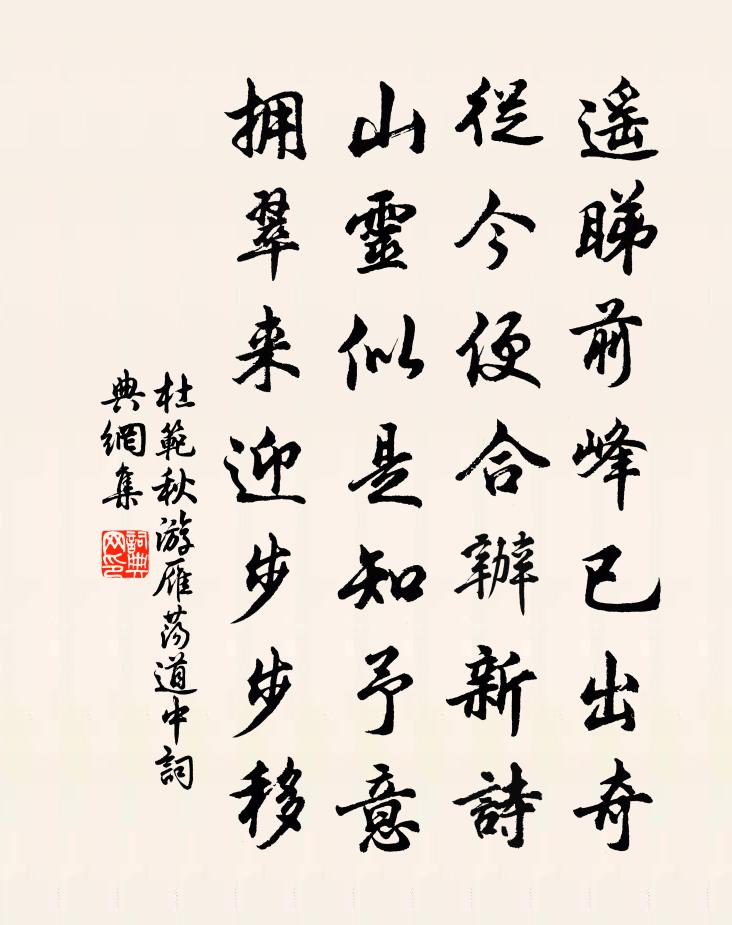 詩詞名句歷史字典書法欣賞書法字典國語詞典說文解字康熙字典古漢語字典標 題 作 者 詩 句 秋遊雁盪道中作者:杜范 朝代:宋代秋遊雁盪道中原文遙睇前峰已出奇,從今便合辦新詩。山靈似是知予意,擁翠來迎步步移。詩詞問答問:秋遊雁盪道中的作者是誰?答:杜范問:秋遊雁盪道中寫於哪個朝代?答:宋代杜范秋遊雁盪道中書法欣賞秋遊雁盪道中書法作品詩詞推薦次韻子由書清汶老所傳秦湘二女圖蘇軾〔宋代〕春風消冰失瑤玉,我本無身安有觸。羊生得婦如得風,握手一笑未為辱。先生室中無天游,佩環何處鳴風甌。隨魔宮詞一百首岳珂〔宋代〕駕前校獵起封狐,御箭親彎金僕姑。萬騎嵩呼開電笑,吾皇神武古今無。川撥棹王哲〔元代〕曲中詞徹。把來歷事親堪說。住京兆府外縣,終南方孤雲白雪。自觀得,玉花結。活死人兮放些劣。沒地埋,真歡題花樹楊衡〔唐代〕都無看花意,偶到樹邊來。可憐枝上色,一一為愁開。江行遇王侍御黃滔〔唐代〕數年分散秦吳隔,暫泊官船浦柳中。新草軍書名更重,久辭山徑業應空。渡頭潮落將行客,天際風高未宿鴻。此日題梧州陳司馬山齋孟浩然〔唐代〕一作宋之問詩南國無霜霰,連年對物華。青林暗換葉,紅蕊亦開花。春去無山鳥,秋來見海槎。流芳雖可悅,會自雪中晏起偶詠所懷兼呈張常侍、韋庶子、皇甫郎中白居易〔唐代〕窮陰蒼蒼雪雰雰,雪深沒脛泥埋輪。東家典錢歸礙夜,南家貰米出凌晨。我獨何者無此弊,復帳重衾暖若春。怕寒秋旅蘇轍〔宋代〕雨晴秋稼如雲屯,豆沒雞兔禾沒人。老農歡笑語行路,十年儉薄無今晨。無風無雨更一月,藜羹黍飯供四鄰。天公春日田園雜興二首魏新之〔宋代〕農圃誰言與世違,韶華正恐屬柴扉。天機化外聞幽哢,野色牛邊睨落暉。膏雨平分秧水白,光風小聚藥苗肥。行歌早入東省,殘月初上楊萬里〔宋代〕秉燭趨省署,兩街猶閉門。素娥獨早作,碧沼澣黝盆。寶扣剝見漆,半棱光剩銀。忽作青白眼,圓視向我嗔。黑氣過湍溝谷許棠〔唐代〕西去窮胡處,岩崖境不常。石形相對聳,天勢一條長。棧底鳴流水,林端斂夕陽。雖隨兵馬至,未免畏豺狼。偈頌一百零一首釋慧性〔宋代〕才開口又成剩語,不開口又成增語,發機須是千鈞弩。草店家風別,翻雲又覆雨。若是陶淵明,攢眉便歸去。讀二傳作趙蕃〔宋代〕長卿召問自拘監,子云待詔因王音。得官甚薄不捄辱,作賦可憐空苦心。霜天曉角(初春即事)劉辰翁〔宋代〕柳梢欲雪。十里煙明滅。曲曲闌乾轉影,教人憶、夜來月。家人相對說。燈花還又結。凍雨村村□鼓,終不似、上金陵五題江令宅劉禹錫〔唐代〕南朝詞臣北朝客,歸來唯見秦淮碧。池台竹樹三畝餘,至今人道江家宅。南陽見柳崔櫓〔唐代〕夜來風入最高枝,罥斷愁腸幾尺絲。楚塞曾吟煙午處,曲江長憶雪晴時。金銜細轂縈迴岸,戍笛牛歌遠近陂。還把清平樂晏幾道〔宋代〕蓮開欲遍。一夜秋聲轉。殘綠斷紅香片片。長是西風堪怨。莫愁家住溪邊。採蓮心事年年。誰管水流花謝,月明昨往敬亭路中謝朓〔南北朝〕山中芳杜綠。江南蓮葉紫。芳年不共游。淹留空若是。綠水豐漣漪。青山多繡綺。新條日向抽。落花紛已委。弱葼首尾吟邵雍〔宋代〕堯夫非是愛吟詩,詩是堯夫十月時。寒日無光天色遠,陰雲不動柳絲垂。園林葉盡鳥未散,道路風多人更稀。滿目蝶戀花趙令畤〔宋代〕碧沼鴛鴦交頸舞。正恁雙棲,又遣分飛去。灑翰贈言終不許。援琴請盡奴衷素。曲未成聲先怨慕。忍淚凝情,強作名句推薦晨興理荒穢,帶月荷鋤歸。陶淵明《歸園田居·其三》 惠遠祠前晉溪水,翠葉銀花清見底。元好問《過晉陽故城書事》 好言難得,惡語易施。佚名《增廣賢文·上集》 遠岫出山催薄暮,細風吹雨弄輕陰。李清照《浣溪沙·小院閒窗春色深》 心有疑,隨札記。就人問,求確義。李毓秀《弟子規·餘力學文》 男兒少為客,不辨是他鄉。李流芳《黃河夜泊》 勝人者有力,自勝者強。老子《老子·道經·第三十三章》 仁則榮,不仁則辱。孟子《孟子·公孫丑章句上·第四節》 平林漠漠煙如織,寒山一帶傷心碧。李白《菩薩蠻·平林漠漠煙如織》 著葉滿枝翠羽蓋,開花無數黃金錢杜甫《秋雨嘆三首》