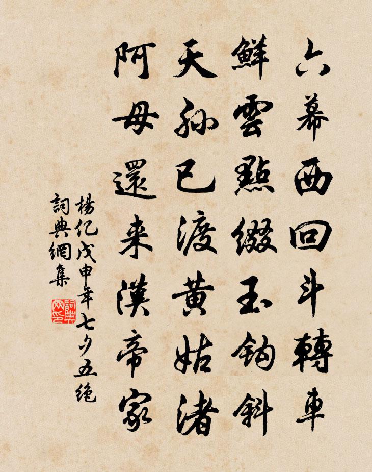 詩詞名句歷史字典書法欣賞書法字典國語詞典說文解字康熙字典古漢語字典標 題 作 者 詩 句 戊申年七夕五絕作者:楊億 朝代:宋代戊申年七夕五絕原文六幕西回斗轉車,鮮雲點綴玉鉤斜。天孫已渡黃姑渚,阿母還來漢帝家。詩詞問答問:戊申年七夕五絕的作者是誰?答:楊億問:戊申年七夕五絕寫於哪個朝代?答:宋代楊億戊申年七夕五絕書法欣賞戊申年七夕五絕書法作品詩詞推薦讀李群玉集樂雷發〔宋代〕光順門前系馬吟,弘文館裡翠雲春。卻憐白首河西尉,枉作蓬萊獻賦人。為徐企題李伯時馬方回〔宋代〕此畫良真李伯時,形容飛動卒難詩。但將元佑蘇黃作,開卷焚香朗誦之。洞仙歌佚名〔宋代〕倚遍闌乾十二樓。真除後謾記所見魏了翁〔宋代〕晨將榜子關賓合,輦出房時已奏知。陛對臣寮才下殿,朱衣絲履上東墀。立齋靜佳樓和王吉州韻金履祥〔宋代〕層樓新扁表新功,個裡工夫自不同。儼若思時居此敬,寂然靜處感而通。山窺南北浮嵐小,月轉西東灝氣充。更植首尾吟邵雍〔宋代〕堯夫非是愛吟詩,詩是堯夫先見時。直有胸中貧亦樂,屈於人下貴奚為。誰何藥可醫無病,多少金能買不疑。遲老駟驖佚名〔先秦〕駟驖孔阜,六轡在手。公之媚子,從公於狩。奉時辰牡,辰牡孔碩。公曰左之,舍拔則獲。游於北園,四馬既閒。感事吟邵雍〔宋代〕古人不見面,止可觀其心。其心固無佗,而多顧義深。今人不見心,正可觀其面。其面固無佗,而多顧利淺。顧義寄諸弟韋應物〔唐代〕歲暮兵戈亂京國,帛書間道訪存亡。還信忽從天上落,唯知彼此淚千行。仙掌羅隱〔唐代〕掌前流水駐無塵,掌下軒車日日新。謾向山頭高舉手,何曾招得路行人。顯聖寺庭枸杞黃庭堅〔宋代〕仙苗壽日月,佛界承露雨。誰為萬年計,乞此一抔土。扶疏上翠蓋,磊落綴丹乳。去家尚不食,出家何用許。正恐惜春傷同幕故人孟郎中兼呈去年看花友李益〔唐代〕畏老身全老,逢春解惜春。今年看花伴,已少去年人。二月十四日曉起看海棠八首楊萬里〔宋代〕花密無重數,看來眼轉迷。化為花世界,忘卻日東西。春集東園賦得葉字王舉正〔宋代〕芳辰聊命駕,郊野賞心愜。亭幽路鬱紆,樹密花重疊。暫紓朝紱勞,喜與朋簪接。談塵逗松枝,宴賞澄竹葉。含和挽向倅王洋〔宋代〕襟量塵埃外,功名慷慨中。人懷不滿望,身有未全功。逸氣猶驚眼,馳光息轉蓬。蕭條古原上,松柏自號風。題韋隱居西齋(一作題韋處士山居)許渾〔唐代〕劚藥去還歸,家人半掩扉。山風藤子落,溪雨豆花肥。寺遠僧來少,橋危客到稀。不聞砧杵動,應解制荷衣。挽趙秋曉黎獻〔宋代〕嶺海英游少,詩書旺氣衰。先生今不起,後死竟安歸。文曲星何暝,靈光賦又非。儒宗真可憾,豈但哭吾私。庚子祈雨蔣山贈月老李曾伯〔宋代〕欲知計寺金谷吏,便是鐘山粥飯頭。爾欲朝朝動魚鼓,我期日日飽貔貅。幾為曉灶炊煙喜,又作秋田渴雨憂。自有極論邵雍〔宋代〕下有黃泉上有天,人人許住百來年。還知虛過死萬遍,都似不曾生一般。要識明珠須巨海,如求良玉必名山。先能雙松陸游〔宋代〕東岡夭矯兩蒼龍,千尺蟠空黛色濃。六十餘年松若此,誰知我更老於松!名句推薦小來思報國,不是愛封侯。岑參《送人赴安西》 玄都觀里桃千樹,花落水空流。元好問《人月圓·玄都觀里桃千樹》 今年對花最匆匆,相逢似有恨,依依愁悴。周邦彥《花犯·小石梅花》 鹹言上國繁華,豈謂帝城羈旅。子蘭《秋日思舊山》 江南自是離愁苦,況游驄古道,歸雁平沙。王沂孫《高陽台·和周草窗寄越中諸友韻》 君子欲訥於言而敏於行。孔子弟子《論語·里仁篇》 寧不知傾城與傾國。佳人難再得。李延年《李延年歌》 物雖小,勿私藏。苟私藏,親心傷。李毓秀《弟子規·入則孝》 酒闌更喜團茶苦,夢斷偏宜瑞腦香。李清照《鷓鴣天·寒日蕭蕭上瑣窗》 一上高城萬里愁,蒹葭楊柳似汀洲。許渾《鹹陽城東樓 / 鹹陽城西樓晚眺 / 西門》