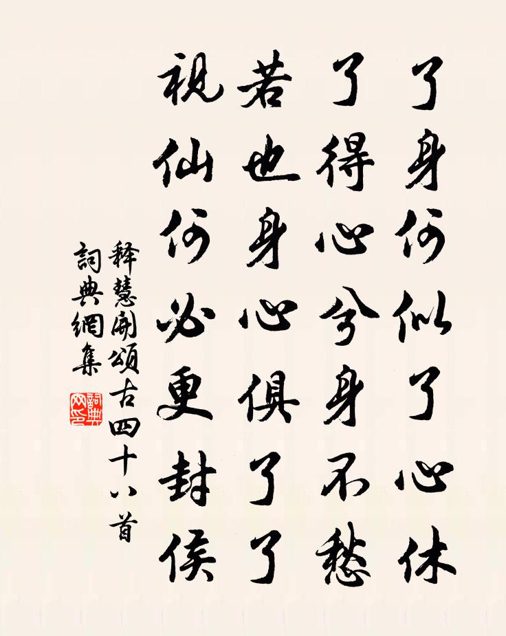詩詞名句歷史字典書法欣賞書法字典國語詞典說文解字康熙字典古漢語字典標 題 作 者 詩 句 頌古四十八首作者:釋慧開 朝代:宋代頌古四十八首原文了身何似了心休,了得心兮身不愁。若也身心俱了了,視仙何必更封侯。詩詞問答問:頌古四十八首的作者是誰?答:釋慧開問:頌古四十八首寫於哪個朝代?答:宋代釋慧開頌古四十八首書法欣賞頌古四十八首書法作品詩詞推薦骨相陸游〔宋代〕骨相元知薄,功名敢自期?病侵強健日,閒過聖明時。形勝輪台地,飛騰瀚海師。江湖雖萬里,猶擬綴聲詩。重陽高適〔唐代〕節物驚心兩鬢華,東籬空繞未開花。百年將半仕三已,五畝就荒天一涯。豈有白衣來剝啄,一從烏帽自欹斜。真成句張環〔宋代〕洲圍淮口江形狹。亭上石頭月色多。元宵雨戴復古〔宋代〕窮人不謀歡,元夜如常時。晴雨均寂寞,蚤與一睡期。朱門粲燈火,歌舞臨酒池。酒闌歡不足,九街恣游嬉。前呵桂江曹松〔唐代〕未識佳人尋桂水,水雲先解傍壺觴。筍林次第添斑竹,雛鳥參差護錦囊。乳洞此時連越井,石樓何日到仙鄉。如飛人日出遊湖上十首楊萬里〔宋代〕去時數點雨,歸時數片雪。雨雪兩不多,山路雙清絕。詠史下關羽四首陳普〔宋代〕巴山漢水本興劉,諸葛才華備贊留。但得關髯師廣武,北州韓信在南州。冬至後五夕頻夢陳擇之趙蕃〔宋代〕所見日雜遝,寧復當我思。我此僻且陋,三夜頻夢之。遣騎告欲行,手持一通詩。發緘與兒讀,絕妙解人頤。我欲再次韻十首陳造〔宋代〕吳門詩酒伴,入社記吾曾。香篆溫難燼,銅壺冷易冰。賡酬恕吾老,聲價放渠增。衰謝猶回首,思分蔀屋燈。句紀應炎〔宋代〕三年南海清心坐,一任東君冷眼看。句紹興朝士〔宋代〕疾風勁草識忠臣。暮春病歸翁卷〔宋代〕朝朝風景添,吾病亦開簾。洗藥花前曬,傳方壁上黏。力還省語,身老更看髯。昨日林僧至,茶杯始一拈。句姚合〔唐代〕天遙來雁小,江闊去帆孤。南陌遊人回首去,東林道者杖藜歸。萄藤洞庭頭,引葉漾盈搖。皎潔鉤高掛,玲瓏影落由下梅至資福估賣官產喻良能〔宋代〕曉發下梅寺,霽色浮壠麥。崎嶇白楊岸,詰屈黃牛軛。野芳吐丰茸,山羽鳴格磔。驅車復前途,聊欲遍阡陌。頌古六首釋崇岳〔宋代〕狗子佛性無,門上釘桃符。千鴉俱不入,百怪盡消除。酬吳仲庶小園之句王安石〔宋代〕舊年台榭掃流塵,職閉朱門歲又新。花影隙中看裊裊,車音牆外去轔轔。相逢豈少佳公子,一醉何妨薄主人。只向先天易吟三十首方回〔宋代〕子半至午半,南方旋北方。往來分逆順,治亂判陰陽。洞庭晚望七首高善濂〔宋代〕擊汰涼風水面回,偃虹堤上夕陽開。含漿老蜌浮光起,迎棹神鴉舞翅回。醉唱難尋漁笛樂,羈懷易動暮笳哀。何能懷友人趙蹈中周南〔宋代〕水宿山行可煞勞,山川應是怕才豪。詩人只好游湘水,上卻巴陵恐是騷。同賦梅花十二題山館王銍〔宋代〕窮塗遊子年華晚,折贈無人信手題。留戀清香忍回首,五更立馬斷橋西。名句推薦凍臉有痕皆是血,酸心無恨亦成灰。曹雪芹《詠紅梅花得“梅”字》 財物輕,怨何生。言語忍,忿自泯。李毓秀《弟子規·出則弟》 老人七十仍沽酒,千壺百瓮花門口。岑參《戲問花門酒家翁》 肅肅花絮晚,菲菲紅素輕。杜甫《春遠 / 春運》 峨眉山月半輪秋,影入平羌江水流。李白《峨眉山月歌》 城門失火,殃及池魚。佚名《增廣賢文·上集》 弗愛弗利,親子叛父。劉安及其門客《淮南子·繆稱訓》 遠水難救近火,遠親不如近鄰。佚名《增廣賢文·上集》 智不逾奸,伐之莫勝;知不至大,奸者難拒。來俊臣《羅織經·察奸卷第八》 嗜欲不能勞其目,淫邪不能惑其心佚名《黃帝內經·上古天真論》