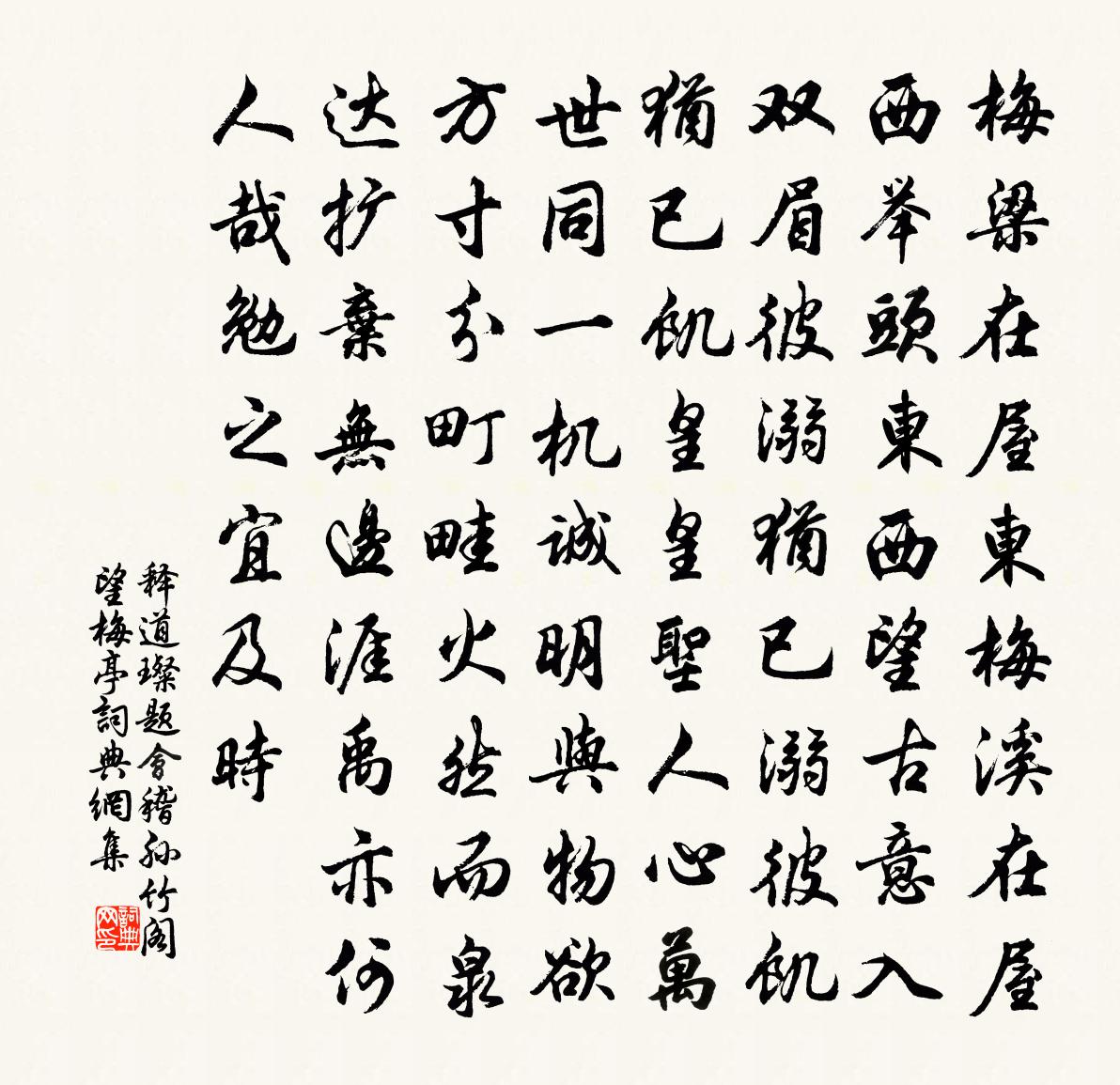 詩詞名句歷史字典書法欣賞書法字典國語詞典說文解字康熙字典古漢語字典標 題 作 者 詩 句 題會稽孫竹閣望梅亭作者:釋道璨 朝代:宋代題會稽孫竹閣望梅亭原文梅梁在屋東,梅溪在屋西。舉頭東西望,古意入雙眉。彼溺猶已溺,彼飢猶已飢。皇皇聖人心,萬世同一機。誠明與物慾,方寸分町畦。火然而泉達,擴棄無邊涯。禹亦何人哉,勉之宜及時。詩詞問答問:題會稽孫竹閣望梅亭的作者是誰?答:釋道璨問:題會稽孫竹閣望梅亭寫於哪個朝代?答:宋代釋道璨題會稽孫竹閣望梅亭書法欣賞題會稽孫竹閣望梅亭書法作品詩詞推薦京口即事翁卷〔宋代〕長流當下流,鐵翁此為州。前代多名跡,閒人慾遍游。夕陽波上寺,明月戍邊樓。一曲漁家笛,生予無限愁。金陵雜興二百首蘇泂〔宋代〕張碩風流隱釣緡,漁郎回首漫紛紛。杜蘭香去知何在,惆悵西江一浦雲。瓦送劉克莊〔宋代〕瓦送繡行均一去,如公之去獨賢哉。國僑存校如迂闊。涑水辭樞冀挽回。聊為先師主精舍,不煩殘客到翹村。半山斯遠兄入城見使君郎中且謁尚書韓先生提屬李趙蕃〔宋代〕永嘉別駕從渠說,為說錢晁好夙通。聊以吾雲卜吾子,儻賢吾亦出蒿逢。夫人合春帖子四首蘇頌〔宋代〕良辰孟月辰新陽,和氣中宵遍未央。不待望 * 轉漏,便趨崇慶殿稱觴。懷寄彭城朋好十首之六陳二賀鑄〔宋代〕遠寄陳傳道,窮秋亦罷官。還驅款段馬,吟雪向長安。隆興書堂自警三十五首陳淳〔宋代〕人為天地心,體焉天地同。病於有我私,不能相流通。讀魯晉二公傅石介〔宋代〕節似魯公猶被陷,忠知裴度亦遭讒。上無明主奸邪勝,我讀遺篇淚滿衫。學仙二首許渾〔唐代〕漢武迎仙紫禁秋,玉笙瑤瑟祀昆丘。年年望斷無訊息,空閉重城十二樓。心期仙訣意無窮,采畫雲車起壽宮。聞有感事楊冠卿〔宋代〕我車昔載脂,柳色初濯濯。甩歸脫征驂,柳葉半黃落。恍然僅一夢,已費十晦朔。只應為客老,惘惘不自覺。遇雨放朝余至掖門方審戲呈同舍宋庠〔宋代〕詔恩蠲謁靜朝扉,掀淖都街獨未知。同舍恣成莊蝶夢,可憐臣朔忍朝飢。相和歌辭。苦哉遠征人鮑溶〔唐代〕征人歌古曲,攜手上河梁。李陵死別處,杳杳玄冥鄉。憶昔從此路,連年征鬼方。久行迷漢歷,三洗氈衣裳。百戰別秀亭五首方回〔宋代〕醉翁亭記四時樂,我樂謂何寧不慚。滿地落花供妓席,隔江殘雪認僧庵。邦人解學推敲勢,野叟時同爾汝談。盜賊又和丐祠未報釋寶曇〔宋代〕黃金羈勒閟天閒,何似春山苜蓿間。白接羅邊餘甕蟻,烏皮幾外即塵闤。龍蛇大澤公真是,虎豹重門孰可攀。示不次韻謝史提乾見知馮伯規〔宋代〕呼得蜿蜒入小瓴,便能飛雨挾林坰。油雲頓失千山赤,丹篆嘗騰一紙青。漢節可眠知免曠,仙祠屢扣信通靈。欲同和劉評事永樂閒居見寄李商隱〔唐代〕白社幽閒君暫居,青雲器業我全疏。看封諫草歸鸞掖,尚賁衡門待鶴書。蓮聳碧峰關路近,荷翻翠扇水堂虛。自探溧水道中回寄子肅玉汝並屬李晦庵八首趙蕃〔宋代〕抱關故悠悠,掛壁仍駸駸。況此十日病,酒止詩廢吟。別來定安否,千萬關我心。次古詩韻 其五王冕〔元代〕屠沽慚壯士,文繡貴山郎。習氣蟲魚族,風流雁鶩行。從時多俯仰,弔古獨悲傷。無奈連宵雨,蝸牛上石床。綺寮怨(宮人斜弔古)石正倫〔宋代〕綠野春濃停騎,暖風飄醉襟。漸觸目、景物淒悲,花無語、曲徑沈沈。重檐繚垣靜鎖,丹青暗、斷軸塵半侵。嘆絳挽垓山陳宣義陽枋〔宋代〕升堂曾得話從容,骨相清癯七十翁。唧唧愛人皆語妙,遲遲留客屢杯空。眼分青白斯文外,手作推敲雅詠中。我忝名句推薦春風舉國裁宮錦,半作障泥半作帆。李商隱《隋宮 / 隋堤》 爾來從軍天漢濱,南山曉雪玉嶙峋。陸游《金錯刀行》 葉潤林塘密,衣乾枕席清。杜甫《水檻遣心二首》 秋天一夜靜無雲,斷續鴻聲到曉聞。張仲素《秋閨思二首》 涼月如眉掛柳灣,越中山色鏡中看。戴叔倫《蘭溪棹歌》 不凡之子,必異其生;大德之人,必得其壽。程登吉《幼學瓊林·卷二·老幼壽誕》 欲將心事付瑤琴。岳飛《小重山·昨夜寒蛩不住鳴》 今日重來訪,不見知音人。馮夢龍《警世通言·卷一》 回首天涯歸夢,幾魂飛西浦,淚灑東州。周密《一萼紅·登蓬萊閣有感》 大人者,不失其赤子之心者也。孟子《孟子·離婁章句下·第十二節》