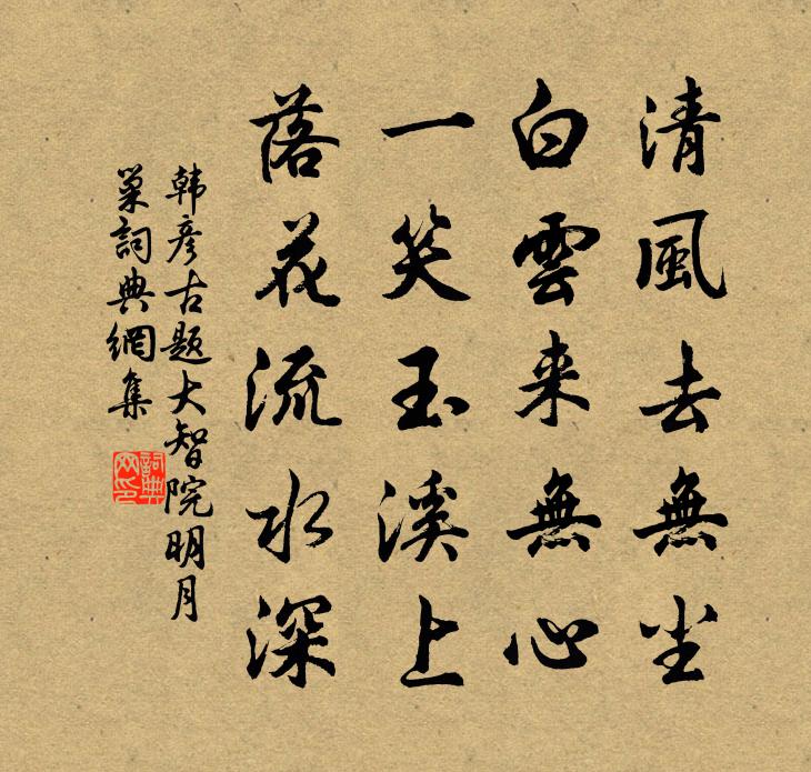 詩詞名句歷史字典書法欣賞書法字典國語詞典說文解字康熙字典古漢語字典標 題 作 者 詩 句 題大智院明月巢作者:韓彥古 朝代:宋代題大智院明月巢原文清風去無塵,白雲來無心。一笑玉溪上,落花流水深。詩詞問答問:題大智院明月巢的作者是誰?答:韓彥古問:題大智院明月巢寫於哪個朝代?答:宋代韓彥古題大智院明月巢書法欣賞題大智院明月巢書法作品詩詞推薦錢道人不飲酒食肉囊中不畜一錢所須飯及草屨陸游〔宋代〕誤辱君王賜鏡湖,身隨鷗鷺寄菰蒲。行年八十猶強健,欲伴先生去得無?次雲見過留宿有詩因賡其韻二首黃公度〔宋代〕惜別情無賴,狂吟意有餘。琴尊閒院落,花柳暗村墟。行樂真聊爾,論交莫後予。裹糧山下約,來往未應疏。題晚照樓陳著〔宋代〕乳峰天下景,清景此尤多。檐影夕陽樹,簾香新水荷。虛通雲入室,平送鶴歸窠。高坐清涼境,人閒自沸鍋。秦樓月陳三聘〔宋代〕春膏集。新雷忽起龍蛇蟄。龍蛇蟄。柳塘風快,水流聲急。傷心有淚憑誰浥。尊前容易青衫濕。青衫濕。渡頭人去秋夜懷康節陳起〔宋代〕無眠輾轉聽更殘,心緒如絲起萬端。煎藥爐邊童夢曉,讀書檠下婦紉寒。狻猊斷火香猶婉,促織催秋袂怯單。願子仁化錦石岩余靖〔宋代〕巉岩絢爛倚雲隈,萬玉無香結作堆。不是虬龍眠鐵樹,原來假石作根荄。對菊黃庚〔宋代〕春花能得幾時紅,萬樹繁華轉眼空。 * 雖黃偏耐久,西風雅淡似東風。挽汪守宗博二首劉克莊〔宋代〕還笏歸為負耒農,清談常許奉從容。芻蕘孰肯來詢汝,薤水吾無可語公。懷惠俱垂峴碑淚,旌廉合有寢丘封。莆人送新知永州陳秘丞瞻赴任朱昂〔宋代〕赴郡逢秋節,晨征思爽然。過橋猶見月,臨水忽聞蟬。野色藏溪樹,香風撼渚蓮。此行君得意,千里獨搖鞭。與青原正庵老劉過〔宋代〕倦行老矣偏東南,最後青原識正庵。無法更求身外說。有祥應向意中參。春風繞寺雨花墜,石鼎烹花泉味甘。暫癰送史判官奏事之靈武,兼寄巴西親故劉長卿〔唐代〕中州日紛梗,天地何時泰。獨有西歸心,遙懸夕陽外。故人奉章奏,此去論利害。陽雁南渡江,征驂去相背。因君恭和御製禮記徹章詩劉克莊〔宋代〕臨決遺經自聖衷,固殊野外與淹中。五三典禮勤稽古,十六星霜久積功。倚席居然慚寡淺,登床安敢紊卑崇。防民餞唐州高使君赴任蘇頲〔唐代〕永日奏文時,東風搖盪夕。浩然思樂事,翻復餞征客。淮水春流清,楚山暮雲白。勿言行路遠,所貴專城伯。葉簡占失牛佚名〔唐代〕占失牛,已被家邊載上州。欲知賊姓一斤求,欲知賊名十幹頭。(果鄰人丘甲盜之)雨後十小絕以一雨洗殘暑萬家生早涼為韻章甫〔宋代〕閒居何所宜,把酒策第一。石田今有秋,痛飲事可必。【仙呂】泣彥回朱庭玉〔元代〕暗想配秋娘,情如交頸鴛鴦。綢繆繾綣深恩重義難忘,似真賢孟光。喜齊眉笑舉梁鴻案,與卿卿帶結同心,效鶼鶼代次韻聞砧方回〔宋代〕誰家秋夜搗衣聲,遙憶良人在戍營。野宿貔貅天一角,樹移烏鵲月三更。怨懷想像閨中切,逸韻悠揚枕上清。砧杵滿庭芳 師叔和公升霞之後,有臨潼縣開採帛馬鈺〔元代〕脫)治療不痊。忽一夕夢見師叔說,以藥餌治療之法,問其姓名,乃終南和先生也。覺來依此服餌,其病自愈。至謝送碾壑源揀芽黃庭堅〔宋代〕矞雲從龍小蒼璧,元豐至今人未識。壑源包貢第一春,緗奩碾香供玉食。睿思殿東金井欄,甘露薦椀天開顏。橋山大觀宗祀明堂五首佚名〔宋代〕有邦事神,享帝為尊。內心致德,外示彌文。嘉玉效珍,主以量幣。恭欽伊何,惟以宗祀。名句推薦玉在山而草木潤,淵生珠而崖不枯。荀子《荀子·勸學》 似醉煙景凝,如愁月露泫。崔護《五月水邊柳》 君子莫大乎與人為善。孟子《孟子·公孫丑章句上·第八節》 何事吟余忽惆悵,村橋原樹似吾鄉。王禹偁《村行·馬穿山徑菊初黃》 紙屏石枕竹方床,手倦拋書午夢長。蔡確《夏日登車蓋亭》 何處飛來林間鵲,蹙踏松梢微雪。辛棄疾《賀新郎·把酒長亭說》 英雄行險道,富貴似花枝。佚名《增廣賢文·上集》 喧鳥覆春洲,雜英滿芳甸。謝朓《晚登三山還望京邑》 酒濃春入夢,窗破月尋人。毛滂《臨江仙·都城元夕》 汾水碧依依,黃雲落葉初飛。孫光憲《河瀆神·汾水碧依依》
