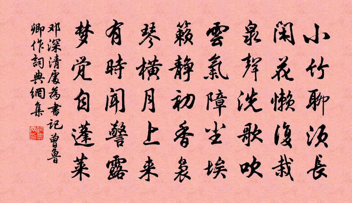 詩詞名句歷史字典書法欣賞書法字典國語詞典說文解字康熙字典古漢語字典標 題 作 者 詩 句 清處為書記曾魯卿作作者:鄧深 朝代:宋代清處為書記曾魯卿作原文小竹聊須長,閒花懶復栽。泉聲洗歌吹,雲氣障塵埃。籟靜初香裊,琴橫月上來。有時聞警露,夢覺自蓬萊。詩詞問答問:清處為書記曾魯卿作的作者是誰?答:鄧深問:清處為書記曾魯卿作寫於哪個朝代?答:宋代鄧深清處為書記曾魯卿作書法欣賞清處為書記曾魯卿作書法作品詩詞推薦滿江紅(重九與張舍人)韓玉〔宋代〕正欲登臨,何處好、登臨眺望。君約我、今朝攜酒,古台同上。風靜秋郊渾似洗,碧空淡覆玻璃盎。夕照外、渺渺澤國幽居夏日雜題釋文珦〔宋代〕澤因無袢暑,幽居趣自長。花開殊旦暮,稻熟間青黃。急雨分塍下,微風度水涼。斷除車馬跡,日日聽魚根。庸醫治駝江盈科〔明代〕昔有醫人,自媒能治背駝,曰:“如弓者、如蝦者、如環者,若延吾治,可朝治而夕如矢矣。”一人信焉,使治曲滿庭芳譚處端〔元代〕欺味成家,慳貪積富,靜言獨坐思量。養他數口,罪孽自家當。催促光陰似箭,才青鬢、容改衰蒼。百年里,誰人暮春陳允平〔宋代〕柳外宮鶯囀曉寒,萬花開盡正春殘。沉香亭北欄乾曲,獨抱琵琶看牡丹。訪僧舍宋祁〔宋代〕近郭一牛鳴,金園界寶繩。眾花天作雨,千焰佛傳燈。碧柰垂園老,青蓮雜漏凝。病襟多俗物,時此訪南能。春晚客中雜吟四絕句程公許〔宋代〕昨夜青皇駕趣旋,星榆散漫晚風顛。一春無著供陶寫,滿硯塵埃費洗前。祝英台近湯恢〔宋代〕宿酲蘇,春夢醒,瀋水冷金鴨。落盡桃花,無人掃紅雪。漸催煮酒園林,單衣庭院,春又到、斷腸時節。恨離別。賞花釣魚二首司馬光〔宋代〕飛廉通上苑,鳷鵲帶天淵。樹色含春霧,波光靜曉煙。香飄仙伏外,花舞御卮前。籊籊文竿裊,簁簁素鮪鮮。誤陪洞霄宮釋智圓〔宋代〕蕭酒絕塵跡,虛廊畫列仙。洞靈潛徹海,山峭欲奔天。松古巢高鶴,庭閒湧異泉。長生如有術,誰復歡流年。水龍吟 至順癸酉九日秋與亭賦許有壬〔元代〕一亭飛出層霄,昔人似為登高辦。雙眸千里,茫茫宇宙,滔滔江漢。一片秋光,青山紅樹,斷雲斜雁。想人生塵世村居馮時行〔宋代〕飛蛾故故撲燈光,風雨蕭蕭打紙窗。人為官方搔白首,虎來村落渡清江。猿啼冷日誰家夢,故國愁牽幾曲腸。籬菊宜春宴射篇李駙馬請賦雜言梅堯臣〔宋代〕風雨未過桐華時,宜春苑中梨萼披。天子賜宴群臣嬉,少年都尉方追隨。暮歸遲喜聯留後,兄弟雙弓射熊皮。侯宗梁州對雨,懷麴二秀才,便呈麴大判官,時疾岑參〔唐代〕江上雲氣黑,山旱山昨夜雷。水惡平明飛,雨從嶓冢來。濛濛隨風過,蕭颯鳴庭槐。隔簾濕衣巾,當暑涼幽齋。麴秋晚溪中寄懷大理齊司直(時齊分司洛下,有東山之期)李益〔唐代〕鳳翔屬明代,羽翼文葳蕤。崑崙進琪樹,飛舞下瑤池。振儀自西眷,東夏復分釐。國典唯平法,伊人方在斯。荒寧寒暄不齊二絕洪咨夔〔宋代〕次第新煙欲試茶,錚錚飛霰響檐牙。惜春苦欲春長在,且得輕寒約住花。秋旱繼以大風即事十首劉克莊〔宋代〕曾立龍墀忝近臣,深知玉座最憂民。近傳奎畫蠲租賦,稽首觚稜祝聖人。夏日陪史郎中宴杜郎中果園錢起〔唐代〕何事重逢迎,春醪晚更清。林端花自老,池上月初明。路入仙郎次,烏連柱史名。竹陰疏柰院,山翠傍蕪城。引滿次程斗山村居韻十首楊公遠〔宋代〕詩骨清臞甚,幾如沈隱侯。自編籬象眼,為護筍貓頭。日有丘園樂,身無世俗愁。憐渠名利客,汩汩幾時休。石榴楊萬里〔宋代〕深著紅藍染暑裳,琢成紋玳敵秋霜。半含笑里清冰齒,忽綻吟邊古錦囊。霧縠作房珠作骨,水精為醴玉為漿。劉郎名句推薦采采黃金花,何由滿衣袖。杜甫《九日寄岑參》 無情不似多情苦。一寸還成千萬縷。晏殊《玉樓春·春恨》 誰家秋院無風入?何處秋窗無雨聲?曹雪芹《代別離·秋窗風雨夕》 大樹底下好遮陰張南莊《何典·第十回》 向來吟秀句,不覺已鳴鴉。韓翃《酬程延秋夜即事見贈》 野火燒不盡,春風吹又生。白居易《草 / 賦得古原草送別》 痴男怨女,可憐風月債難償。曹雪芹《紅樓夢·第五回》 八月寒葦花,秋江浪頭白。李頎《送劉昱》 春色邊城動,客思故鄉來。何遜《邊城思》 軍中宜劍舞,塞上重笳音。張說《幽州夜飲》