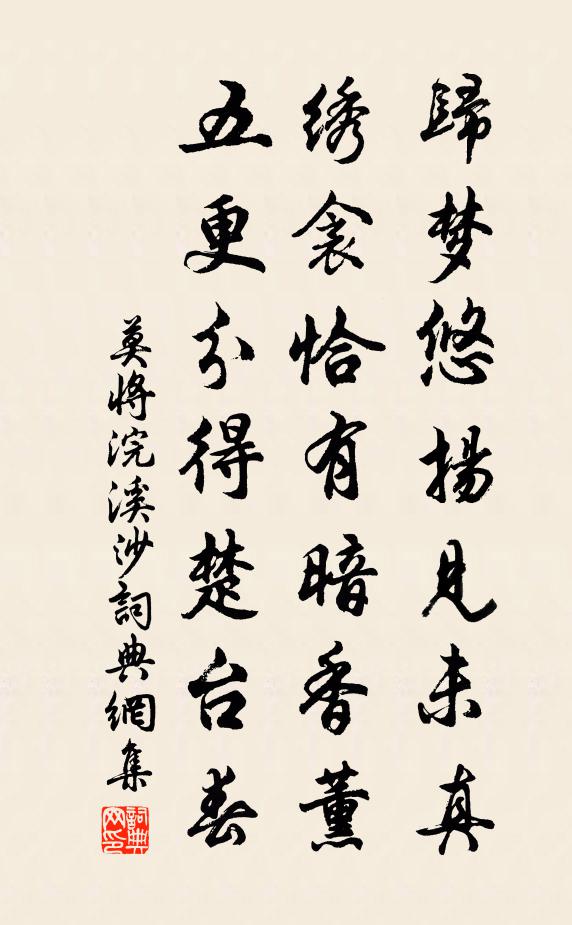 詩詞名句歷史字典書法欣賞書法字典國語詞典說文解字康熙字典古漢語字典標 題 作 者 詩 句 浣溪沙作者:莫將 朝代:宋代浣溪沙原文歸夢悠揚見未真。繡衾恰有暗香薰。五更分得楚台春。詩詞問答問:浣溪沙的作者是誰?答:莫將問:浣溪沙寫於哪個朝代?答:宋代問:浣溪沙是什麼體裁?答:詞莫將浣溪沙書法欣賞浣溪沙書法作品詩詞推薦和劉右司見寄六絕一律吳潛〔宋代〕我家碧雲畔,中有最高亭。閱世已頭白,看山猶眼青。誰能環北轍,那更徙南溟。歸計天須許,煩占處士星。山居五首釋子淳〔宋代〕兀坐鎮長行,孰人知此情。竹風輕有韻,岩溜細無聲。岌岌三山秀,依依片月明。門前枯樹子,孤鶴夢難成。夜出湖口葛紹體〔宋代〕雲連天遠水連雲,一片天光欲半昏。新月似憐新雁過,伴他孤影落前村。白蓮堂孫邦〔宋代〕大智西歸不肯回,只今蓮社喜重開。會中獨有遺民在,十五年間兩度來。心地白蓮俱有種,要須功德水方開。因師次韻石芝蘇轍〔宋代〕雞鳴東海朝日新,光蒙洲島霧雨勻。一曦石上遍生耳,幽子自食無來賓。寄書乞取久未許,箬籠蕉囊海神戶。一掬劉宗元索余賦愚谷古人以愚自命及命人者多矣彭龜年〔宋代〕以愚名谷意何如,肯以愚溪認作吾。天地中間有真我,蕭然陋巷不關渠。頌證道歌證道歌釋印肅〔宋代〕即是如來大圓覺,切忌將心重卜度。鳥窠拈起布毛吹,未透玄津何摸索。春秋戰國門田饒周曇〔唐代〕廚拋敗肉士懷飢,倉爛餘糧客未炊。臨難欲行求死士,將何恩信致扶危。偈頌七十一首釋了惠〔宋代〕的的此事,真不可說。不可說中真可說,真可說,無可說。齒臨部臨,急急敕攝。贊皇人語佚名〔唐代〕太沖無兄,孝端無弟。相士朱蓑衣釋法薰〔宋代〕閱世雙眸自有神,酒澆胸次語生春。一蓑衣底乾坤大,切莫匆匆說向人。和董判官寺居作陳師道〔宋代〕共作東州客,同棲古寺深。論交非有舊,不見解相尋。冷過清明節,悲生故國心。此身隨所寄,未足問升沉。柳徐夤〔唐代〕漠漠金條引線微,年年先翠報春歸。解籠飛靄延芳景,不逐亂花飄夕暉。啼鳥噪蟬堪悵望,舞煙搖水自因依。五株山水圖唐寅〔明代〕山回水抱獨往,路深樹密迷家。有客隔林借問,驚禽蹴落藤花。原東居喜唐溫琪頻至賈島〔唐代〕曲江春草生,紫閣雪分明。汲井嘗泉味,聽鍾問寺名。墨研秋日雨,茶試老僧鐺。地近勞頻訪,烏紗出送迎。春事胡宏〔宋代〕走馬尋春西復東,夭桃零落委殘紅。可憐日暮天低處,但有梨花弄晚風。雪中游北山呈廣州使君和叔同年王安石〔宋代〕南州歲晚亦花開,有底堪隨驛使來。看取鍾山如許雪,何須持寄嶺頭梅。掛席江上待月有懷李白〔唐代〕待月月未出,望江江自流。倏忽城西郭,青天懸玉鉤。素華雖可攬,清景不可游。耿耿金波里,空瞻鳷鵲樓。題李頻新居姚合〔唐代〕賃居求賤處,深僻任人嫌。蓋地花如繡,當門竹勝簾。勸僧嘗藥酒,教仆辨書籤。庭際山宜小,休令著石添。贈遠陸龜蒙〔唐代〕芙蓉匣中鏡,欲照心還懶。本是細腰人,別來羅帶緩。從君出門後,不奏雲和管。妾思冷如簧,時時望君暖。心期名句推薦蠶娘洗繭前溪淥,牧童吹笛和衣浴。貫休《春晚書山家屋壁二首》 柴門聞犬吠,風雪夜歸人。劉長卿《逢雪宿芙蓉山主人》 自古明王聖帝,猶須勤學,況凡庶乎!顏之推《顏氏家訓·勉學篇》 鞠躬盡瘁,死而後已。諸葛亮《後出師表》 凡與敵戰,若我勝彼負,不可驕惰,當日夜嚴備以待之。佚名《百戰奇略·第六卷·勝戰》 隱隱飛橋隔野煙,石磯西畔問漁船。張旭《桃花溪》 沉舟側畔千帆過,病樹前頭萬木春。劉禹錫《酬樂天揚州初逢席上見贈》 夜雨剪春韭,新炊間黃粱。杜甫《贈衛八處士》 遊子乍聞征袖濕,佳人才唱翠眉低。鄭谷《鷓鴣》 苦雨思白日,浮云何由卷。李白《玉真公主別館苦雨贈衛尉張卿二首》