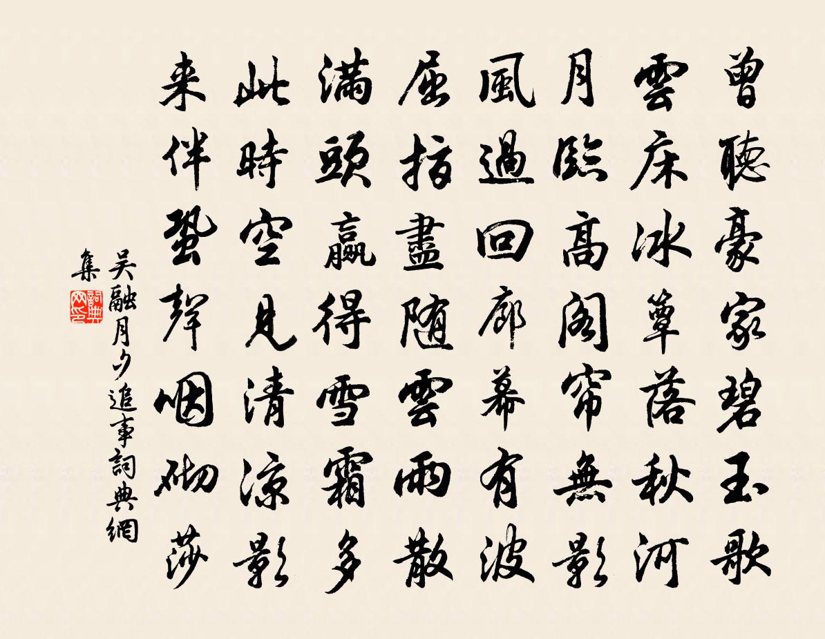 詩詞名句歷史字典書法欣賞書法字典國語詞典說文解字康熙字典古漢語字典標 題 作 者 詩 句 月夕追事作者:吳融 朝代:唐代月夕追事原文曾聽豪家碧玉歌,雲床冰簟落秋河。月臨高閣簾無影,風過迴廊幕有波。屈指盡隨雲雨散,滿頭贏得雪霜多。此時空見清涼影,來伴蛩聲咽砌莎。詩詞問答問:月夕追事的作者是誰?答:吳融問:月夕追事寫於哪個朝代?答:唐代問:月夕追事是什麼體裁?答:七律吳融月夕追事書法欣賞月夕追事書法作品注釋全唐詩:卷686-42詩詞推薦久旱喜雨韓維〔宋代〕炎風駕京塵,久旱氛祲惡。義和鞭日車,光焰赫飛躍。群生困熬暴,嘉俗坐焦灼。高堂袒褐臥,汗下如鞭索。安知暮秋陸游〔宋代〕清秋又是一年新,滿眼丹楓映白苹。海內故人書斷絕,汀洲鷗鷺卻心親。借虛谷太博狂吟十詩韻書懷並呈太博楊公遠〔宋代〕逕曲通村深復深,聽鶯吟歇聽蟬吟。園林幽雅已成趣,朝市紛華豈到心。匣冷馮驩長鋏劍,壁懸元亮不弦琴。故知喜雨呈梅石趙都大釋道璨〔宋代〕久旱天地焦,酷出秦法外。一雨中夜來,漢兵起豐沛。萬物皆吐氣,昭蘇脫厄會。憂國有天人,愛民如子輩。心香送明甫赴銅鉛場六言七首劉克莊〔宋代〕旦市有攫金者,地靈豈愛寶哉。零陵貪而乳盡,合浦清而蚌回。蘇州十詠其十南園范仲淹〔宋代〕西施台下見名園,百草千花特地繁。欲問吳王當日事,後來桃李若為言。九日即事雪中見菊家鉉翁〔宋代〕怪得西風吹袂涼,客中又過一重陽。今年喜見東籬雪,要與黃花共晚香。詠史詩霸陵胡曾〔唐代〕原頭日落雪邊雲,猶放韓盧逐兔群。況是四方無事日,霸陵誰識舊將軍?題王氏先壠壽松亭陳杰〔宋代〕兵前萬事舉頭非,風太無情宰木悲。馬鬣未隨陵欲變,龍髯還長子孫枝。會看高表鶴歸日,毋忘新栽鹿觸時。雨露風入松 與李仲輿敘舊邵亨貞〔元代〕小溪溪上十年游。酌酒對花謳。竹西歌吹曾同賞,到如今、夢裡楊州。綠髮潘朗老大,近來懶說風流。故人握手話師玿長老求贊釋宗杲〔宋代〕畫得百千本,都記祗這是。師玿好陰當,楊岐第七世。鞏北秋興,寄崔明允岑參〔唐代〕白露披梧桐,玄蟬晝夜號。秋風萬里動,日暮黃雲高。君子佐休明,小人事蓬蒿。所適在魚鳥,焉能徇錐刀。孤舟雪峰道院程公許〔宋代〕琅函真筌何所云,丈人嵯峨五嶽尊。矞雲護耀魄寶,寶繩夜低天市垣。瓊瑤其上矗千仞,冰雪為人醒醉魂。飛鴻沒皇太后合春帖子周南〔宋代〕當年三殿瑤池會,天仗將回樂未央。戲歲東朝還大內,仙韶遲上萬年觴。夷狄之孝十首若鞮單于林同〔宋代〕漢語雜胡語,堪嗤莽太愚。安知若鞮字,已是孝單于。和景韓贈子敬示章韻程公許〔宋代〕艷冶昭陽妃,嬌好浣妙女。盛時一轉盼,零落委黃土。彼姝秋胡婦,真節甘獨守。煒煒編簡上,芳聲乃持久。我欲寄灌頂長老釋如珙〔宋代〕半夜鶴鳴山月吟,山翁獨坐破柴床。幾番劫石成灰去,一點靈光照世明。魏太武廟劉克莊〔宋代〕荒涼瓜步市,尚有佛狸祠。俚俗傳來久,行人信復疑。亂鴉爭祭處,萬馬飲江時。意氣今安在,城笳暮更悲。故比部李郎中輓歌四首楊億〔宋代〕隴右華宗貴,朝端懿範存。哀烏光列宿,駟馬慶高門。謁帝承明署,娛賓金谷園。人生忽至此,天道亦難論。金剛隨機無盡頌能淨業障分第十六釋印肅〔宋代〕惡道自銷溶,因明智慧通。久客還元舍,不離舊家風。名句推薦世事茫茫難自料,春愁黯黯獨成眠。韋應物《寄李儋元錫》 從極迷處識迷,則到處醒;將難放懷一放,則萬境寬。陳繼儒《小窗幽記·集醒篇》 人道山長山又斷。蕭蕭微雨聞孤館。李清照《蝶戀花·淚濕羅衣脂粉滿》 君為女蘿草,妾作菟絲花。李白《古意》 花開紅樹亂鶯啼,草長平湖白鷺飛。徐元傑《湖上》 長江一帆遠,落日五湖春。劉長卿《餞別王十一南遊》 新園鎖卻愁陰,露黃漫委,寒香半畝。吳文英《瑞龍吟·送梅津》 淚彈不盡臨窗滴。就硯旋研墨。晏幾道《思遠人·紅葉黃花秋意晚》 柏府樓台銜倒影,茅茨松竹瀉寒聲。王守仁《次韻陸僉憲元日春晴》 竹邊荷外再相逢,又還是、浮雲飛去。趙以夫《鵲橋仙·富沙七夕為友人賦》