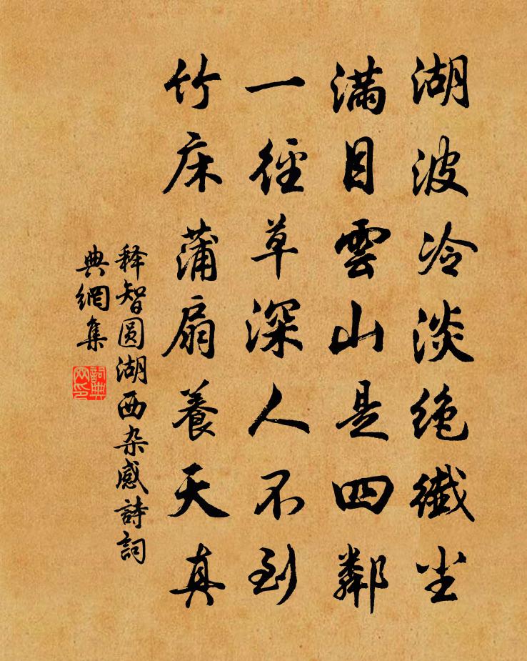 詩詞名句歷史字典書法欣賞書法字典國語詞典說文解字康熙字典古漢語字典標 題 作 者 詩 句 湖西雜感詩作者:釋智圓 朝代:宋代湖西雜感詩原文湖波冷淡絕纖塵,滿目雲山是四鄰。一徑草深人不到,竹床蒲扇養天真。詩詞問答問:湖西雜感詩的作者是誰?答:釋智圓問:湖西雜感詩寫於哪個朝代?答:宋代釋智圓湖西雜感詩書法欣賞湖西雜感詩書法作品詩詞推薦和康五庭芝望月有懷杜審言〔唐代〕明月高秋迥,愁人獨夜看。暫將弓並曲,翻與扇俱團。霧濯清輝苦,風飄素影寒。羅衣一此鑒,頓使別離難。固陵道中三首文天祥〔宋代〕茅舍荒涼舊固陵,漢王城對楚王城。徐州煙火連豐沛,天下還來屋角爭。送李尉以監丞致仁歸閩中司馬光〔宋代〕行行歌式微,浩吧返荊扉。卻著登山屐,盡焚趨府衣。溪清魚影亂,竹闇筍芽肥。應悔浮名誤,空將白髮歸。贈談命蘇秦方岳〔宋代〕一蓑牛背飽看山,扣角前岡煙雨寒。客自縱橫三尺觜,與吾煙雨不相干。海上作陸游〔宋代〕厭逐紛紛兒女曹,掛帆江海寄吾豪。鯨吞鼉作渾閒事,要看秋濤天際高。用五男兒再賦方回〔宋代〕每於生日賦新詩,似覺今年老更痴。竊謂齊公千駟馬,豈知陶氏五男兒。能拼久客常沉醉,不念全家慣忍飢。七十感物二首唐彥謙〔唐代〕騄驥初失群,亦自矜趫騰。俯仰歲時久,帖然困蚊蠅。豪鯨逸其穴,尺水成滄溟。豈無魚鱉交,望望為所憎。物理留題仙遊寺魏野〔宋代〕將從三峽泛扁舟,先向仙遊寺里游。水石卻驚偏怪異,江山狂興一時休。古道翁卷〔宋代〕古道今不見,今交非古情。交情亦何難,難逢雙目明。青松生青山,真節莫與並。植之廛郭旁,流俗多所輕。遠道禁菸留題錦屏山下四首邵雍〔宋代〕寒食風煙錦屏下,憑高把酒興何如。滿川桃李方妍媚,不忍重為風破除。游小圃宋祁〔宋代〕初陽未爇樹陰輕,中圃留連底有情。春草抽心終不死,夏禽反舌已無聲。轆轤半上畦泉逗,襫襏初休隴雨晴。紫蓼召公諫厲王止謗佚名〔先秦〕厲王虐,國人謗王。召公告曰:“民不堪命矣!”王怒,得衛巫,使監謗者。以告,則殺之。國人莫敢言,道路以李彥澤紫雲洞馮時行〔宋代〕玉帝侍臣紫雲翁,帝嗔謫居跨鰲峰。年齒瞬息反帝所,空有衣冠藏山中。山中草木俱不同,紫雲霏微氣鬱蔥。風清奉和拜洛應制李嶠〔唐代〕七萃鑾輿動,千年瑞檢開。文如龜負出,圖似鳳銜來。殷薦三神享,明禋萬國陪。周旗黃鳥集,漢幄紫雲回。日暮樂清道中二首葛紹體〔宋代〕雅淡風光近上元,迎神簫鼓自年年。客行不趁花燈市,月滿寒江水拍天。過淮梅堯臣〔宋代〕侍親數數來浮汴,護櫬迢迢復渡淮。旨蓄曾無禦寒具,細君唯有隱居釵。月銜遠入魚銜浪,潮退長汀蚌閣崖。素服志道相見和前韻吳芾〔宋代〕每憶湖山動老懷,今朝始作故鄉回。正慚行李匆匆去,忽報軺車得得來。幸對清談揮玉麈,肯辭痛飲倒金杯。我歸驅豎子摘蒼耳(即卷耳)杜甫〔唐代〕江上秋已分,林中瘴猶劇。畦丁告勞苦,無以供日夕。蓬莠獨不焦,野蔬暗泉石。卷耳況療風,童兒且時摘。侵星次韻游龍潭汪炎昶〔宋代〕我謾懷清賞,君夸是勝游。倦獨攀鳥道,渴欲飲龍湫。墨客工傅信,山靈凱闡幽。敢雲希作者,強把記文修。意難忘范晞文〔宋代〕清淚如鉛。嘆鹹陽送遠,露冷銅仙。岩花粉墮雪,津柳暗生煙。寒食後,暮江邊。草色更芊芊。四十年,留春意緒名句推薦墉集欺貓鼠,林藏逐雀鸇。徐威《中秋詠懷借杜子美秋日述懷一百韻和寄柳州假鳴桑先生》 來歲長安春事早,勸杏花、斷莫相思死。龔自珍《金縷曲·癸酉秋出都述懷有賦》 明月皎皎照我床,星漢西流夜未央。曹丕《燕歌行二首·其一》 欲系青春,少住春還去。朱淑真《蝶戀花·送春》 賢者在位,能者在職。孟子《孟子·公孫丑章句上·第四節》 萬里中原烽火北,一尊濁酒戍樓東。張孝祥《浣溪沙·霜日明霄水蘸空》 君子之學進於道,小人之學進於利。王通《中說·卷二·天地篇》 忍淚佯低面,含羞半斂眉。韋莊《女冠子·四月十七》 讀書無論資性高低,但能勤學好問,凡事思一個所以然,自有義理貫通之日王永彬《圍爐夜話·第十七則》 西宮南內多秋草,落葉滿階紅不掃。白居易《長恨歌》