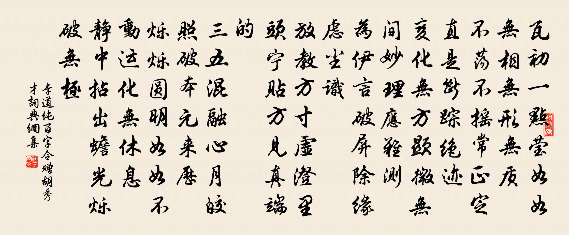 詩詞名句歷史字典書法欣賞書法字典國語詞典說文解字康熙字典古漢語字典標 題 作 者 詩 句 百字令 贈胡秀才作者:李道純 朝代:元代百字令 贈胡秀才原文瓦初一點,瑩如如、無相無形無質。不盪不搖常正定,直是斷蹤絕跡。變化無方,顯微無間,妙理應難測。為伊言破,屏除緣慮塵識。放教方寸虛澄,裡頭寧貼,方見真端的。三五混融心月皎,照破本元來歷。爍爍圓明,如如不動,運化無休息。靜中拈出,蟾光爍破無極。詩詞問答問:百字令 贈胡秀才的作者是誰?答:李道純問:百字令 贈胡秀才寫於哪個朝代?答:元代問:百字令 贈胡秀才是什麼體裁?答:詞李道純百字令 贈胡秀才書法欣賞百字令 贈胡秀才書法作品詩詞推薦送范漕赴召八絕洪咨夔〔宋代〕天道頻年說好還,到今胡壒沒天山。延英為奏平戎策,只在人心國勢間。擬古黃庚〔宋代〕山中怪物變,草木自四時,秋水照短髮,血氣日已衰。寒藤不知枯,青表上疏籬。繁陰縱有托,已迫風霜期。餘生和邑大夫勸駕韻劉宰〔宋代〕自笑當年躣冶金,老來文物見彬彬。登名已喜多三邑,擢秀縣知敵萬人。晴日琴堂開宴好,春風瓊苑拜恩新。惟餘月珠寺明月樓程少逸〔宋代〕飲罷茶甌未有言,各歸窗底默參禪。僧房睡息齁齁起,倒著繩床我亦眠。沙苑行杜甫〔唐代〕君不見左輔白沙如白水,繚以周牆百餘里。龍媒昔是渥窪生,汗血今稱獻於此。苑中騋牝三千匹,豐草青青寒不死南山下舊居閒放張九齡〔唐代〕祗役已雲久,乘閒返服初。塊然屏塵事,幽獨坐林閭。清曠前山遠,紛喧此地疏。喬木凌青靄,修篁媚綠渠。耳和寄題八桂張松卿義莊楊萬里〔宋代〕張氏避氈裘,邢遷來桂州。買田同族食,作計豈孫謀。公藝君今是,希文古罕儔。荊花再連理,萓草更千秋。卜運算元呂渭老〔宋代〕得酒解愁煩,多病還疏酒。本是多情失意人,此味如何受。沈醉且高歌,不飲心常有。守著殘燈斗著眉,怎不腰肢欲出遇雨陸游〔宋代〕東風吹雨惱遊人,滿路新泥換細塵。花睡柳眠春自嬾,誰知我更嬾於春!偈六十九首釋道寧〔宋代〕選得幽居愜野情,終年無送復無迎。有時直上孤峰頂,月下披雲嘯一聲。漫成呈文潛五首晁補之〔宋代〕平時無歡苦易醉,自怪飲樂顏先酡。乃知醉人不是酒,真是情多非酒多。送洞霄宮王文玉學士歸吳蘇頌〔宋代〕仙都補吏向天涯,歸棹南遊事事嘉。冬課洞庭千戶橘,春嘗石縫一槍茶。蓬山厭直拋鉛摘,公府傷離念棣華。二紀孫知微畫文同〔宋代〕太古奇偉士,精思獨於畫。馳心入茫昧,萬物赴揮灑。當時一名重,顧陸非爾亞。卓哉青城筆,妙絕冠天下。寥寥朝陽穿破衲贊釋慧開〔宋代〕冷時急用之物,趁暖著些針線。忽然臘月到來,免致腳忙手亂。醉歌贈鄒孝忠敖陶孫〔宋代〕老鄒草檄如吹律,能令陰谷回陽春。手提赤心獻天了,布衫麻鞋驚市人。戈船上噓五里霧,詔發內府捐金銀。進賢昭德皇后輓歌詞白居易〔唐代〕仙去逍遙境,詩留窈窕章。春歸金屋少,夜入壽宮長。鳳引曾辭輦,蠶休昔採桑。陰靈何處感?沙麓月無光。疇依王柏〔宋代〕湯聘莘尹,五進就桀。天命人歸,鳴條自葛。以義制事,以禮制心。日新厥德,鑒此盤銘。同郭十題楊主簿新廳高適〔唐代〕華館曙沈沈,惟良正在今。用材兼柱石,聞物象高深。更得芝蘭地,兼營枳棘林。向風扃戟戶,當署近棠陰。勿改用石塘二林韻劉克莊〔宋代〕夜績旁邊映隙光,憶曾參扣遍諸方。掃眉眾女偏謠諑,開口群兒亦謗傷。後有知音分雅鄭,今誰協律譜宮商。戲衫酬王判官和九日韻陳傅良〔宋代〕翩翩公子一何佳,銜金窮山薄歲華。獨自把將詩過日,不知梅影下窗紗。名句推薦佳辰強飲食猶寒,隱几蕭條戴鶡冠。杜甫《小寒食舟中作》 野臣潛隨擊壤老,日下鼓腹歌可封。鮑防《元日早朝行》 莫見長安行樂處,空令歲月易蹉跎。李頎《送魏萬之京》 升堂坐階新雨足,芭蕉葉大梔子肥。韓愈《山石》 三年不翅,將以長羽翼;不飛不鳴,將以觀民則。雖無飛,飛必沖天;雖無鳴,鳴必驚人。韓非及後人《韓非子·喻老》 在善用,不在眾。宋祁、歐陽修、范鎮、呂夏卿等《新唐書·列傳·卷三十六》 已知泉路近,欲別故鄉難。夏完淳《別雲間》 秋晚佳晨重物華,高台復帳駐鳴笳。宋祁《九日置酒》 萬里浮雲卷碧山,青天中道流孤月。李白《答王十二寒夜獨酌有懷》 人皆作之。作之不止,乃成君子司馬光《資治通鑑·秦紀·秦紀一》