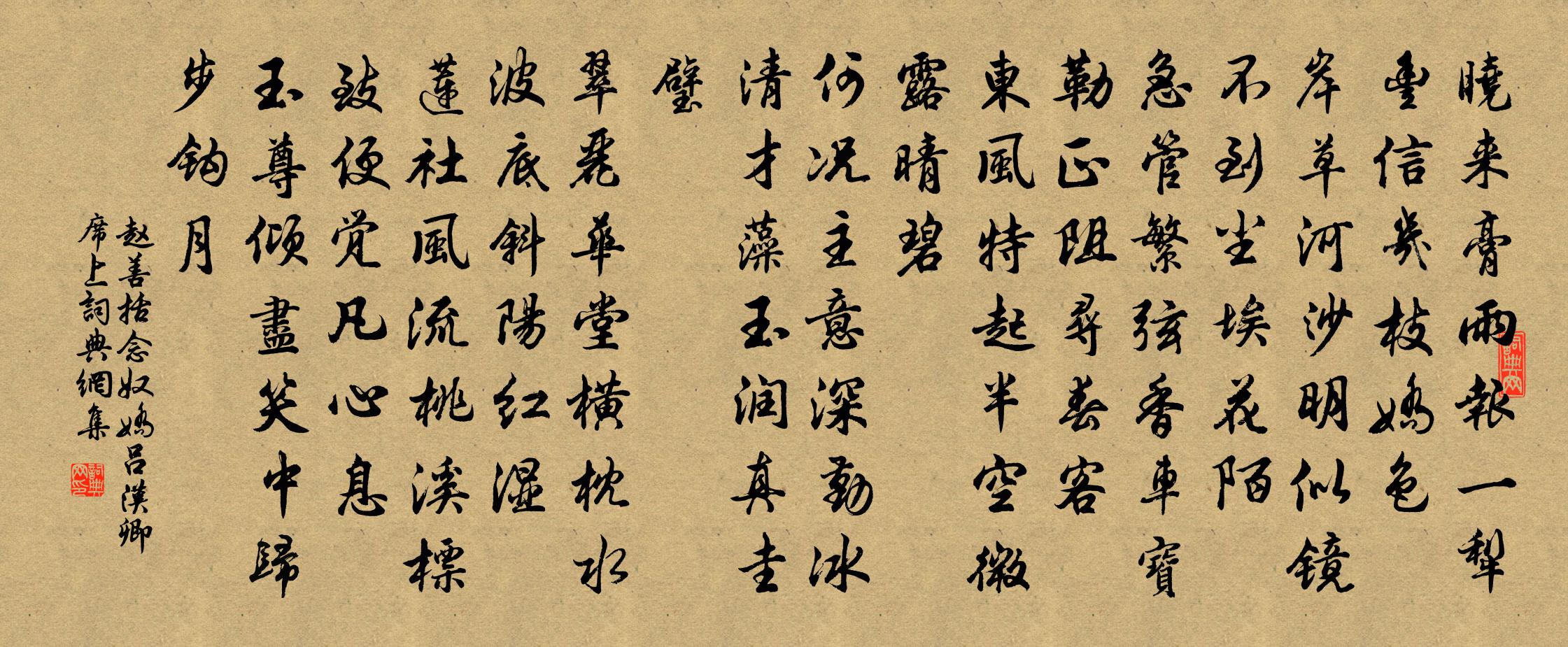 詩詞名句歷史字典書法欣賞書法字典國語詞典說文解字康熙字典古漢語字典標 題 作 者 詩 句 念奴嬌(呂漢卿席上)作者:趙善括 朝代:宋代念奴嬌(呂漢卿席上)原文曉來膏雨,報一犁豐信,幾枝嬌色。岸草河沙明似鏡,不到塵埃花陌。急管繁弦,香車寶勒,正阻尋春客。東風特起,半空微露晴碧。何況主意深勤,冰清才藻,玉潤真圭璧。翠麗華堂橫枕水,波底斜陽紅濕。蓮社風流,桃溪標緻,便覺凡心息。玉尊傾盡,笑中歸步鉤月。詩詞問答問:念奴嬌(呂漢卿席上)的作者是誰?答:趙善括問:念奴嬌(呂漢卿席上)寫於哪個朝代?答:宋代問:念奴嬌(呂漢卿席上)是什麼體裁?答:詞趙善括念奴嬌(呂漢卿席上)書法欣賞念奴嬌(呂漢卿席上)書法作品詩詞推薦梅{上艹下撩}方蒙仲〔宋代〕商家宰相羹,周代籩人供。自古實為先,唐後花始重。山中立夏用坐客韻文天祥〔宋代〕歸來泉石國,日月共溪翁。夏氣重淵底,春光萬象中。窮吟到雲黑,淡飲勝裙紅。一陣弦聲好,人間解慍風。烽火韓愈〔唐代〕登高望烽火,誰謂塞塵飛。王城富且樂,曷不事光輝。勿言日已暮,相見恐行稀。願君熟念此,秉燭夜中歸。我歌偈頌十一首釋了演〔宋代〕四海共遵靈鷲制,九旬禁足自蕭然。飢餐渴飲隨緣過,禪道是非掃一邊。知我者謂我深錐痛劄,不知我者謂我弔影禪人並化主寫真求贊釋正覺〔宋代〕山向岳奔,川趨海吞。船浮水柔有力,雁沒煙冷無痕。二三四七,傳持之句。百千萬億,變化之門。招手授手,知欲到西陵寄王行周李紳〔唐代〕西陵沙岸回流急,船底粘沙去岸遙。驛吏遞呼催下纜,棹郎閒立道齊橈。猶瞻伍相青山廟,未見雙童白鶴橋。欲責琅琊山六題石屏路歐陽修〔宋代〕石屏自倚浮雲外,石路久無人跡行。我來攜酒醉其下,臥看千峰秋月明。同安劉克莊〔宋代〕城不能高甫及肩,臨風搔首一懷賢。當時矮屋今存否,曾著文公住四年。再用九日韻答何邵卿二首李石〔宋代〕老蝶凌風作晚狂,小春爭得媚寒鄉。池邊團碧擎殘雨,林末輕紅拒薄霜。笑我何時書竹帛,似君依舊踏槐黃。相尋甲申元日王夢應〔宋代〕上日仍漂寄,尊前又客非。鄉心眠聽雨,病骨晚添衣。街鼓春將動,簾燈寒未歸。梅花經一雪,幾片不曾飛。清曉出城別王宜子舍人楊萬里〔宋代〕月細惟愁落,陽升未要忙。出門雞未覺,夾路稻初香。涉世寧容嬾,侵星幸稍涼。病來詩久廢,覓句費商量。四月九日幽谷見緋桃盛開歐陽修〔宋代〕經年種花滿幽谷,花開不暇把一卮。人生此事尚難必,況欲功名花鼎彝。深紅淺紫看雖好,顏色不柰東風吹。緋桃雜詠陸游〔宋代〕石犀廟壖江已回,陵谷一變吁可哀。即今禾黍連雲處,當日帆檣隱映來。高陽台(送翠英)蔣捷〔宋代〕燕卷晴絲,蜂黏落絮,天教綰住閒愁。閒里清明,匆匆粉澀紅羞。燈搖縹暈茸窗冷,語未闌、娥影分收。好傷情,水調歌頭(秀州坐上作)趙彥端〔宋代〕秋色忽如許,風露皎如空。平生青鬢餘地,老與故人同。憶得鱸魚來後,雜以洞庭新橘,月墮酒杯中。賓客可人意寒山拾得望月贊釋法薰〔宋代〕木葉題詩,寺廚執爨。遇夜乘閒,林間舒散。一片冰壺無影像,分明照破渠肝膽。堪笑當時天台山中,也無一個具日本雲上人請贊釋妙倫〔宋代〕山頭雲,天上月。雲月有殊,光影無別。此是吾端的,不許見,不許聞。大唐國有人,必能辨,必能別。不妨捲去漢南書事李商隱〔唐代〕西師萬眾幾時回,哀痛天書近已裁。文吏何曾重刀筆,將軍猶自舞輪台。幾時拓土成王道,從古窮兵是禍胎。陛下滿江紅 授覺庵李道純〔元代〕道本自然,但有為、頭頭是錯。若一味談空,如何摸索。無有雙忘終不了,兩邊兼用遭纏縛。都不如、默默守其中齊子余母太夫人王氏輓詩蔡戡〔宋代〕石窌恩雖渥,蘭陔事已非。升堂人不見,執紼淚頻揮。樹競晚風急,草明朝露晞。他年黃合宴,不及奉慈闈。名句推薦惜恐鏡中春。不如花草新。張先《菩薩蠻·憶郎還上層樓曲》 拱木不生危,松柏不生埤。左丘明《國語·晉語·醫和視平公疾》 長江春水綠堪染,蓮葉出水大如錢。張籍《春別曲》 柳柔搖不定,草短綠應難。張惠言《風流子·出關見桃花》 竭澤而漁,豈不獲得?而明年無魚;焚藪而田,豈不獲得?而明年無獸。呂不韋《呂氏春秋·覽·孝行覽》 煢煢白兔,東走西顧。佚名《古艷歌》 綺席凝塵,香閨掩霧。晏殊《踏莎行·碧海無波》 其山水揀乳泉、石池漫流者上;其瀑涌湍漱,勿食之。陸羽《茶經·五之煮》 澗戶寂無人,紛紛開且落。王維《辛夷塢》 故人相望若為情。別愁深夜雨,孤影小窗燈。陳克《臨江仙·四海十年兵不解》