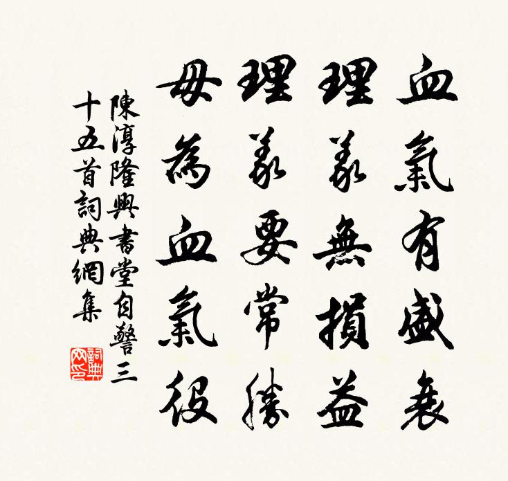 詩詞名句歷史字典書法欣賞書法字典國語詞典說文解字康熙字典古漢語字典標 題 作 者 詩 句 隆興書堂自警三十五首作者:陳淳 朝代:宋代隆興書堂自警三十五首原文血氣有盛衰,理義無損益。理義要常勝,毋為血氣役。詩詞問答問:隆興書堂自警三十五首的作者是誰?答:陳淳問:隆興書堂自警三十五首寫於哪個朝代?答:宋代陳淳隆興書堂自警三十五首書法欣賞隆興書堂自警三十五首書法作品詩詞推薦秋窗雜興高吉〔宋代〕月郎眾星稀,天高萬籟息。草露濕秋蟲,悲悽聲唧唧。隔窗聽鳴機,寒光曙猶織。微物固催人,尤為貧女惜。翻經台姚鉉〔宋代〕康樂悟玄機,寂寥此棲息。經翻貝葉文,台近蓮華石。山居雜詩九十首曹勛〔宋代〕台蕈甘擅名,油蔥芼枯臘。及居台山下,生致出岩隙。丁頭形磷磷,雞股香羃羃。清對雲水客,葷素得共食。旦起陸游〔宋代〕地爐晨起撥寒灰,困睫蒙蒙尚嬾開。正倚 * 覓殘夢,一聲啼鳥又驚回。山間偶成二絕王炎〔宋代〕隔枝啼鳥喚幽夢,排闥青山無世情。綠樹陰陰遮日影,虛窗臥看白雲行。頌古四首釋景元〔宋代〕阿家新婦最相憐,新婦騎驢家便牽。幾度醉歸明月夜,笙歌引入畫堂前。偈頌一百零二首釋紹曇〔宋代〕薄福住山,渾無暇日。忙時直是閒,緩處非常急。驅園夫奴子,鋤菜地,掃松行;指莫監楊協團,拆東籬,補西壁元寂宮生祠行洪咨夔〔宋代〕間台珍館嚴鶴林,老桂鉅竹籠春陰。騎鶴仙翁杳莫尋,適從何來貂插金。裳佩丹青雜璆琳,旗旛繡采薰甲沉。蕊函朝中措張綱〔宋代〕日也前年初對大明宮。寒律轉春風。幾度鄉關歸夢,催成兩鬢霜蓬。山州歲晚,還逢令節,空記前蹤。莫遣酒兵相物外雜題陸游〔宋代〕高城今曠野,比屋昔朱門。道上傳呼過,遙遙幾世孫?偈頌一百零四首釋紹曇〔宋代〕錦鏡濃妝十樣花,練拖寒瀑掛蒼崖。無賓主句全機露,見得分明眼著砂。依亡妙盡,猶隔天涯。奪取黃梅無底缽,送青神宰樊允南解官次杜應求韻史堯弼〔宋代〕從昔安平易,無心問疾遲。才知中自守,不逐世多岐。赫赫寧期譽,悠悠去有思。豐碑人口是,看取祖行詩。寄趙宣教釋寶曇〔宋代〕卻立群峰北望看,斷虹飛雨即家山。一時別舸惟公在,半世清游比夢閒。卜築未嫌身老大,著書先怯眼斕斑。湖西寄玉梁施道士林逋〔宋代〕子云遺構住丹房,天鼓時聞數叩霜。真景截波尋鐵柱,怪書披月看銅牆。氳氳顥氣朝胎息,熠熠辰輝夜步網。大靜水調歌/水調蘇軾〔宋代〕我歌月徘徊,我舞影凌亂。醉落魄/一斛珠史達祖〔宋代〕江痕妥帖。日光熨動黃金葉。闌乾直下愁相接。一朵紅蓮,飛上越人楫。鯉魚波上丁寧切。詩筒如線不曾別。明年舟行即事陳造〔宋代〕昨日出曹娥,明日指慈谿。待潮舟為膠,得潮舟若蜚。留滯復一快,計程元不遲。人生意失得,孰者乘除之。今天送洛陽韓丞東遊韋應物〔唐代〕仙鳥何飄颻,綠衣翠為襟。顧我差池羽,咬咬懷好音。徘徊洛陽中,遊戲清川潯。神交不在結,歡愛自中心。駕言大雨後詠南軒竹二絕句蘇轍〔宋代〕葉開翡翠才通日,節竦琅玕不怕風。稍放西邊深二丈,端如幽谷茂林中。春日田園雜興三首戴東老〔宋代〕飲了椒盤收了燈,翁摧稚子步新晴。茅柴初熟勝胝醖,萊服久半宜晚羹。伏卯難留上春種,出欄牛試吉辰耕。去年名句推薦洞庭青草,近中秋,更無一點風色。張孝祥《念奴嬌·過洞庭》 若非群玉山頭見,會向瑤台月下逢李白《清平調·其一》 利之所在,雖千仞之山無所不上,深源之下,無所不入焉。管仲《管子·禁藏》 逆其根則伐其本,壞其真矣。佚名《黃帝內經·四氣調神大論》 同聲相應,同氣相求。佚名《易傳·乾文言》 一道鵲橋橫渺渺,千聲玉佩過玲玲。徐凝《七夕》 紅樓隔雨相望冷,珠箔飄燈獨自歸。李商隱《春雨》 微暈嬌花濕欲流,簟紋燈影一生愁。納蘭性德《浣溪沙·詠五更和湘真韻》 盡道隋亡為此河,至今千里賴通波。皮日休《汴河懷古二首》 不知何日始工愁。記取那回花下一低頭。王國維《虞美人·弄梅騎竹嬉遊日》
