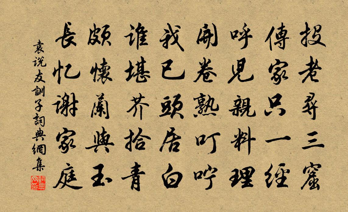 詩詞名句歷史字典書法欣賞書法字典國語詞典說文解字康熙字典古漢語字典標 題 作 者 詩 句 訓子作者:袁說友 朝代:宋代訓子原文投老尋三窟,傳家只一經。呼兒親料理,開卷熟叮嚀。我已頭居白,誰堪芥拾青。頗懷蘭與玉,長憶謝家庭。詩詞問答問:訓子的作者是誰?答:袁說友問:訓子寫於哪個朝代?答:宋代袁說友訓子書法欣賞訓子書法作品詩詞推薦三用喜雨韻三首吳潛〔宋代〕電掣金蛇跨列岑,秋陽翕忽轉秋陰。俄驚石鼓無停響,坐聽檐花不斷音。玉秫已堪供翁釀,紫螯漸可付庖砧。一年宮詞楊皇后〔宋代〕內園昨夜報花開,中外喧轉玉輦來。遙望紅妝撩亂處,人人爭獻萬年杯。負暄曾幾〔宋代〕炙背茅檐日,雖貧辦不難。趙衰真可愛,范叔一何寒。虱暖無遺索,書明得細看。羲和有底急,薄暮更衣單。酒為偷兒所竊吳芾〔宋代〕我性苦拙疏,與世不相偶。平生不如意,往往十 * 。何以遣此懷,賴有樽中酒。去冬釀碧香,頗不計升斗。準擬和三十郎蠟梅韻曹彥約〔宋代〕官黃新賜極恩榮。花不同梅與共名。頗謂寒中宜作伴,想因開早更為兄。世間何物疑真蠟,海上新來染碎瓊。體得山園小梅得疏影橫斜水清淺暗香浮動月黃十四趙時韶〔宋代〕春在枝頭有淺深,疏疏冷冷小溪陰。好風一陣香如洗,明月三更影不沉。題春江漁父圖楊維楨〔元代〕一片青天白鷺前,桃花水泛住家船。呼兒去換城中酒,新得槎頭縮項鯿。常州先生以太守入對五首趙蕃〔宋代〕姑蘇訪虎丘,西庵作清游。能談著書人,老僧非黑頭。義興望荊溪,景坡亦前修。不能乘桴者,滄波沒白鷗。哭郭仲微三首宋祁〔宋代〕倉卒聞嬰疾,何辜遂沒身。哭筵同產子,霜寢未亡人。冢有邢山舊,天為京兆鄰。想君齎志恨,不使白楊春。括水調歌林正大〔宋代〕落日峴山下,倒著接?回。傍人笑問山翁。日日醉歸來。三萬六千長日,一日杯傾三百,罍麴恐糟台。漢水鴨頭綠句諶祜〔宋代〕雁過大江風帖帖,雅啼荒樹日悠悠。水仙操李鹹用〔唐代〕 * 相拍流水鳴,蓬山鳥獸多奇形。琴心不喜亦不驚,安弦緩爪何泠泠?水仙縹緲來相迎,伯牙從此留嘉名。嶧陽席君從於洛城種金橘今秋始結六實以其四獻開司馬光〔宋代〕圓小香黃珠顆垂,結成洛邑重霜時。相公和氣陶群物,不是寒溫變土宜。夏日寺中有懷薛能〔唐代〕亭午四鄰睡,院中唯鳥鳴。當門塞鴻去,欹枕世人情。地燥蒼苔裂,天涼晚月生。歸家豈不願,辛苦未知名。馮中郎廟陳淳〔宋代〕為問中郎昔抗忠,力箴頗牧不能庸。如今疆場多塵擾,頗牧還能容不容。盤車圖歐陽修〔宋代〕淺山嶙嶙,亂石矗矗,山石磽聱車碌碌。山勢盤斜隨澗谷,側轍傾轅如欲覆。出乎兩崖之隘口,忽見百里之平陸。自賦高翥〔宋代〕蝸角蠅頭總是虛,何須留戀市朝居。老於親戚情當密,貧與公卿分合疏。小澗草荒元種菊,故山塵滿舊抄書。幾時蓮花莊楊蟠〔宋代〕會昌湖上客,今已化為塵。一束青芻奠,空思如玉人。別劉郎陳師道〔宋代〕一別已六載,相逢有餘哀。公私兩多事,災病百相催。無酒與君別,有懷向誰開。深知百里遠,肯為老夫來。又二首劉克莊〔宋代〕萊菔可虀秔可炊,絕勝遠訪碧溪祠。渠能去伴舒為誥,時有來聽鼎說詩。江夏奇童今屬子,金華仙伯更傳誰。錦囊名句推薦運往無淹物,年逝覺已催。謝靈運《歲暮》 碧水浩浩雲茫茫,美人不來空斷腸。李白《早春寄王漢陽》 隔座送鉤春酒暖,分曹射覆蠟燈紅。李商隱《無題·昨夜星辰昨夜風》 寒來暑往,秋收冬藏。周興嗣《千字文·全文》 春雨斷橋人不度,小舟撐出柳陰來。徐俯《春遊湖》 天下神器,不可為也,不可執也。為者敗之,執者失之。老子《老子·道經·第二十九章》 綠波春浪滿前陂,極目連雲稏肥。韋莊《稻田》 風雨端陽生晦冥,汨羅無處吊英靈。貝瓊《已酉端午》 有客躊躇,古庭空自吊孤影。史達祖《齊天樂·中秋宿真定驛》 終日兩相思。為君憔悴盡,百花時。溫庭筠《南歌子·倭墮低梳髻》