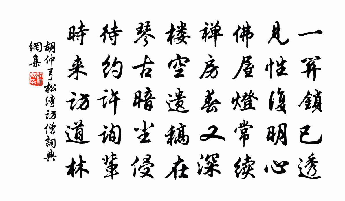 詩詞名句歷史字典書法欣賞書法字典國語詞典說文解字康熙字典古漢語字典標 題 作 者 詩 句 松灣訪僧作者:胡仲弓 朝代:宋代松灣訪僧原文一關鎖已透,見性復明心。佛屋燈常續,禪房春又深。樓空遺稿在,琴古暗塵侵。待約許詢輩,時來訪道林。詩詞問答問:松灣訪僧的作者是誰?答:胡仲弓問:松灣訪僧寫於哪個朝代?答:宋代胡仲弓松灣訪僧書法欣賞松灣訪僧書法作品詩詞推薦四月六日絕糧用銀盞易谷作詩別之舒岳祥〔宋代〕從此與君別,臨行更一傾。縱令愁作海,誰送酒如澠。已悟興亡理,空留物我情。不知陶靖節,何物了平生。雨雪雜下鄭獬〔宋代〕雨鬧雪聲相雜下,飄蕭密勢灑空來。北風有意待寒臘,只放飛花一半開。予賦雁湖詩蒙友社諸文繼聲不一輒復自和四首李壁〔宋代〕閒來日日理荒余,剩引漣漪一派俱。試把漁竿臨斷岸,從教畫手貌成圖。啼春不到鶯無友,警夜誰知雁有奴。出處柳釋紹嵩〔宋代〕江頭楊柳麴塵姿,斜壓漁家短短籬。日暖遊絲飛絮落,和風得路合偏吹。偈頌一百零四首釋紹曇〔宋代〕秋氣肅金,秋晹鏖戰。林間秋葉片片凋零,砌下秋蟲聲悽怨。滿眼聽不聞,滿耳覷不見。聽得聞,覷得見,聲前句湘中紀行十首雲母溪劉長卿〔唐代〕雲母映溪水,溪流知幾春。深藏武陵客,時過洞庭人。白髮慚皎鏡,清光媚奫淪。寥寥古松下,歲晚掛頭巾。寄韓子云二首吳芾〔宋代〕去歲花時許我來,花前竟阻共銜杯。如今又是花開也,忍使衰翁獨看梅。十喻詩 幻詩蕭衍〔南北朝〕揮霍變三有。恍惚隨六塵。蘭園種五果。雕案出八珍。對見不可信。熟視事非真。空生四岳想。徒勞七識神。著幻題孟浩然畫像黃庭堅〔宋代〕先生少也隱鹿門,爽氣洗盡塵埃昏。賦詩真可凌鮑謝,短褐豈愧公卿尊。故人私邀伴禁直,誦詩不顧龍鱗逆。風雲屣步訪魯望不遇皮日休〔唐代〕雪晴墟里竹欹斜,蠟屐徐吟到陸家。荒徑掃稀堆柏子,破扉開澀染苔花。壁閒定欲圖雙檜,廚靜空如飯一麻。擬受效古·其一歲暮懷江淹〔南北朝〕其一歲暮懷感傷,中夕弄清琴。戾戾曙風急,團團明月陰。孤雲出北山,宿鳥驚東林。誰謂人道廣,憂慨自相尋。誠齋題三老圖楊萬里〔宋代〕且奭行間著季真,黃冠不合附青雲。二南風裡君知麽,添個委蛇退食人。劉郎寫照妙通神,三老圖成又一新。只道題閻立本北齋較書圖呂諤〔宋代〕由余入秦毀詩書,意在兵強黔首愚。弊極煨燼幾無餘,高齊風俗元自殊。豈料乃喜知卷舒,況復是正叢冠裾。公言句鮮于能〔宋代〕金山一拳石,石髻出溟漲。躍馬西湖趙善括〔宋代〕曉來何事到湖西,風急飛紅襯馬蹄。望信只愁秋雁斷,愛春還恨早鶯啼。山連樓閣雲容重,水浸欄乾月影低。歸棹松江送處州奚使君劉禹錫〔唐代〕吳越古今路,滄波朝夕流。從來別離地,能使管弦愁。江草帶煙暮,海雲含雨秋。知君五陵客,不樂石門游。彭州歌汪元量〔宋代〕彭州昔號小成都,城市繁華錦不如。尚有遺儒頭雪白,見人猶自問詩書。彭州又曰牡丹鄉,花月人稱小雒陽。自笑惜黃花宋先生〔宋代〕天機大道。達者稀少。運戊己、龍蟠更虎繞。這一顆丹砂,凡世人難曉。間木金、坎離顛倒。陽全陰盡,形容不老次彭資深韻劉子翬〔宋代〕林下相從多勝友,誰如君子妙才華。曳裾所至成師席,射策由來有世家。意氣胸中千里駿,文詞筆下九光霞。郵亭代贈李商隱〔唐代〕楊柳路盡處,芙蓉湖上頭。雖同錦步障,獨映鈿箜篌。鴛鴦可羨頭俱白,飛去飛來煙雨秋。名句推薦荷風送香氣,竹露滴清響。孟浩然《夏日南亭懷辛大》 非淡泊無以明志,非寧靜無以致遠。諸葛亮《誡子書》 為近都門多送別,長條折盡減春風。白居易《青門柳》 攻人之惡毋太嚴,要思其堪受;教人以善毋過高,當使其可從。洪應明《菜根譚·概論》 一身虜雲外,萬里胡天西。岑參《早發焉耆懷終南別業》 丈夫貧賤應未足,今日相逢無酒錢。高適《別董大二首》 朱門酒肉臭,路有凍死骨。杜甫《自京赴奉先縣詠懷五百字 / 自京赴奉先詠懷五百字》 得饒人處且饒人。曹雪芹《紅樓夢·第五十九回》 山致其高而雲雨起焉,水致其深而蛟龍生焉,君子致其道而德澤流焉。文子《文子·卷六·上德》 當君懷歸日,是妾斷腸時。李白《春思》