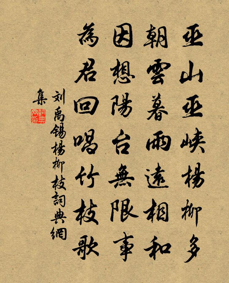 詩詞名句歷史字典書法欣賞書法字典國語詞典說文解字康熙字典古漢語字典標 題 作 者 詩 句 楊柳枝作者:劉禹錫 朝代:唐代楊柳枝原文巫山巫峽楊柳多,朝雲暮雨遠相和。因想陽台無限事,為君回唱竹枝歌。詩詞問答問:楊柳枝的作者是誰?答:劉禹錫問:楊柳枝寫於哪個朝代?答:唐代問:楊柳枝是什麼體裁?答:樂府問:劉禹錫的名句有哪些?答:劉禹錫名句大全劉禹錫楊柳枝書法欣賞楊柳枝書法作品詩詞推薦送黃天河樂雷發〔宋代〕天河那可到,山頂翠參差。村屋煎黃蠟,官爐焙荔支。地蠻遊宦少,縣小迓賓遲。鼻祖曾吟處,荒苔想滿碑。送葉表侄歸鄉袁說友〔宋代〕枌榆離別幾春秋,作計吳中只謬悠。回首故園三嘆息,喜公歸路兩經由。懷鄉誰不思邱首,遊宦余方愧督郵。千里小桂二首陳杰〔宋代〕樹小都來三尺長,撩人那得許生香。隔窗只道花如簇,才是梢頭一粟黃。水龍吟(長沙後圃荷開之久,無人領略,賦此詞,具一杯招管順甫諸公)李曾伯〔宋代〕此花迥絕他花,湘中不減吳中盛。疑從太華,分來嶽麓,根荄玉井。炬列千紅,蓋擎萬綠,織成雲錦。向壺天清暑贈泰霞真士祈雨之驗林景熙〔宋代〕火旗焰焰燒刊垠,蒺藜滿道風揚塵。槁苗無花不作谷,老農扶杖田頭哭。哭聲不為填溝渠,室罄何以供官輪。檄龍雨中作陸游〔宋代〕山雨時時急,溪流日日添。濕苔緣暗壁,腐瓦落頹檐。老至那容卻,狂來未易砭。泥深村路絕,煙樹出青簾。方紅方岳〔宋代〕群仙南遊三神山,親留冰丹祛暑袢。蕊珠侍宕輒分似,我其詩之累百番。閶門行送鬍子遠著作守漢川范成大〔宋代〕前年送君朝明光,今年送君還故鄉。錦官樓上一樽酒,萬里閶門折楊柳。吳波沄沄蜀山蒼,人生行路如許長。相逢續謠佚名〔唐代〕評事不讀律,博士不尋章。糊心宣撫使,眯目聖神皇。寄題盤山雲峰通濟橋二首曾豐〔宋代〕通往通來無四旁,津梁未必不相妨。吾行拗折津樑柱,盡放途入蹈大方。雪中答僧書熊孺登〔唐代〕八行銀字非常草,六出天花儘是梅。無所與陳童子別,雪中辛苦遠山來。一剪梅/一翦梅佚名〔宋代〕太華峰頭□□蓮。聞十丈,藕大如船。曉來佳氣藹飛煙。彩戲盈門。弧矢盈門。共把長生酒一樽。殷勤祝願,耳畔和馬寺丞秋日寄明復先生石介〔宋代〕秋陰閉秋色,何處動悲涼。有叟傅岩隱,明時潘鬢蒼。殘書幾篋蠹,寒菊半離荒。惟學春秋者,時時到草堂。湖上喜晴方回〔宋代〕人閒塵不到,別是一清涼。雨足千峰淨,風薰百草香。陰森穿茂密,汩虢溯深長。想見吳中路,連天盡綠秧。冬暖楊萬里〔宋代〕小春活脫是春時,霜熟風酣日上遲。晚蝶頻移獵殘蕊,驚禽衝過倒垂枝。暫閒何似長閒好,無事非關了事痴。三徑寓宿洞霄釋寶印〔宋代〕窈窕門前九鎖山,琮琤石角千層水。白雲影里閱群仙,風斷木犀香未已。我從青城大面來,羽衣駕鶴欣相陪。五峰山中吟釋文珦〔宋代〕受性不分拿,處身常落魄。難以事王侯,唯堪友猨鶴。遂爾辭國都,終然住林壑。渴則飲澗豀,飢則茹薇藿。煙霞初九夜月二首楊萬里〔宋代〕珍重姮娥住廣寒,不餐火食不餐煙。秋空拾得一團餅,隨手如何失半邊。次韻斯遠同彥章見過之作趙蕃〔宋代〕昔人結交談耳餘,一朝變起肝腦塗。吾曹結交自有道,嗜好又況子與余。每憶見君吾里初,中間去君落江湖。歸來梅花三首王鎡〔宋代〕茅屋寂寂煙冥冥,紙帳曉眠人未起。天風吹動笛聲寒,春滿江南冰雪裡。名句推薦煙霏雲斂;其容清明,天高日晶;歐陽修《秋聲賦》 雁行緣石徑,魚貫度飛梁。鮑照《代出自薊北門行》 雪雰雰而薄木兮,雲霏霏而隕集。劉向《九嘆》 少年心事當拿雲,誰念幽寒坐嗚呃。李賀《致酒行》 晻靄寒氛萬里凝,闌乾陰崖千丈冰。岑參《天山雪歌送蕭治歸京》 行路難!行路難!多歧路,今安在?李白《行路難三首》 客思似楊柳,春風千萬條。王安石《壬辰寒食》 酒酣應對燕山雪,正冰河月凍,曉隴雲飛。周密《高陽台·送陳君衡被召》 不似春風逞紅艷,鏡前空墜玉人釵。司空圖《華下對菊》 脈脈花疏天淡,雲來去、數枝雪。范成大《霜天曉角·梅》