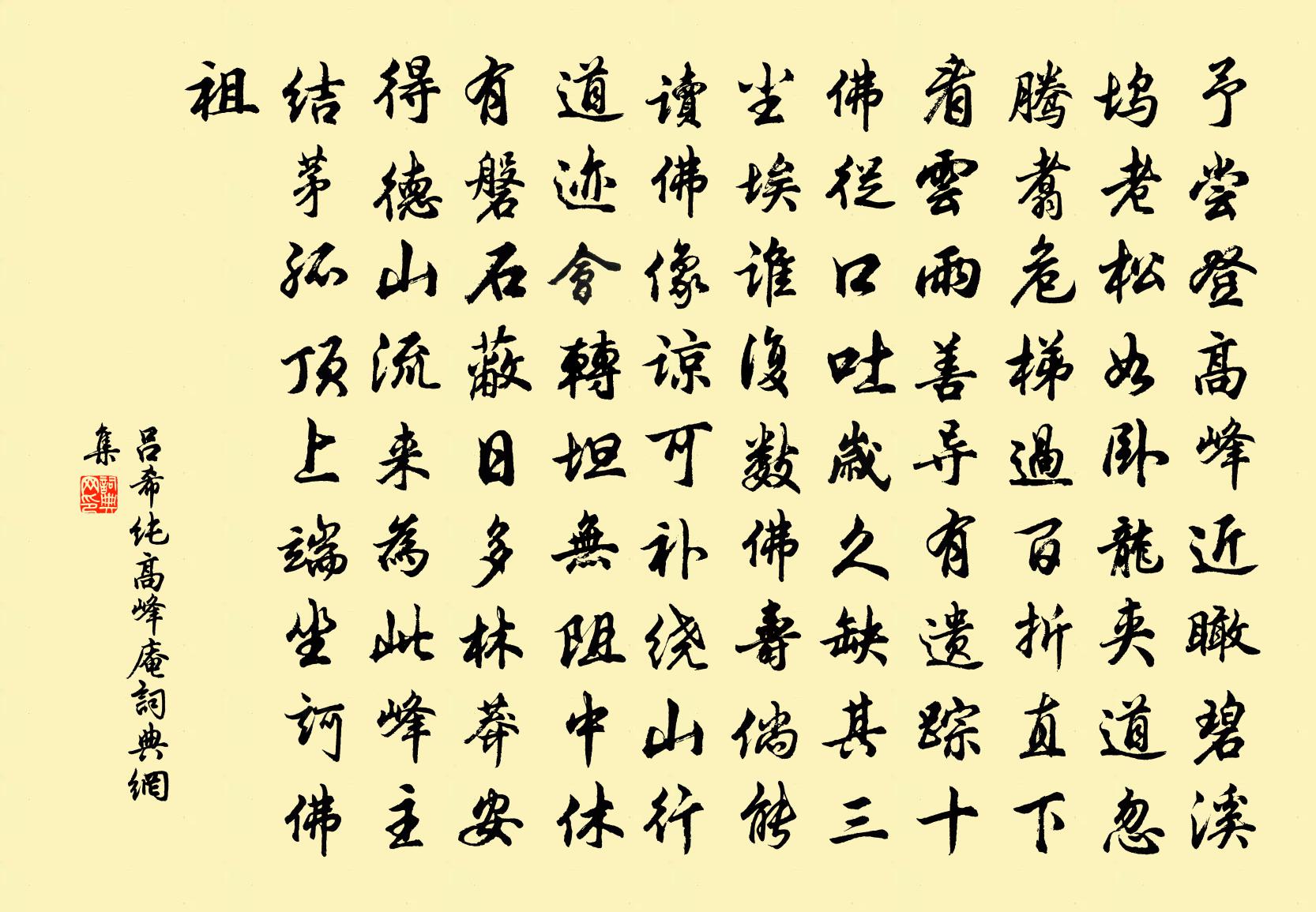 詩詞名句歷史字典書法欣賞書法字典國語詞典說文解字康熙字典古漢語字典標 題 作 者 詩 句 高峰庵作者:呂希純 朝代:宋代高峰庵原文予嘗登高峰,近瞰碧溪塢。老松如臥龍,夾道忽騰翥。危梯過百折,直下看雲雨。善導有遺蹤,十佛從口吐。歲久缺其三,塵埃誰複數。佛壽倘能讀,佛像諒可補。繞山行道跡,會轉坦無阻。中休有磐石,蔽日多林莽。安得德山流,來為此峰主。結茅孤頂上,端坐訶佛祖。詩詞問答問:高峰庵的作者是誰?答:呂希純問:高峰庵寫於哪個朝代?答:宋代呂希純高峰庵書法欣賞高峰庵書法作品詩詞推薦得天台命二首劉子翬〔宋代〕奉祠得請向天台,清夢先尋紫翠堆。借問劉晨今在否,雲間應見耳孫來。詠雁趙蕃〔宋代〕胡為去關塞,何事落江湖。歲月常違燕,飛鳴每候奴。菰蒲雖足樂,矰繳絕須虞。矯矯其高舉,紛紛莫下俱。江上晚眺董嗣杲〔宋代〕得酒終日醉,都忘醒後愁。往來狂走馬,直過皖山頭。滿庭芳佚名〔宋代〕百歲光陰,渾如一夢,不覺過春秋。憨痴愚昧,日夜為家憂。衣食前生注定,更何須、物外貪求。當思忖,深坑火太尉王公以九錫命大將軍讓公將還京邑祖餞贈陸雲〔魏晉〕天子念功。大典光備。肅肅王命。宰臣蒞事。穆矣淵讓。遺功遂志。思我遠猷。徽音孰嗣。登湘陰北寺江亭孔武仲〔宋代〕古縣峨新剎,孤亭占上頭。野苔侵坐綠,江水帶天流。絲斷湘靈瑟,苹荒帝子洲。人寰真是夢,頃刻已千秋。皇祐觀享明堂六首佚名〔宋代〕藝祖造邦,二宗紹德。肅雍孝享,登配環極。先訓有開,菲躬何力。歆聲錫義,保民麗億。偶興羅隱〔唐代〕逐隊隨行二十春,曲江池畔避車塵。如今贏得將衰老,閒看人間得意人。送梁新恩夢雷歸鄉姚勉〔宋代〕晝錦賦歸歟,梅花萬里余。同盟難此別,後會定何如。袍綠為親壽,編青課弟書。燕山今再有,五桂耀鄉閭。鴛鴦湖棹歌 之九十三朱彝尊〔清代〕百步橋南解纜初,香醪五木隔年儲,不須合路尋魚鮓,但向分湖問蟹胥。婆羅門引 兗州龍興閣感遇元好問〔金代〕嶧山霽雪,九層飛觀郁崢嶸。風煙畫出新亭。老眼來今往古,天地兩無情。但浮雲平野,短日蕪城。酒狂步兵。書種芭蕉張耒〔宋代〕幽居玩芳物,自種兩芭蕉。空山夜雨至,滴滴復蕭蕭。涼葉泛朝露,芳心展夕飈。東堂日虛靜,秀色慰無聊。小西湖胡銓〔宋代〕湖邊日日枕流眠,卻笑風波百丈牽。無限煙光堪我老,不須投表乞歸田。村舍即事仇遠〔宋代〕鳳仙繞砌錦斕斑,未著秋霜盡耐看。不似南窗數竿竹,年年日日報平安。再用前韻三首陳棣〔宋代〕陶冶無心瓮與盆,等閒妍窳意難論。年光未易留駒隙,世事唯堪隱鹿門。久客思家華發滿,小儒憂國赤心存。江山晚秋郊居八首趙蕃〔宋代〕九日黃花信昔談,是身何自見江南。故今開晚方為貴,失所胡為浪不堪。次韻和松徑黃庶〔宋代〕行人旱亢日,共蔭蒼煙姿。豈識雪霜心,但輕螻蟻皮。中為棟樑用,莫嘆斧斤遲。樗柳盡犠象,後凋終不衰。偈頌一百二十三首釋崇岳〔宋代〕欲得大用現前,直下頓忘知見。諸見若盡,昏霧不生,大智洞然。觀雪二首楊萬里〔宋代〕銀屋瑤階頃刻成,緩飄急灑總無聲。屑雲作粉如何濕,琱玉為花乃爾輕。空里仰看元不見,日光未透不妨晴。滿庭枕上范成大〔宋代〕明月無聲滿屋樑,夢余分影上人床。素娥脈脈翻愁寂,付與風鈴語夜長。名句推薦有恆產者有恆心,無恆產者無恆心。苟無恆心,放辟邪侈,無不為已。孟子《孟子·滕文公章句上·第三節》 雁聲吹過黃昏雨,籬邊月圓萋緊端木國瑚《齊天樂·菊影(雁聲吹過黃昏雨)》 長風幾萬里,吹度玉門關。李白《關山月》 掩柴扉,謝他梅竹伴我冷書齋。沈自晉《玉芙蓉·雨窗小詠》 青山遮不住,畢竟東流去辛棄疾《菩薩蠻·書江西造口壁》 風無纖埃,雨無微津。左思《三都賦》 舞低楊柳樓心月,歌盡桃花扇底風。晏幾道《鷓鴣天·彩袖殷勤捧玉鍾》 風急天高猿嘯哀,渚清沙白鳥飛回。杜甫《登高》 文章憎命達,魑魅喜人過。杜甫《天末懷李白》 道傍榆莢仍似錢,摘來沽酒君肯否。岑參《戲問花門酒家翁》