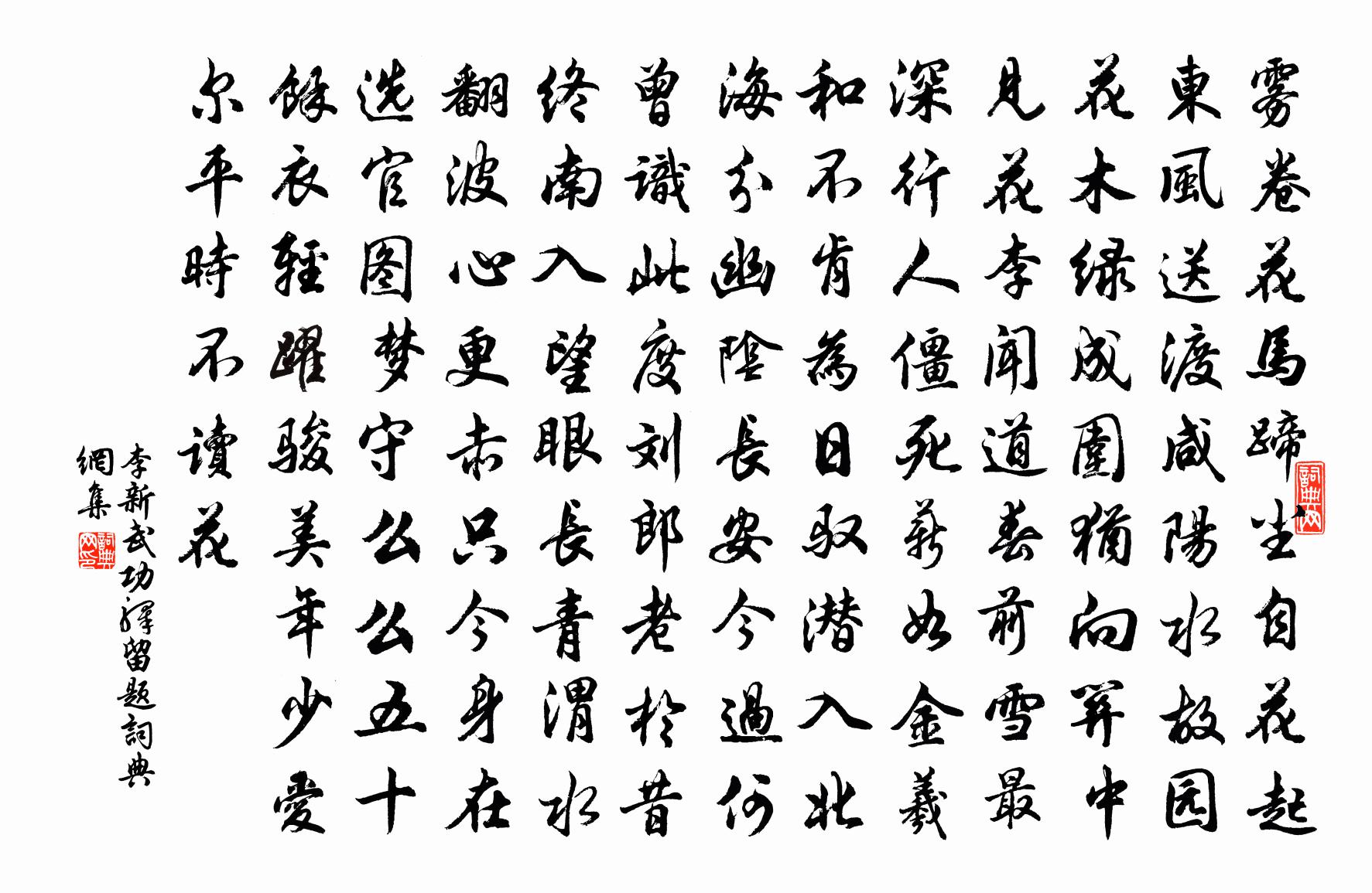 詩詞名句歷史字典書法欣賞書法字典國語詞典說文解字康熙字典古漢語字典標 題 作 者 詩 句 武功驛留題作者:李新 朝代:宋代武功驛留題原文霧卷花馬蹄塵自花起,東風送渡鹹陽水。故園花木綠成圍,猶向關中見花李。聞道春前雪最深,行人僵死薪如金。羲和不肯為日馭,潛入北海分幽陰。長安今過何曾識,此度劉郎老於昔。終南入望眼長青,渭水翻波心更赤。只今身在選官圖,夢守么么五十餘。衣輕躍駿美年少,愛爾平時不讀花。詩詞問答問:武功驛留題的作者是誰?答:李新問:武功驛留題寫於哪個朝代?答:宋代李新武功驛留題書法欣賞武功驛留題書法作品詩詞推薦欲晚訪韓持國忽道損見過不克往持國示詩因答梅堯臣〔宋代〕西雲沈日腳,命仆駕我車。我車已在庭,有客方詣廬。談笑不覺夕,雞黍且煩渠。重約勿以怪,但當摘園蔬。和梁次張謝得酒見寄四首吳芾〔宋代〕平生性僻有詩耽,每恨才慳不得兼。獨嗜君詩無厭斁,從教人笑我多饞。丹桂楊簡〔宋代〕世眼紛紛丹與黃,廣寒宮裡亦如常。目前不作兩般見,筆下方騰萬丈光。且莫錙銖深淺色,也休斤兩淡濃香。靈根夜宿田家戴復古〔宋代〕簦笠相隨走路岐,一春不換舊征衣。雨行山崦黃泥坂,夜扣田家白板扉。身在亂蛙聲里睡,心從化蝶夢中歸。鄉書江上書懷崔峒〔唐代〕骨肉天涯別,江山日落時。淚流襟上血,發變鏡中絲。胡越書難到,存亡夢豈知。登高回首罷,形影自相隨。·2春晴對月梅堯臣〔宋代〕雲掃魚鱗靜,天開桂魄清。梨花監中色,杜宇晝時聲。寥落將寒食,羈離念故京。都無惜春意,樽酒為誰傾。酬長沙鄧壽甫張埴〔宋代〕泉翁上下數千年,精力平生涑水然。白髮滿頭猶未了,青燈與影每相鄰。書成不與無金谷,寶秘惟知有木天。兩夜翠羽池陳岩〔宋代〕錦雞花鴨爛成文,連雁雙鳧雪羽紛。同免王孫金彈子,飛來飛去一群群。浩西堂見和因再用韻釋紹嵩〔宋代〕無錢使鬼故宜休,已失裝懷萬斛愁。況有西湖好山水,一帆還自上歸舟。答劉琨詩二首 二盧諶〔魏晉〕誰言日向暮。桑榆猶啟晨。誰言繁菜實。振藻耀芳春。百鍊或致屈。繞指所以伸。常禪師塔樓鑰〔宋代〕當時道價極光華,鷙獸相隨共一家。象去虎亡師亦老,不須百鳥更銜花。辛已老人生旦陳文蔚〔宋代〕陶陶太古民風淳,詐偽不萌情意真。何嘗吐納事屈伸,往往皆為百歲人。中古便似秋冬辰,和氣無復如陽春。機巧秋氣宋祁〔宋代〕清濁還二儀,秋氣颯然肅。溪潔潦已殘,林疏條自矗。寒蛩思長階,歸燕眷華屋。凋年自茲始,鄉懷念松菊。和光亭二首郭印〔宋代〕川原萬草木,總放無量光。要識和同意,乾坤不閟藏。解連環楊無咎〔宋代〕素書誰托。嗟鱗沈雁斷,水遙山邈。問別來、幾許離愁,但只覺衣寬,不禁消薄。歲歲年年,又豈是、春光蕭索。送薛判官之越皇甫冉〔唐代〕時難自多務,職小亦求賢。道路無辭遠,雲山並在前。樟亭待潮處,已是越人煙。廉上人歸天台楊億〔宋代〕舊住赤城華頂峰,桂岩芝崦白雲重。彌天曾共習鑿齒,人洛因尋陸士龍。寒燭伴吟經臘雪,雨花開講過晨鐘。浮漚與所盤諸君會石幡還和杜老曲江韻丘葵〔宋代〕絮雲初未前成衣,笑踏青莎橋上歸。詩灑堪過春日永,鶯花卻恨海山稀。竹間弄笛留人住,麥外遊絲絆鳥飛。滿院贈肖岩王遂〔宋代〕強栽髭鬢較錙銖,眼底精神不解枯。許我蒼顏殿諸老,可能同讀遠遊無。張功甫見贈丁藁曾豐〔宋代〕王孫氣習窶儒生,壯士襟期老典刑。疾俗如仇幾掃跡,貪書若癖至忘形。風雲未會心先冷,水石無游眼不醒。獨據名句推薦人有賢愚,任人勿求過己。來俊臣《羅織經·固榮卷第六》 故人書報,莫因循、忘卻蓴鱸。辛棄疾《漢宮春·會稽秋風亭觀雨》 兒不嫌母醜,狗不嫌家貧。佚名《增廣賢文·下集》 如知其非義,斯速已矣,何待來年。孟子《孟子·滕文公章句下·第八節》 相逢成夜宿,隴月向人圓。杜甫《宿贊公房》 天秋木葉下,月冷莎雞悲。李白《秋思》 今夫天斯昭昭之多,及其無窮也,日月星辰系焉,萬物覆焉。子思《中庸·第二十六章》 山河破碎風飄絮,身世浮沉雨打萍。文天祥《過零丁洋》 何時更杯酒,再得論心胸。李白《魏郡別蘇明府因北游》 過頭飯好吃,過頭話難聽!佚名《增廣賢文·下集》