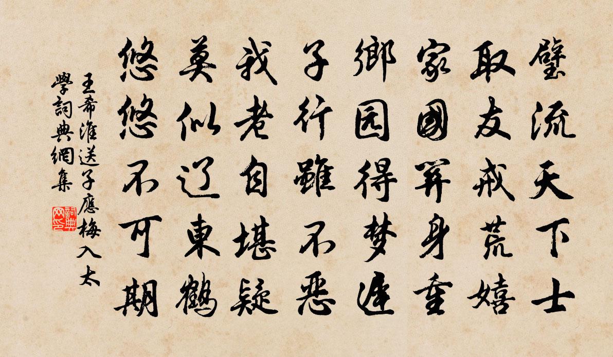 詩詞名句歷史字典書法欣賞書法字典國語詞典說文解字康熙字典古漢語字典標 題 作 者 詩 句 送子應梅入太學作者:王希淮 朝代:宋代送子應梅入太學原文璧流天下士,取友戒荒嬉。家國關身重,鄉園得夢遲。子行雖不惡,我老自堪疑。莫似遼東鶴,悠悠不可期。詩詞問答問:送子應梅入太學的作者是誰?答:王希淮問:送子應梅入太學寫於哪個朝代?答:宋代王希淮送子應梅入太學書法欣賞送子應梅入太學書法作品詩詞推薦重經漢南許彬〔唐代〕分散多如此,人情豈自由。重來看月夕,不似去年秋。息慮雖孤寢,論空未識愁。須同醉鄉者,萬事付江流。天香(宛委山房擬賦龍涎香)馮應瑞〔宋代〕枯石流痕,殘沙擁沫,驪宮夜蟄驚起。海市收時,鮫人分處,誤入眾芳叢里。春霖未就,都化作、淒涼雲氣。惟有潘茂洪出疆回以汴都畫山水扉見遺報之五言張鎡〔宋代〕嵩華平生夢,騎驢未得游。橐中分雅惠,掌上起新秋。報國何能早,埯時莫漫憂。祗尖長近眼,過夏亦慵收。韋氏語佚名〔唐代〕大郎罷相,小郎拜相。挽樓嚴州孫應時〔宋代〕天與才難似,家傳學更優。著鞭心汗馬,遊刃目無牛。奏語聞三嘆,論功僅一州。人才苦牢落,那不使公留。題它山善政侯祠兼簡鄞令舒坦〔宋代〕嗚呼王封君,心事鬼出沒。驅山截長江,化作雲水窟。旱火六月天,萬棟掛龍骨。蕭條一祠宇,像設何彷佛。破屋寄孫辟呈鄭谷郎中齊己〔唐代〕衡岳去都忘,清吟戀省郎。淹留才半月,酬唱頗盈箱。雪長松檉格,茶添語話香。因論樂安子,年少老篇章。縣齋秋懷程公許〔宋代〕璣衡乾霄極,裘葛參歲功。榮瘁均一氣,何獨悲秋風。往哲不我待,今俗誰與同。渥彤易槁木,鬢有鬒忽飛蓬。丈織圖二十四首三眠樓璹〔宋代〕屋裡蠶三眠,門前春過半。桑麻綠陰合,風雨長檠暗。葉底蟲絲繁,臥作字畫短。偷閒一枕肱,夢與楊花亂。牧羊歌陸游〔宋代〕牧羊忌太早,太早羊輒傷。一羊病尚可,舉群無全羊。日高露曦原草緣,羊散如雲滿川谷。小童但豈必習詩知考牧水調歌頭 過大散關李齊賢〔元代〕行盡碧溪曲,漸到亂山中。山中白日無色,虎嘯谷生風。萬仞崩崖疊嶂,千歲枯藤怪樹,嵐翠自蒙蒙。我馬汗如雨吟詩俞桂〔宋代〕漁溪僻好只吟詩,此意還須識者知。自古島郊貧徹骨,詩逢窮處始為奇。西興寺值雨次吳警齋先生韻丘葵〔宋代〕松風一道作秋聲,閱盡山僧相送迎。佛法西來隨處見,梅花老去為誰清。亦知身是客中客,試問朝來晴未晴。一笑滿江紅佚名〔宋代〕潑火初收,鞦韆外、輕煙漠漠。春漸遠、綠楊芳草,燕飛池閣。已著單衣寒食後,夜來還是東風惡。對空山、寂寂春帖子詞夫人閣十首宋祁〔宋代〕東郊移仗曉迎春,已覺輕寒不著人。天瑞穰穰君澤美,並教和氣助佳辰。瑞鶴仙俞國寶〔宋代〕春衫和淚著。又燕入江南,雁歸衡岳。東風曉來惡。繞西園無緒,淚隨花落。愁鍾恨角。夢無憑、難成易覺。到春余寒王安石〔宋代〕余寒駕春風,入我征衣裳。捫鬢只得凍,蔽面尚疑創。士耳恐猶墜,馬毛欲吹僵。牢持有失箸,疾飲無留湯。曈曈止齋即事二首陳傅良〔宋代〕性已耐岑寂,老應忘隱憂。齊年雙白髮,盡日一蒼頭。竹閉緘門鑰, * 數漏籌。未知庭廡下,還有雀羅不。資中八首范祖禹〔宋代〕資山岩谷多神仙,鸞車鳳馬隨飛煙。神女蕭蕭來暮雨,浮丘往往下雲軿。送僧釋重顯〔宋代〕祖域高親日未央,家林歸去意何長。舊交不識初相見,曾振滄溟奪夜光。名句推薦灞橋楊柳年年恨,鴛浦芙蓉葉葉愁。蘇庠《鷓鴣天·楓落河梁野水秋》 元方難為兄,季方難為弟。劉義慶《世說新語·德行》 二月春花厭落梅。仙源歸路碧桃催。渭城絲雨勸離杯。晏幾道《浣溪沙·二月春花厭落梅》 此地別燕丹,壯士發衝冠。駱賓王《於易水送人 / 於易水送別》 思來江山外,望盡煙雲生。張九齡《秋晚登樓望南江入始興郡路》 忠臣不借人以力,貞女不假人以色。劉向《列女傳·貞順傳·楚白貞姬》 春風旍旗擁萬夫,幕下諸將思草枯。黃庭堅《送范德孺知慶州》 日光下澈,影布石上,佁然不動;柳宗元《小石潭記》 大曰逝,逝曰遠,遠曰反。老子《老子·道經·第二十五章》 天清一雁遠,海闊孤帆遲。李白《送張舍人之江東》