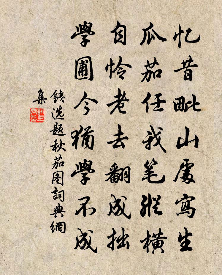 詩詞名句歷史字典書法欣賞書法字典國語詞典說文解字康熙字典古漢語字典標 題 作 者 詩 句 題秋茄圖作者:錢選 朝代:宋代題秋茄圖原文憶昔毗山處寫生,瓜茄任我筆縱橫。自憐老去翻成拙,學圃今猶學不成。詩詞問答問:題秋茄圖的作者是誰?答:錢選問:題秋茄圖寫於哪個朝代?答:宋代錢選題秋茄圖書法欣賞題秋茄圖書法作品詩詞推薦送惲南田之錢塘並柬毛稚黃陳維崧〔清代〕躡屩上靈隱,吹笛下吳淞。送君恰值新爽,纖月映船篷。猶記冷泉亭上,百道跳珠噴雪,飛瀑掛衫松。一別十八載虛舟何耕〔宋代〕君不見江乾車馬紛相送,巨艑峨峨船載重。西南使者解官歸,水淺著沙牽不動。如君材具豈多得,合侍明光參法從靜觀堂十偈汪晫〔宋代〕有時檢點舊閒游,出岫行雲野渡舟。驀地靜中訊息好,夕陽西下水東流。上邪佚名〔兩漢〕上邪,我欲與君相知,長命無絕衰。山無陵,江水為竭。冬雷震震,夏雨雪。天地合,乃敢與君絕。輞川元稹〔唐代〕世累為身累,閒忙不自由。殷勤輞川水,何事出山流。秋懷十首微雲淡河漢疏雨滴梧桐為韻楊冠卿〔宋代〕呼船下平湖,山如髻鬟瞰。物華逼搖落,水明天淡淡。中藏今古愁,歲月不可勘。為語羊征南,聲名本來暫。清涼寺孫應時〔宋代〕勝絕清涼寺,低迷德慶堂。崇阿納遐景,遺貴想前王。豪傑兵戈後,風流翰墨場。憑欄意何極,歸鳥度斜陽。季懷設醴且示佳篇再賦一章以酬五詠周必大〔宋代〕卯飲高樓徹暮霞,絕勝茅屋己公茶。篛包句好逢真賞,荷葉甌深稱嫩芽。詩老坐中容我輩,朝賢乞處藉君家。從來送友人自荊襄歸江東(友人新喪偶)許渾〔唐代〕商洛轉江濆,一杯聊送君。劍愁龍失伴,琴怨鶴離群。楚驛枕秋水,湘帆凌暮雲。猿聲斷腸夜,應向雨中聞。賢者之孝二百四十首田叔林同〔宋代〕勿以梁事問,將遺太后憂。若非叔長者,誰為帝忠謀。論語絕句一百首張九成〔宋代〕參聞吾道無心語,只在當時一唯間。多學反嗟疑子貢,望雲猶隔數重關。淡助徐鈞〔宋代〕談經唐世豈無人,君獨春秋學最深。力辯邱明非左氏,後來朱子始知音。郊廟歌辭儀坤廟樂章雍和鄭善玉〔唐代〕酌郁既灌,薌蕭方爇。籩豆靜器,簠簋芬飶。魚臘薦美,牲牷表潔。是戢是將,載迎載列。玉樓春歐陽修〔宋代〕艷冶風情天與措。清瘦肌膚冰雪妒。百年心事一宵同,愁聽雞聲窗外度。信阻青禽雲雨暮。海月空驚人兩處。強將凱歌十首呈賈樞使劉克莊〔宋代〕殘黨分兵盡撲除,遊魂多不返穹廬。肅清執至龍顏喜,又奏淮西有捷書。中春登樓劉兼〔唐代〕金杯不以滌愁腸,江郡芳時憶故鄉。兩岸煙花春富貴,一樓風月夜淒涼。王章莫恥牛衣淚,潘岳休驚鶴鬢霜。歸去敘州陸游〔宋代〕楚柂吳檣又遠遊,浣花行樂夢西州。千尋鐵鎖遠堪恨,空鎖長江不鎖愁!龍涎香王洋〔宋代〕搴露紉荷楚澤舷,未胡南海素馨仙。大門當得桂花酒,小樣時分寶月圓。詩挾少陵看妙手,犀通神物為垂涎。使君向秀徐鈞〔宋代〕心慕莊書善說玄,發明奇趣理昭然。世人竊取公遺論,卻把前言作己言。宣歙道中楊萬里〔宋代〕天齋玉立萬孱顏,三日深行紫翠間。便是昨來千佛閣,望中見此兩州山。詩家寒刮少陵骨,宮樣高梳西子鬟。秪好名句推薦青青河畔草,綿綿思遠道。佚名《飲馬長城窟行》 螣蛇無足而飛,梧鼠五技而窮。荀子《荀子·勸學》 機不密,禍先行。馮夢龍《醒世恆言·卷二十》 普天皆滅焰,匝地盡藏煙。沈佺期《寒食》 痴男怨女,可憐風月債難償。曹雪芹《紅樓夢·第五回》 彩線輕纏紅玉臂,小符斜掛綠雲鬟。佳人相見一千年。蘇軾《浣溪沙·端午》 又聞子規啼夜月,愁空山李白《蜀道難》 天下難事,必作於易;天下大事,必作於細。老子《老子·德經·第六十三章》 人到情多情轉薄,而今真箇不多情。納蘭性德《山花子·風絮飄殘已化萍》 事有所出,功有所止。劉向《戰國策·趙二·武靈王平晝閒居》