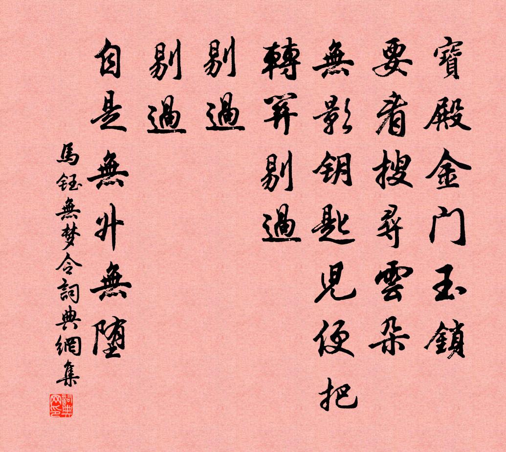 詩詞名句歷史字典書法欣賞書法字典國語詞典說文解字康熙字典古漢語字典標 題 作 者 詩 句 無夢令作者:馬鈺 朝代:元代無夢令原文寶殿金門玉鎖。要看搜尋雲朵。無影鑰匙兒,便把轉關剔過。剔過。剔過。自是無升無墮。詩詞問答問:無夢令的作者是誰?答:馬鈺問:無夢令寫於哪個朝代?答:元代問:無夢令是什麼體裁?答:詞馬鈺無夢令書法欣賞無夢令書法作品詩詞推薦贈葆元白玉蟾〔宋代〕棄儒為見儒多誤,學道緣吾道化賢。且把功名權架閣,抱琴隨我去修仙。減字木蘭花張孝祥〔宋代〕一尊留夜。賓蠟烘簾光激射。凍合銅壺。細聽冰檐夜剪酥。清愁冉冉。酒喚紅潮登玉臉。明日重看。玉界瓊樓特地天淨沙·星依雲渚濺濺孟昉〔元代〕星依雲渚濺濺,露零玉液涓涓,寶砌衰蘭剪剪。碧天如練,光搖北斗闌乾。偈頌三十六首釋如珙〔宋代〕三期罷了不施功,萬里秋天西北風。無孔鐵鎚成隊走,苦哉滅卻少林宗。簡瑄上人借楞嚴經裘萬頃〔宋代〕石室雲山鎮日扃,午雞啼處睡初醒。案頭上有爐熏在,試讀楞嚴一卷經。江梅引 神邪王吉昌〔元代〕四肢氣散失根芽。作神邪。發空華。異物千般,目下亂如麻。一切聖賢隨意現,總變化,都因一念差。不知心病尚太上皇帝合端午帖子詞汪應辰〔宋代〕冷泉堂上湖山勝,聚景園中草木芳。萬物欣欣供燕樂,自然祥暑變清涼。和子思弟韻壽母許月卿〔宋代〕劣相誰知此老天,瑤池專遣雪當筵。開花敬上夫人壽,列樹無非西子妍。松學妙齡施粉點,鶴迷歸路認蓮船。水晶過寶應縣新開湖十首楊萬里〔宋代〕半濃黛汁點遙林,微淡鈆膏抹暮雲。似白如青都不是,淮南弄色五湖春。續和簽判太博游海雲吳中復〔宋代〕海雲摸石近東城,莽蒼春郊去路平。繞寺溪光照金絡,夾堤柳色混青旌。榴花新釀盈樽淥,玉柄高談照座清。上客金剛隨機無盡頌離色離相分第二十釋印肅〔宋代〕如來言具足,切莫外馳逐。當體即無餘,曹溪留一宿。沁園春佚名〔宋代〕我善觀梅,識梅妙處,捨我其誰。待裁冰翦雪,已無足道,凝酥弄粉,愈不為奇。枉費心神,巡檐索笑,點檢南枝園蔬十詠芥劉子翬〔宋代〕葉實抱芳辛,氣烈消煩滯。登俎效微勞,乍食驚頻嚏。濟上四賢詠鄭霍二山人(一作寄崔鄭二山人)王維〔唐代〕翩翩繁華子,多出金張門。幸有先人業,早蒙明主恩。童年且未學,肉食騖華軒。豈乏中林士,無人薦至尊。鄭公頌古三十二首釋明辯〔宋代〕體量非功不墮今,星移斗換豈同輪。多年曆日雖無用,犯著應須總滅門。洊飢之餘復苦久雨感嘆有作陸游〔宋代〕道傍襁負去何之?積雨仍愁麥不支。為國憂民空激烈,殺身報主已差池。屬饜糠麧猶多愧,徙倚柴荊只自悲。十載從提舉黃元章登齊山寺,後上清岩翠微亭。望楊萬里〔宋代〕西山落日浴長江,並貫清溪作一光。千嶂圍來天四合,孤城湧出水中央。樓台王塔雲間見,楊柳金堤鏡里長。客子題御溝張祜〔唐代〕萬樹垂楊拂御溝,溶溶漾漾繞神州。都緣濟物心無阻,從此恩波處處流。除夜宿石塔寺楊萬里〔宋代〕醉後先眠客莫嗔,誰能守歲費精神。幸無爆竹驚寒夢,休羨椒花頌好春。今歲明年才隔夕,人情物態頓趨新。遙憐喜楊德華見過感舊成詠宋祁〔宋代〕曾見烏衣賭佩囊,再逢何遽二毛郎。病姿故有靈光在,牡齒翻隨屈產長。河裡笛聲頻感慨,江南花樹剩淒涼。酒壚名句推薦回首天涯,一抹斜陽,數點寒鴉。張可久《折桂令·九日》 溪深難受雪,山凍不流雲。洪升《雪望》 輕解羅裳,獨上蘭舟。李清照《一剪梅·紅藕香殘玉簟秋》 教子弟於幼時,便當有正大光明氣象;檢身心於平日,不可無憂勤惕厲工夫。王永彬《圍爐夜話·第一則》 升堂坐階新雨足,芭蕉葉大梔子肥。韓愈《山石》 嗟余聽鼓應官去,走馬蘭台類轉蓬。李商隱《無題·昨夜星辰昨夜風》 東風兮東風,為我吹行雲使西來。李白《久別離》 動莫若敬,居莫若儉,德莫若讓,事莫若咨。左丘明《國語·周語·晉羊舌肸聘周論單靖公敬儉讓咨》 回日樓台非甲帳,去時冠劍是丁年溫庭筠《蘇武廟》 尊長前,聲要低。低不聞,卻非宜。李毓秀《弟子規·出則弟》