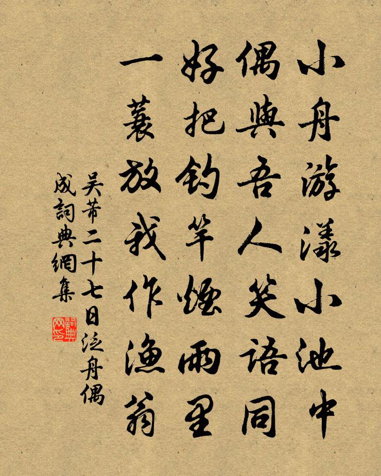詩詞名句歷史字典書法欣賞書法字典國語詞典說文解字康熙字典古漢語字典標 題 作 者 詩 句 二十七日泛舟偶成作者:吳芾 朝代:宋代二十七日泛舟偶成原文小舟游漾小池中,偶與吾人笑語同。好把釣竿煙雨里,一蓑放我作漁翁。詩詞問答問:二十七日泛舟偶成的作者是誰?答:吳芾問:二十七日泛舟偶成寫於哪個朝代?答:宋代吳芾二十七日泛舟偶成書法欣賞二十七日泛舟偶成書法作品詩詞推薦題興善院淨師月岩圖歐陽守道〔宋代〕君不見長安市,擾擾行人如聚蟻。不惟賈客與廛民,往往完冠紳大夫士。投身鬧處思山林,欲歸未歸長苦心。夜深題嵩陽隱者崔塗〔唐代〕四十年高夢,生涯指一丘。無人同久住,有鶴對冥修。草雜芝田出,泉和石髓流。更嫌庭樹老,疑是世間秋。午睡戲作樓鑰〔宋代〕早起三朝當一工,老來貪睡不相同。偶然一次五更起,卻用重眠到日中。十六觀經頌下品下生釋遵式〔宋代〕有作五逆十惡業,應墮地獄受諸苦。臨終遇勸念彌陀,決定超生於彼土。飛玉亭施樞〔宋代〕素練飛來袞雪毬,滿懷風露不勝秋。翠蛟已是天然景,今日還當避一頭。次韻林仲和筠莊李彌遜〔宋代〕青青谷口自披榛,斷取它方寶界新。彌勒同龕把茅下,客來不識住庵人。次韻真歇和尚圓覺經頌一十四首圓覺薔薩章釋正覺〔宋代〕選場隨手取標毬,長短期中入社流。覺後繩繩機自脫,悟來密密類難收。十分飽足雪山草,一色漸成露地牛。風掃喜遷鶯張繼先〔宋代〕情纏識縛,嘆時人不悟,酒中真樂。縱慾招愆,迷心失行,卻道為他狂藥。須信醉舞狂歌,也有良知真覺。無倚泊十拍子/破陣子趙善扛〔宋代〕柳絮飛時綠暗,荼開後春酣。花外青簾迷酒思,陌上晴光收翠嵐。佳辰三月三。解珮人逢游女,踏青草斗宜男。醉嘲寫真釋智圓〔宋代〕泡紀吾身元是妄,丹青汝影豈為真。吾身汝影俱無實,相伴茆堂作兩人。相和歌辭。朝雲引郎大家宋〔唐代〕巴西巫峽指巴東,朝雲觸石上朝空。巫山巫峽高何已,行雨行雲一時起。一時起,三春暮,若言來,且就陽台路。侯家胡宿〔唐代〕洞戶春遲漏箭長,短轅初返雒陽傍。彩雲按曲青岑醴,瀋水薰衣白璧堂。前檻蘭苕依玉樹,後園桐葉護銀床。宴殘虞美人邵亨貞〔元代〕天台洞口桃開了。無柰劉郎老。多情何苦嘆途窮,人與花枝,都在暗塵中。個人那日猶痴小。簾底秋波渺。別來幾梅使君守橫浦擒寇閔雨劉黻〔宋代〕猛虎久負嵎,吞噬草木痏。流毒烈贛吉,一呼蜂蝟起。老天福黔黎,雪村鎮梅壘。指授討捕略,前驅謝張李。火箭重酬楊僕射山亭詩薛道衡〔隋代〕寂寂無與晤。朝端去總戎。空庭聊步月。閒坐獨臨風。臨風時太息。步月山泉側。朝朝散霞彩。暮暮澄秋色。秋色閒居述事邵雍〔宋代〕花木四時分景致,經書千卷好生涯。有人若問閒居處,道德坊中第一家。贈棋客黃尤工象棋張明中〔宋代〕黑甜政飽誰剝啄,手提楸枰敲軟玉。浩浩胸中龍虎韜,冷笑局邊人射鵠。粵昔嘗聞黃石公,圯橋一卷豈易通。報韓宋武帝廟楊雯〔宋代〕溪聲答松風,巨石出老拳。古樹不知名,岌岌蛟龍纏。夕陽互出沒,秋華帶芳鮮。蔥蔥帝王氣,棟宇垂千年。虎賁戲題膽瓶蕉樓鑰〔宋代〕垂膽新瓷出汝窯,滿中幾莢浸雲苗。瓶非貯水無由罄,葉解流根自不凋。露綴疑儲陶令粟,風搖欲響許由瓢。相攜牡丹三首傅察〔宋代〕半醉西施暈曉妝,天香一夜染衣裳。躊躇欲畫無窮意,筆法何人繼趙昌。名句推薦兩岸荔枝紅,萬家煙雨中。李師中《菩薩蠻·子規啼破城樓月》 衣不如新,人不如故。佚名《古艷歌》 長袖善舞,多錢善賈。韓非及後人《韓非子·五蠹》 一山飛峙大江邊, 躍上蔥蘢四百旋 * 《七律·登廬山》 江上雪,獨立釣漁翁。李綱《望江南·江上雪》 十輪霜影轉庭梧,此夕羈人獨向隅。晏殊《中秋月》 君子遺人以財,不若善言。佚名《孔子家語·六本》 又有牆頭千葉桃,風動落花紅蔌蔌。元稹《連昌宮詞》 事莫明於有效,論莫定於有證王充《論衡·卷二十三·薄葬篇》 誠之者,擇善而固執之者也。子思《中庸·第二十章》
