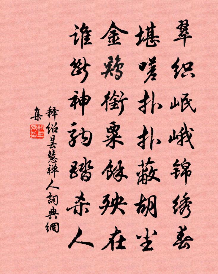 詩詞名句歷史字典書法欣賞書法字典國語詞典說文解字康熙字典古漢語字典標 題 作 者 詩 句 慧禪人作者:釋紹曇 朝代:宋代慧禪人原文翠織岷峨錦繡春,堪嗟撲撲蔽胡塵。金雞銜粟餘殃在,誰斷神駒踏殺1/1人。詩詞問答問:慧禪人的作者是誰?答:釋紹曇問:慧禪人寫於哪個朝代?答:宋代釋紹曇慧禪人書法欣賞慧禪人書法作品詩詞推薦日南長至獨孤鉉〔唐代〕玉曆頒新律,凝陰發一陽。輪輝猶惜短,圭影此偏長。晷度經南斗,流晶盡北堂。乍疑周戶耀,可愛逗林光。積雪奉和張舍人送秦鍊師歸岑公山李群玉〔唐代〕仙翁歸臥翠微岑,一夜西風月峽深。松徑定知芳草合,玉書應念素塵侵。閒雲不系東西影,野鶴寧知去住心。蘭浦次韻洪令谷瑞平遠台蘇籀〔宋代〕能賦憑高所得多,海雲岩崿若君何。兼通西竺瞿曇意,欲和南風虞舜歌。怪石甘泉作檀施,長廊古殿蔭多羅。相期哭晁卿衡李白〔唐代〕日本晁卿辭帝都,征帆一片繞蓬壺。明月不歸沉碧海,白雲愁色滿蒼梧。冬初雜興孫嵩〔宋代〕今晨霜露肅,愛此群山秋。夭桃薄照日,乃是丹楓稠。草花無名字,正類 * 幽。一筇步澗阿,聊復舒我眸。雁聲竹所張煒〔宋代〕數幹當檐眼便青,翠陰千畝況為鄰。休貪冷地閒風月,好作清朝勁節人。有以官法酒見餉者因用前韻求述古為移廚飲湖蘇軾〔宋代〕喜逢門外白衣人,欲膾湖中赤玉鱗。游舫已妝吳榜穩,舞衫初試越羅新。欲將漁釣追黃帽,未要靴刀抹絳巾。芳意飲猿潭陳岩〔宋代〕月照秋空風滿林,孤猿渴飲碧潭深。我今忘我兼忘物,兀坐怡然不動心。牛渚曲王遂〔宋代〕岷江赴東海,牛渚鎮中流。古來濟渡處,落日迷滄洲。江東名勝士,清談付悠悠。氛埃更五閏,毒烈遍九州。六龍送人之九江謁郡侯苗員外紳鄭谷〔唐代〕澤國尋知己,南浮不偶游。湓城分楚塞,廬岳對江州。曉飯臨孤嶼,春帆入亂流。雙旌相望處,月白庾公樓。句石延年〔宋代〕平蕪遠更綠,斜日寒無輝。紫微花岳珂〔宋代〕凡卉同資造化工,紫微元不待東風。明霞絢爛瓊為蕊,曉日離披綺作叢。塵境斷無青瑣隔,仙姿元與亦城通。最憐雪觀顧夫人哀詩二首劉克莊〔宋代〕吾母尤高潔,夫人亦步趨。書窗共殘燭,禪幾對團蒲。不愧顧家婦,能存趙氏孤。郎君奉鸞誥,聊足報親劬。不寢邵雍〔宋代〕閒坐更已深,就寢夜尚永。殿轉不成寐,卻把前事省。奠枕時昏昏,擁衾還耿耿。西窗明月中,數葉芭蕉影。詠雪於清虛堂火閣白玉蟾〔宋代〕長空慘慘晝如夜,嚴風颳得雪片下。寒猿傍樹不敢聲,江梅羞開恐易謝。萬山無限落葉愁,處處凝煙纏草舍。枯槎念奴嬌(丁卯生朝)劉克莊〔宋代〕小孫盤問翁翁,今朝怎不陳弧矣。翁道暮年惟隻眼,不比六根全底。常日談玄,余齡守黑,赤眚從何起。鬢須雪白奉和魯望疊韻雙聲二首疊韻山中吟皮日休〔唐代〕穿煙泉潺湲,觸竹犢觳觫。荒篁香牆匡,熟鹿伏屋曲。泊舟周家步趙汝鐩〔宋代〕梢子商量乘早泊,向前十里不逢村。卸帆斂柁依山腳,系纜添椿傍樹根。月魄知風昏有暈,秋光入水淨無痕。五更香林四首陳與義〔宋代〕簡齋居士不飲酒,一入香林更不醒。驅使小詩酬曉露,絕勝辛苦廣騷經。送潭州陳運使二首項安世〔宋代〕薄命真如此,茲行如識公。從來半生願,不畀數旬同。官事埋頭過,江舲轉眼空。可能傾蓋地,直作急流中。名句推薦風摧寒棕響,月入霜閨悲。李白《獨不見》 天長地久有時盡,此恨綿綿無絕期。白居易《長恨歌》 恰似春風相欺得,夜來吹折數枝花。杜甫《絕句漫興九首·其二》 仁人之所以為事者,必興天下之利,除去天下之害,以此為事者也。墨子《墨子·15章 兼愛(中)》 銀鞍照白馬,颯沓如流星。李白《俠客行》 故山知好在,孤客自悲涼。蘇軾《臨江仙·送王緘》 落魄江南載酒行,楚腰纖細掌中輕。杜牧《遣懷》 酒入愁腸,化作相思淚。范仲淹《蘇幕遮·懷舊》 只愁飛詔下青冥。不應霜塞晚,橫槊看詩成。周紫芝《臨江仙·送光州曾使君》 誤用聰明,何若一生守拙王永彬《圍爐夜話·第四一則》