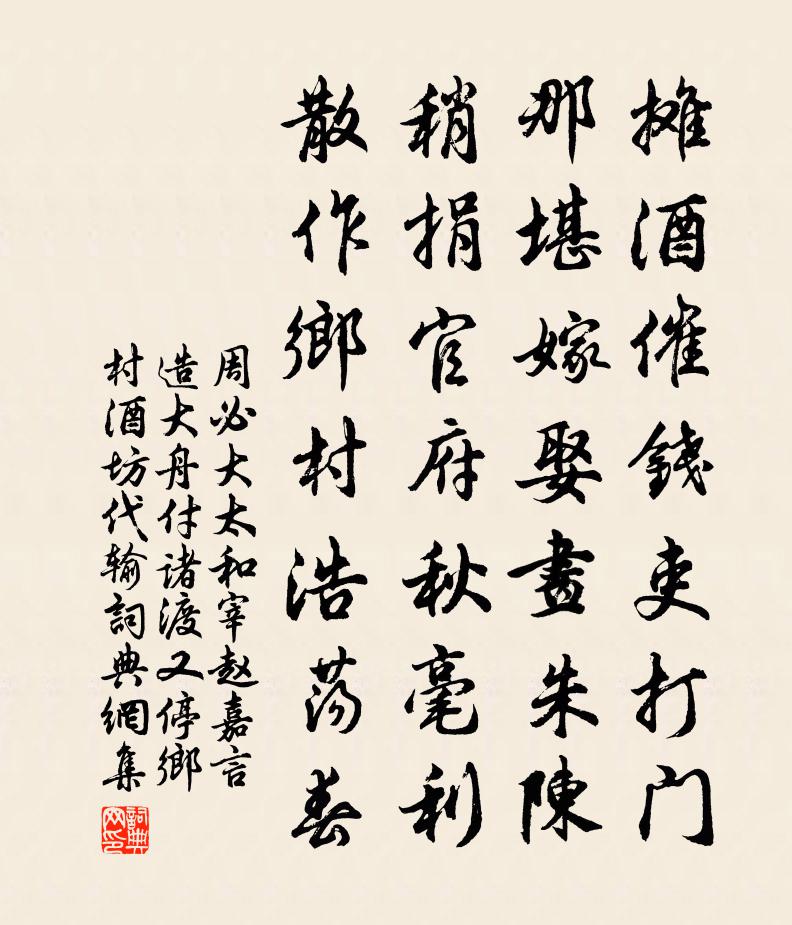詩詞名句歷史字典書法欣賞書法字典國語詞典說文解字康熙字典古漢語字典標 題 作 者 詩 句 太和宰趙嘉言造大舟付諸渡又停鄉村酒坊代輸作者:周必大 朝代:宋代原文攤酒催錢吏打門,那堪嫁娶畫朱陳。稍捐官府秋毫利,散作鄉村浩蕩春。詩詞問答問:《太和宰趙嘉言造大舟付諸渡又停鄉村酒坊代輸》的作者是誰?答:周必大問:該詩寫於哪個朝代?答:宋代書法欣賞太和宰趙嘉言造大舟付諸渡又停鄉村酒坊代輸書法作品詩文賞析【原題】:太和宰趙嘉言造大舟付諸渡又停鄉村酒坊代輸其課繪二圖各題小詩詩詞推薦飲黎希明赴與學教論陳紀〔宋代〕冷官仍冷地,況味淡於僧。泮水無一畝,亂山知歲憎。樹雲侵絳帳,山雨翳青燈。若有登臨句,寄予能不能。次陳一鶚韻張九成〔宋代〕大道若坦塗,踐履何早晚。榛荊蔽不掃,日夜勞勤墾。聖門一以披,即日到堂閫。但辦不已心,此道誰雲遠。譬如武陵春 渭南楊五生朝丘處機〔元代〕新歲才交生萬物,時令近元宵。瑞氣ㄨㄨ降碧霄。方誕謫仙苗。貌態堂堂殊勝敏,歸道厭凡囂。石爛松枯壽更遙,效晉樂志拂舞歌淮南王二篇鄧林〔宋代〕唐明皇,自言榮,金輿翠輦游華清。廣寒宮殿凝水晶,霓裳羽衣沈香亭。沈香亭,泛流霞,流霞瀲灩隊五家。誰知春閨徐彥伯〔唐代〕戍客戍清波,幽閨幽思多。暗梁聞語燕,夜燭見飛蛾。寶鴨藏脂粉,金屏綴綺羅。裁衣卷紋素,織錦度鳴梭。有使泊舟徐橫槊〔宋代〕短蓬靜坐月窺船,斗轉參橫水底天。傳語篙工低著語,恐驚沙觜白鷗眠。五祖贊釋法薰〔宋代〕栽遍滿山松,暗地翻身轉。雖然得信衣,何曾識爺面。初冬雜詠陸游〔宋代〕夜窗父子共煎茶,一點青燈冷結花。村落盜清無犬吠,園林月上有啼鴉。次韻和吳仲庶池州齋山畫圖王安石〔宋代〕省中何忽有崔嵬,六幅生綃坐上開。指點便知岩石處,登臨新作使君來。雅懷重向丹青得,勝勢兼隨翰墨回。更想菩薩蠻蔡伸〔宋代〕鳴笳疊鼓催雙槳。扁舟穩泛桃花浪。別淚灑東風。前歡如夢中。夢魂無定據。不到相逢處。縱使夢相逢。香閨豈解丈人觀陸游〔宋代〕黃金篆書扁朱門,夾道巨竹屯蒼雲。崖嶺劃若天地分,千柱耽耽壓其垠。纓冠肅謁丈人君,廣殿空庭吹寶熏。摩挲簡沖牆庵中故人曹勛〔宋代〕寄跡臨安久,思歸夕夢頻。愁多難強醉,病苦故禁人。夜短無清夢,年高嘆幻身。出中有道伴,雲壑擅余春。休官趙某〔宋代〕欲知趙子休官了,貧似扶風馬少游。借得琴樽留待月,從教簾幕不勝秋。自攜仆出閒尋藥,因載書多卻買舟。昨日採石章甫〔宋代〕江行十日風打頭,采江石邊還小留。龍宮煌煌俯湍流,摳衣再拜忻神庥。出門逕作蕭寺游,危亭縹緲臨金牛。江南溪園劉學箕〔宋代〕溪園辟平疇,左右接林麓。沉沉水浮堰,泛泛潭轉曲。果木漸成行,台榭亦營築。何時東風起,吹滿枝上綠。曹彥約昌谷集同官絕賦經梅成五十六字毛滂〔宋代〕淡中著色似狂顛,心與梅同跡不然。奪我焉支寧免俗,豈無膏沐獨爭先。辨桃認杏何人拙,壓雪欺霜政自妍。只恐閒適吟邵雍〔宋代〕莫將真氣助憂傷,憤死英豪世更長。陌上雖多馬跳躣,天邊亦有鳳翱翔。三千賓磨圭角,百二山河擁劍鋩。等是一送分寧主簿羅宏材秩滿入京楊萬里〔宋代〕要知詩客參江西,政似禪客參曹溪。不到南華與修水,於何傳法更傳衣。吾家親黨子羅子,只今四海習鑿齒。花紅木香花張舜民〔宋代〕廣寒宮闕月樓台,露里移根月里栽。品格雖同香氣俗,如何卻共牡丹開。自梁園至敬亭山見會公談陵陽山水兼期同游因有此贈李白〔唐代〕我隨秋風來,瑤草恐衰歇。中途寡名山,安得弄雲月。渡江如昨日,黃葉向人飛。敬亭愜素尚,弭棹流清輝。冰谷名句推薦杏樹壇邊漁父,桃花源里人家。王維《田園樂七首·其三》 嚴近乎矜,然嚴是正氣,矜是乖氣;故持身貴嚴,而不可矜。王永彬《圍爐夜話·第四三則》 風吹芳蘭折,日沒鳥雀喧。李白《送裴十八圖南歸嵩山二首》 落月滿屋樑,猶疑照顏色。杜甫《夢李白二首·其一》 見了你朝霞的顏色,便感到我落月的沉哀戴望舒《山行(見了你朝霞的顏色)》 只有天在上,更無山與齊寇準《詠華山》 東指羲和能走馬,海塵新生石山下。李賀《天上謠》 同來不得同歸去,故國逢春一寂寥!杜牧《宣州送裴坦判官往舒州時牧欲赴官歸京》 儒者在本朝則美政,在下位則美俗。荀子《荀子·儒效》 永憶江湖歸白髮,欲回天地入扁舟。李商隱《安定城樓》
