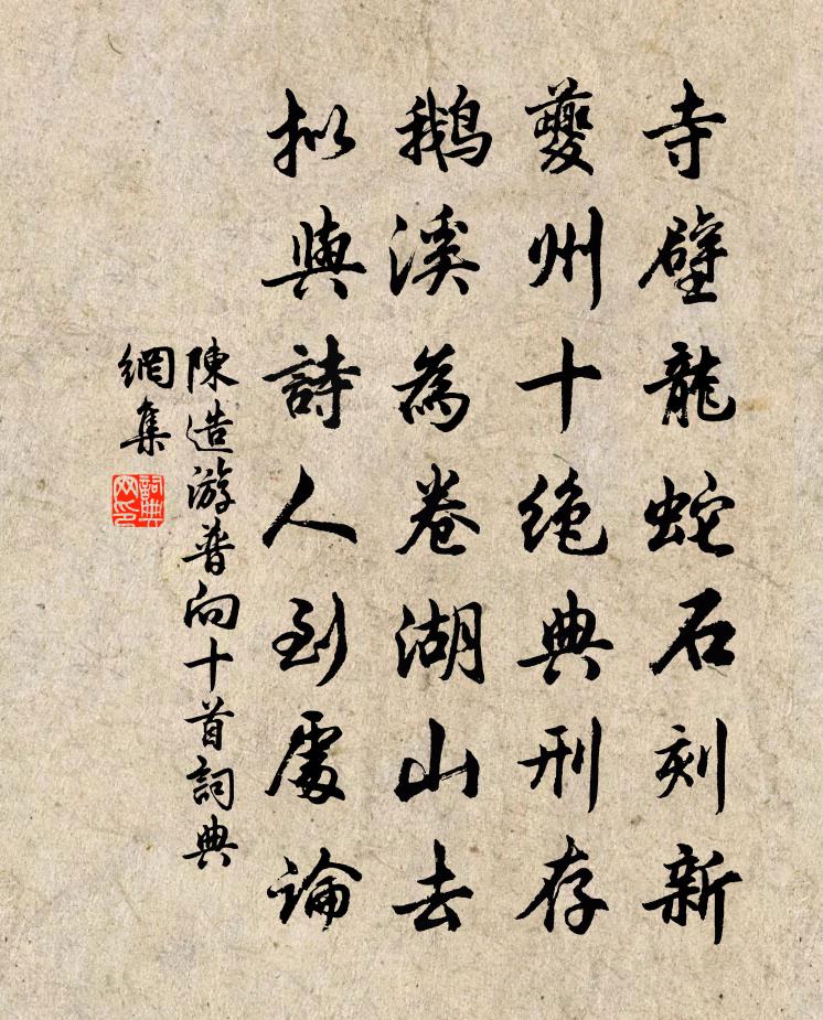 詩詞名句歷史字典書法欣賞書法字典國語詞典說文解字康熙字典古漢語字典標 題 作 者 詩 句 游普向十首作者:陳造 朝代:宋代游普向十首原文寺壁龍蛇石刻新,夔州十絕典刑存。鵝溪為卷湖山去,擬與詩人到處論。詩詞問答問:游普向十首的作者是誰?答:陳造問:游普向十首寫於哪個朝代?答:宋代陳造游普向十首書法欣賞游普向十首書法作品詩詞推薦逍遙詠宋太宗〔宋代〕我達逍遙理,陰陽運五行。道從初一變,德合混三清。聖境堪依仗,狐疑中不成。異端達雅淡,返禍自輕生。山行楊萬里〔宋代〕山行兩日厭荒涼,田少山多多更長。一望不曾虧碧草,半分何似借青秧?奉和襲美太湖詩二十首。練瀆(一雲吳王開以練兵)陸龜蒙〔唐代〕越恃君子眾,大將壓全吳。吳將派天澤,以練舟師徒。一鏡止千里,支流忽然迂。蒼奩朿洪波,坐似馮夷軀。戰艦重登滕王閣李涉〔唐代〕滕王閣上唱伊州,二十年前向此游。半是半非君莫問,好山長在水長流。怯酒贈周繇(一作答周為憲看牡丹)段成式〔唐代〕大白東西飛正狂,新芻石凍雜梅香。詩中反語常迴避,尤怯花前喚索郎。命子 其二陶淵明〔魏晉〕紛紛戰國,漠漠衰周。鳳隱於林,幽人在丘。逸虬繞雲,奔鯨駭流。天集有漢,眷予愍侯。七夕張鎡〔宋代〕秋近疏飈未轉涼,彩盤珠閣已傳觴。佳期天上頻逢節,卻老人間未有方。蟾魄嫩明情繾綣,鵲河斜界色滄浪。瓜盤書萍實旅舍張埴〔宋代〕身謀落落屠羊說,心事冥冥司馬炎。告訴春風無一語,江南陌上雨廉纖。送舅氏野夫之宣城黃庭堅〔宋代〕試說宣城郡,停杯且細聽。晚樓明宛水,春騎簇昭亭。罷稏豐圩戶,桁楊臥訟庭。謝公歌舞處,時對換鵝經。大滌洞天留題趙崇渭〔宋代〕福地天然號洞霄,王畿密邇路非遙。淡濃翠碧山重列,圓碎珠璣泉一條。九鎖真成仙境勝,借行頓使客愁銷。超凡陳子厚送韶鴨將以七絕因次其韻吳芾〔宋代〕久聞韶鴨有靈蹤,首尾俱輕快御風。公獨惠然持見贈,應知野性與余同。次韻陸務觀編修新津遇雨,不得登修覺山,徑范成大〔宋代〕雨後蟆頤山色開,玻璃江清已可杯。綠荷紅芰香四合,又入芙蓉城裡來。定風波歐陽修〔宋代〕把酒花前欲問伊。忍嫌金盞負春時。紅顏不能旬日看。宜算。須知開謝只相隨。蝶去蝶來猶解戀。難見。回頭還是曉枕追記山梅衛宗武〔宋代〕高眠紙帳思無塵,只憶冰花入夢頻。斜倚溪山獨標緻,明分霜月倍精神。瑞才六出先呈臘,香壓群芳不敢春。今古句馮時行〔宋代〕兒童便讀山中記,老大才登記裹山。十一月望後同徐子融黃子功送先生歸閩是夕宿陳文蔚〔宋代〕先生風節本高寒,千仞峰頭雪正漫。一夕諸生聆妙論,時人莫作剡溪看。蜜蜂釋雲岫〔宋代〕生涯未足怕征科,一日園林幾度過。股倦不嫌花粉重,年年只愛子孫多。再次韻兼簡履中南玉三首黃庭堅〔宋代〕鎖江亭上一樽酒,山自白雲江自橫。李侯短褐有長處,不與俗物同條生。經術貂蟬續狗尾,文章瓦釜作雷鳴。古來瑞上人求詩戴表元〔宋代〕寶葉山中源悟師,布衲百結面如痴。十年相憶忽在眼,談笑甚似仍耽詩。緣識宋太宗〔宋代〕清靜真空理,不無解者難。縱橫依見性,廓落智中觀。坦蕩歸仁德,辛勤久遠看。勿教為逆順,平地入雲端。名句推薦四牡何時入,吾君憶履聲。張九齡《奉和聖制送尚書燕國公赴朔方》 知人者智,自知者明。老子《老子·道經·第三十三章》 石卵不敵。蛇龍不鬥。馮夢龍《警世通言·卷九》 為君持酒勸斜陽,且向花間留晚照。宋祁《玉樓春·春景》 春日宴,綠酒一杯歌一遍。馮延巳《長命女·春日宴》 小酌酒巡銷永夜,大開口笑送殘年。白居易《雪夜小飲贈夢得》 威成於禮,恃以刑,失之縱。來俊臣《羅織經·治下卷第三》 雲物不殊鄉國異,教兒且覆掌中杯。杜甫《小至》 依舊,依舊,人與綠楊俱瘦。秦觀《如夢令·春景》 西施若解傾吳國,越國亡來又是誰。羅隱《西施》