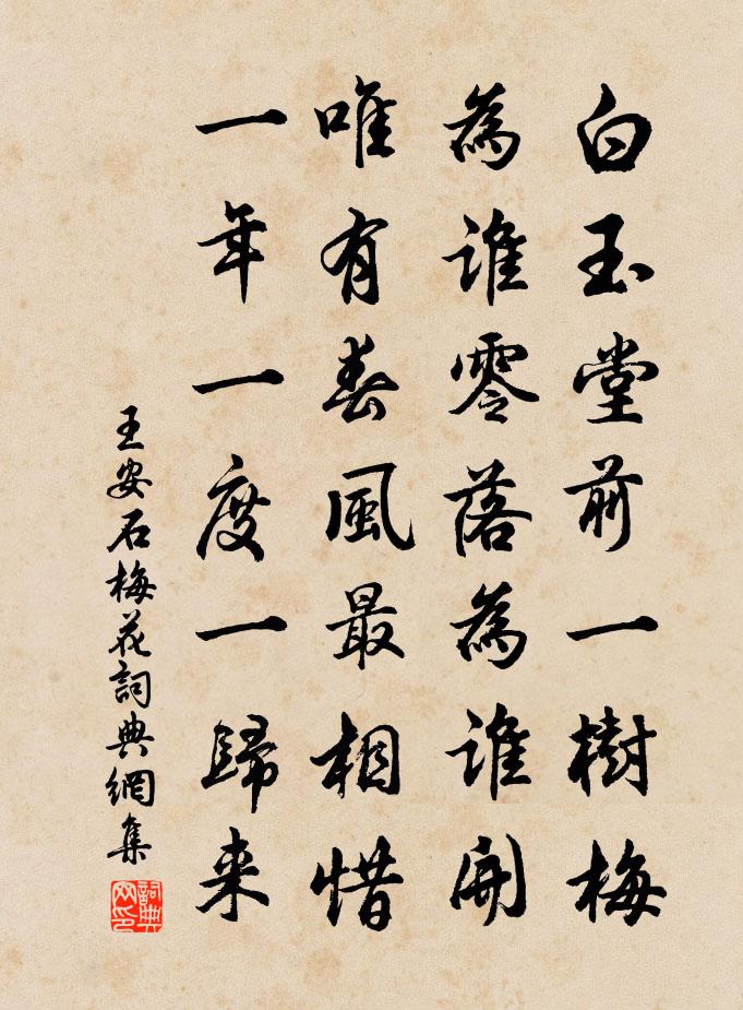 詩詞名句歷史字典書法欣賞書法字典國語詞典說文解字康熙字典古漢語字典標 題 作 者 詩 句 梅花作者:王安石 朝代:宋代梅花原文白玉堂前一樹梅,為誰零落為誰開。唯有春風最相惜,一年一度一歸來。詩詞問答問:梅花的作者是誰?答:王安石問:梅花寫於哪個朝代?答:宋代問:王安石的名句有哪些?答:王安石名句大全王安石梅花書法欣賞梅花書法作品譯文和注釋譯文白玉堂前前有一棵梅花樹,梅樹花謝花開,卻不知為誰而開為誰而謝。年復一年,不見旁人相惜,唯獨那吹拂的春風,每年歸來相探。 注釋白玉堂:神仙所居,亦喻指富貴人家的邸宅。 唯有:只有,唯獨。標籤:詠物,梅花詩詞推薦慶清朝 榴花王沂孫〔宋代〕玉局歌殘,金陵句絕,年年負卻薰風。西鄰窈窕,獨憐入戶飛紅。前度綠陰載酒,枝頭色比舞裙同。何須擬,蠟珠櫻桃花元稹〔唐代〕櫻桃花,一枝兩枝千萬朵。花磚曾立摘花人,窣破羅裙紅似火。賞春 / 芳草 / 春遊郁然有懷賦羅鄴〔唐代〕芳草和煙暖更青,閒門要路一時生。 年年點檢人間事,唯有春風不世情。臨江仙·寒柳納蘭性德〔清代〕飛絮飛花何處是,層冰積雪摧殘,疏疏一樹五更寒。愛他明月好,憔悴也相關。最是繁絲搖落後,轉教人憶春山。望岳三首·其二杜甫〔唐代〕西嶽崚嶒竦處尊,諸峰羅立似兒孫。安得仙人九節杖,拄到玉女洗頭盆。車箱入谷無歸路,箭栝通天有一門。稍待詠愁石象之〔宋代〕來何容易去何遲,半在心頭半在眉。門掩落花春去後,窗窺殘月酒醒時。柔如萬頃連天草,亂比千尋匝地絲。除卻卜運算元 詠梅陸游〔宋代〕驛外斷橋邊,寂寞開無主。已是黃昏獨自愁,更著風和雨。無意苦爭春,一任群芳妒。零落成泥輾作塵,只有香如繡鸞鳳花犯·賦水仙周密〔宋代〕楚江湄,湘娥乍見,無言灑清淚。淡然春意。空獨倚東風,芳思誰寄。凌波路冷秋無際。香雲隨步起。謾記得,漢古梅二首蕭德藻〔宋代〕湘妃危立凍蛟脊,海月冷掛珊瑚枝。醜怪驚人能嫵媚,斷魂只有曉寒知。百千年蘚著枯樹,三兩點春供老枝。絕壁寓居定惠院之東雜花滿山有海棠一株土人不知貴也蘇軾〔宋代〕江城地瘴蕃草木,只有名花苦幽獨。嫣然一笑竹籬間,桃李漫山總粗俗。也知造物有深意,故遣佳人在空谷。自然南鄉子·詠瑞香顧太清〔清代〕花氣靄芳芬,翠幕重簾不染塵。夢裡真香通鼻觀,氤氳。不是婷婷倩女魂。細蕊綴紛紛,淡粉輕脂最可人。懶與凡京兆府新栽蓮(時為盩厔縣尉趨府作)白居易〔唐代〕污溝貯濁水,水上葉田田。我來一長嘆,知是東溪蓮。下有青泥污,馨香無復全。上有紅塵撲,顏色不得鮮。物性趙昌寒菊蘇軾〔宋代〕輕肌弱骨散幽葩,更將金蕊泛流霞。欲知卻老延齡藥,百草摧時始起花。錢氏池上芙蓉文徵明〔明代〕九月江南花事休, 芙蓉宛轉在中洲。美人笑隔盈盈水, 落日還生渺渺愁。露洗玉盤金殿冷, 風吹羅帶錦城秋王充道送水仙花五十枝欣然會心為之作詠黃庭堅〔宋代〕凌波仙子生塵襪,水上輕盈步微月。是誰招此斷腸魂,種作寒花寄愁絕。含香體素欲傾城,山礬是弟梅是兄。坐對玉台觀杜甫〔唐代〕浩劫因王造,平台訪古游。彩雲蕭史駐,文字魯恭留。宮闕通群帝,乾坤到十洲。人傳有笙鶴,時過此山頭。初出金門,尋王侍御不遇,詠壁上鸚鵡李白〔唐代〕落羽辭金殿,孤鳴咤繡衣。能言終見棄,還向隴西飛。蝶戀花·笑艷秋蓮生綠浦晏幾道〔宋代〕笑艷秋蓮生綠浦。紅臉青腰,舊識凌波女。照影弄妝嬌欲語。西風豈是繁華主。可恨良辰天不與。才過斜陽,又是寒夜杜耒〔宋代〕寒夜客來茶當酒,竹爐湯沸火初紅。尋常一樣窗前月,才有梅花便不同。喜春來·春宴元好問〔金代〕梅殘玉靨香猶在,柳破金梢眼未開。東風和氣滿樓台,桃杏拆,宜唱喜春來。名句推薦勸君莫惜金縷衣,勸君惜取少年時。杜秋娘《金縷衣》 不戚戚於貧賤,不汲汲於富貴。陶淵明《五柳先生傳》 此路無知己,明珠莫暗投。高適《送魏八》 竹竿有甘苦,我愛抱苦節。孟郊《苦寒吟》 蝴蝶不傳千里夢,子規叫斷三更月。辛棄疾《滿江紅·點火櫻桃》 蕭蕭梧葉送寒聲,江上秋風動客情。葉紹翁《夜書所見》 軍中無戲言羅貫中《三國演義·第二十五回》 兒童強不睡,相守夜歡嘩。蘇軾《守歲》 成事享其功,敗事委其過,且聖人弗能逾者,概人之本然也。來俊臣《羅織經·閱人卷第一》 南山與秋色,氣勢兩相高。杜牧《長安秋望》