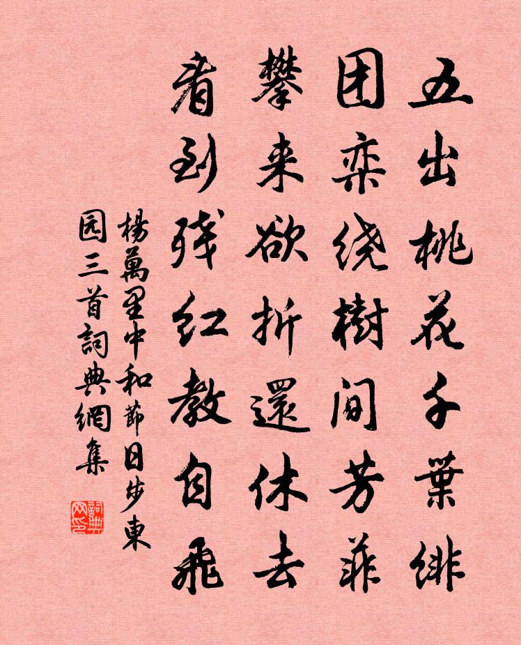 五出桃花千葉緋,團欒繞樹間芳菲。攀來欲折還休去,看到殘紅教自飛。