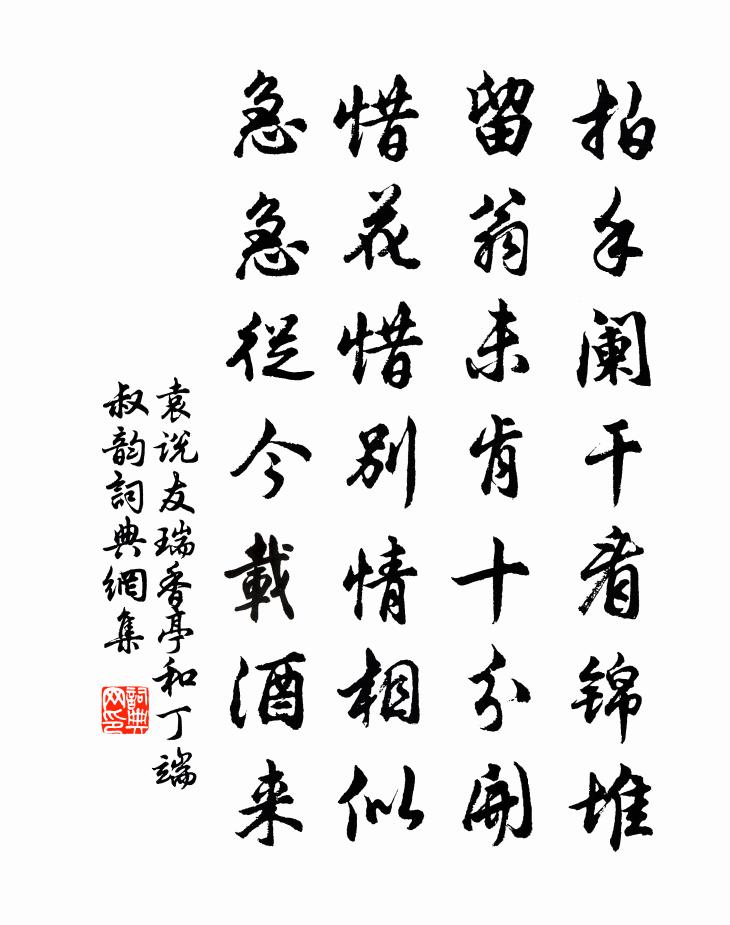 詩詞名句歷史字典書法欣賞書法字典國語詞典說文解字康熙字典古漢語字典標 題 作 者 詩 句 瑞香亭和丁端叔韻作者:袁說友 朝代:宋代瑞香亭和丁端叔韻原文拍手闌乾看錦堆,留翁未肯十分開。惜花惜別情相似,急急從今載酒來。詩詞問答問:瑞香亭和丁端叔韻的作者是誰?答:袁說友問:瑞香亭和丁端叔韻寫於哪個朝代?答:宋代袁說友瑞香亭和丁端叔韻書法欣賞瑞香亭和丁端叔韻書法作品詩詞推薦西江月(賦丹桂)辛棄疾〔宋代〕宮粉厭塗嬌額,濃妝要壓秋花。西真人醉憶仙家。飛珮丹霞羽化。十里芬芳未足,一亭風露先加。杏腮桃臉費鉛華冬青行二首唐珏〔宋代〕馬箠問髐形,南面欲起語。野麕尚屯束,何物敢盜取。余花拾飄蕩,白日哀后土。六合忽怪事,蛻龍掛茅宇。老天讀書陸游〔宋代〕束 * 交一世豪,暮年憔悴困蓬蒿。文辭博士書驢券,職事參軍判馬曹。病里猶須看周易,醉中亦復讀離騷。若為丁卯元日十首劉克莊〔宋代〕北關南盪霽華開,輦御端門肆眚回。野老相逢談聖德,散齋蔬素到燔柴。題箋裘萬頃〔宋代〕六七葉蘆秋雨里,兩三個雁夕陽邊。青天萬里渾無礙,衝破寒潭一抹煙。三門與臧奎推官聯句題東樓魏野〔宋代〕二陝三門境,江城想未勝。早衙連廟鼓,夜市雜船燈。乞任多朝市,忘歸有海僧。東樓仍更好,欲去又同登。塞下曲六首李白〔唐代〕五月天山雪,無花只有寒。笛中聞折柳,春色未曾看。曉戰隨金鼓,宵眠抱玉鞍。願將腰下劍,直為斬樓蘭。天兵秋晚陸游〔宋代〕庭草猶殘綠,溪楓已半丹。誰知此翁健,又見一年寒。幻境槐安夢,危機竹節灘。如今渾過盡,摩腹且加餐。相思引袁去華〔宋代〕曉鑒燕脂拂紫綿。未忄欠梳掠髻雲偏。日高人靜,瀋水裊殘煙。春老菖蒲花未著,路長魚雁信難傳。無端風絮,飛琴曲歌辭。明月引盧照鄰〔唐代〕洞庭波起兮鴻雁翔,風瑟瑟兮野蒼蒼。浮雲卷霍,明月流光。荊南兮趙北,謁石兮清湘。澄清規於萬里,照離思於次韻和岳醵飲西峰寺分韻成詩十四首見寄陳著〔宋代〕傑瓶酒榼近多空,書友詩朋亦閒逢。只有漁樵是知己,也嫌老似雪中松。女筵樂語姚勉〔宋代〕瑤姬來自狀元家,真是姚黃第一花。玳席艷開春富貴,魚軒榮駐遠光華。梅梢欲動朱檐雪,竹葉微潮玉臉霞。正好岳州端午日送人游郴連徐夤〔唐代〕五月巴陵值積陰,送君千里客於郴。北風吹雨黃梅落,西日過湖青草深。競渡岸傍人掛錦,采芳城上女遺簪。九嶷一落索方千里〔宋代〕心抵江蓮長苦。凌波人去。厭厭消瘦不勝衣,恨清淚、多於雨。舊曲慵歌瓊樹。誰傳香素。碧溪流水過樓前,問紅懷江村何宏甫自贛上寄林檎戴復古〔宋代〕人好物亦好,交深誼轉深。他鄉如對面,異體實同心。未得平安報,相思長短吟。無從回去馬,有便寄來禽。下灘劉子翬〔宋代〕亂石槎牙瀉怒濤,滿船性命等鴻毛。莫夸好手翻成誤,寄語舟人穩著篙。別離情所鍾十二章章四句送定叟弟之官嚴陵張栻〔宋代〕送子目力短,朔風吹我裾。心焉獨如結,子也當念予。澗錄招飲次日乃生朝葛天民〔宋代〕平生南磵古遺民,初度招呼我輩人。每聽謔談須絕倒,極知老氣政輪囷。杯盤滿坐添燈火,兒女成行勸主賓。但願初過隴山途中,呈宇文判官岑參〔唐代〕一驛過一驛,驛騎如星流。平明發鹹陽,暮及隴山頭。隴水不可聽,嗚咽令人愁。沙塵撲馬汗,霧露凝貂裘。西來贈何符山人二首陳造〔宋代〕小計謀氏粲春葩,傳遍侯家與主家。未怪東來將雙影,十年囊筆飯京華。名句推薦深居俯夾城,春去夏猶清。李商隱《晚晴》 獨上小摟春欲暮,愁望玉關芳草路。韋莊《木蘭花·獨上小樓春欲暮》 雲雷,屯;君子以經綸。佚名《易傳·象傳上·屯》 人之忌,在好為人師。孟子《孟子·離婁章句上·第二十三節》 學而時習之,不亦說乎?佚名《論語十則》 大風起兮雲飛揚。威加海內兮歸故鄉。劉邦《大風歌》 形勝三分國,波流萬世功。潘大臨《江間作四首·其三》 遙知兄弟登高處,遍插茱萸少一人。王維《九月九日憶山東兄弟 / 九月九憶山東兄弟》 但知江湖者,都是薄命人。佚名《增廣賢文·下集》 圖難於其易,為大於其細老子《老子·德經·第六十三章》