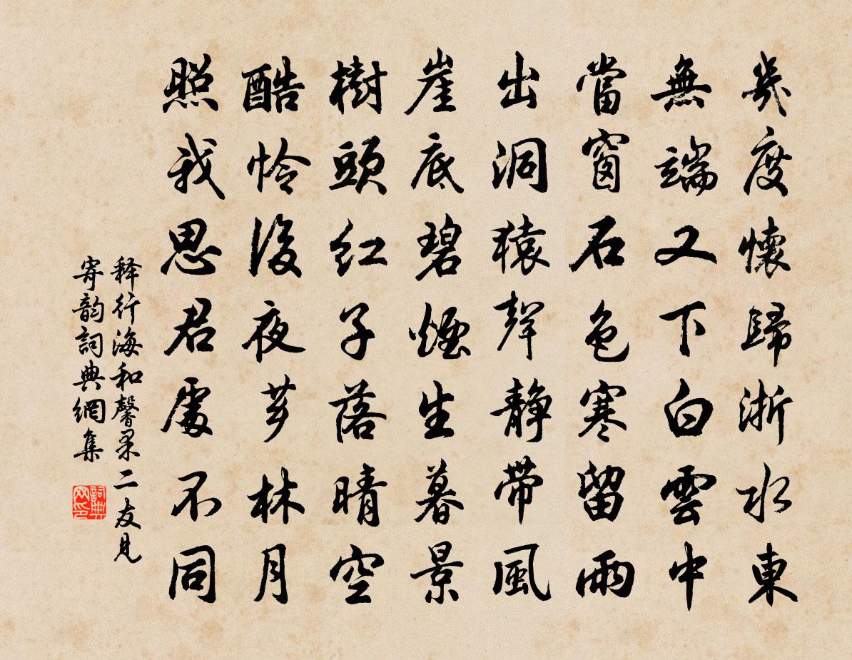 詩詞名句歷史字典書法欣賞書法字典國語詞典說文解字康熙字典古漢語字典標 題 作 者 詩 句 和馨果二友見寄韻作者:釋行海 朝代:宋代和馨果二友見寄韻原文幾度懷歸浙水東,無端又下白雲中。當窗石色寒留雨,出洞猿聲靜帶風。崖底碧煙生暮景,樹頭紅子落晴空。酷憐後夜薌林月,照我思君處不同。詩詞問答問:和馨果二友見寄韻的作者是誰?答:釋行海問:和馨果二友見寄韻寫於哪個朝代?答:宋代釋行海和馨果二友見寄韻書法欣賞和馨果二友見寄韻書法作品詩詞推薦發安化回望黃州山張耒〔宋代〕流落江湖四見春,天恩復與兩朱輪。幾年魚鳥真相得,從此江山是故人。碧落已瞻新日月,故園好在舊交親。此生臨江仙(再到桂林)向滈〔宋代〕瘦損東陽綠底事,離愁別恨難禁。夜長誰共擁孤衾。來時青鬢在,今已二毛侵。流水青山依舊是,蘭橈往事空尋。偈頌一百零九首釋可湘〔宋代〕我此震旦人,到底少意氣。放伊過界來,波濤起平地。直指單傳,有甚巴鼻。神光因為這些,著了娘生只臂。是旃奉使契丹二十八首 絕句二首蘇轍〔宋代〕亂山環合疑無路,小徑縈迴長傍溪。仿佛夢中尋蜀道,興州東谷鳳州西。日色映山才到地,雪花鋪草不曾消。睛寒沅江李氏書堂梅堯臣〔宋代〕船從洞庭來,非賈即遊宦。宦賈事風檣,誰能樂清晏。不如蓄書史,萬古無與間,上觀堯舜仁,下覽魏晉篡。善惡失調名佚名〔宋代〕花開時節連風雨。六月初七日雨小止游蒲溪臨獨木橋而還張嵲〔宋代〕石岩兩相束,竹樹交柯綠。因聽林外聲,遂來幽澗曲。濕煙深不散,淺瀨漂寒玉。木杪見雲生,前峰聊注目。青玉案(閒居)張炎〔宋代〕萬紅梅里幽深處。甚杖屨、來何暮。草帶湘香穿水樹。塵留不住。雲留卻住。壺內藏今古。獨清懶入終南去。有忙答陳傳道五首之三賀鑄〔宋代〕遊宦幾人達,不知強健歸。未容夸晝錦,幾見化緇衣。早春送郎官出宰袁求賢〔唐代〕仙郎今出宰,聖主下憂民。紫陌軒車送,丹墀雨露新。趨程猶犯雪,行縣正逢春。粉署時回首,銅章已在身。鳴琴眉州驛舍睡起陸游〔宋代〕平生百無能,一嬾每自喜。胡為八年間,逐食走萬里。身如盤汞轉,人似爐丹死。事君未免媿,富貴不如已。雨余燕城讀史羅公升〔宋代〕隋唐晉漢本胡種,自入中國皆衣冠。不知耶律稱皇帝,何似文皇號可汗。草堂寺詩陳堯咨〔宋代〕□□□跡□禪關,□殿清虛檜影間。客□□臨來此境,僧□興廢指前山。醉聞溪溜吟懷□,坐對嵐峰世慮閒。他日村舍陸游〔宋代〕空穀人稀到,新寒病頓輕。晨霜催小獵,宿雨潤新耕。草莽秦馳道,雲煙越故城;千年不磨滅,惟有暮山橫。月夜泛小舟湖中三更乃歸陸游〔宋代〕落日愁思把釣鉤,南鄰借得采菱舟。湖心月上明如晝,樹杪風生冷逼秋。壯歲功名慚汗馬,暮年心事許沙鷗。桐江日本然上人1釋紹曇〔宋代〕橫擔楖栗走諸方,佛祖玄關路轉長。放下身心歸故隱,金烏依舊出扶桑。聞角晁說之〔宋代〕邊城百感謾興嗟,將底令人警歲華。多謝何郎有新句,誰聞夜夜小梅花。贈李得甫寄拙軒方回〔宋代〕吾嘗鄙文賦,陸機自炫鬻。濬發夸巧心,見唾憾拙目。□□淵明詩,莫若黃山谷。或者巧斧斤,疑謂拙不足。詩文偈頌七十二首釋祖欽〔宋代〕堂堂日用妙無痕,才涉織毫即是塵。照水銀蟾沉夜魄,戀花香蝶醉芳魂。次前韻謝胡運屬二首陳造〔宋代〕爐煙褭褭上晴絲,伴閱長須送似詩。眼著昏花予已老,句鏘哀玉子能奇。隨人趨步庸非俗,取意妝梳自入時。大手名句推薦不知細葉誰裁出,二月春風似剪刀。賀知章《詠柳 / 柳枝詞》 盛事惟忠,庸則自從。來俊臣《羅織經·控權卷第四》 喜怒不形於色。房玄齡《晉書·列傳·第十九章》 明月照高樓,流光正徘徊。曹植《七哀》 肯救人坑坎中,便是活菩薩王永彬《圍爐夜話·第二八則》 已從招提游,更宿招提境杜甫《游龍門奉先寺》 茂苑人歸,秦樓燕宿,同惜天涯為旅。吳文英《齊天樂·新煙初試花如夢》 不孝有三,無後為大。孟子《孟子·離婁章句上·第二十六節》 不知江月待何人,但見長江送流水。張若虛《春江花月夜》 惟有兩行低雁,知人倚、畫樓月。范成大《霜天曉角·梅》