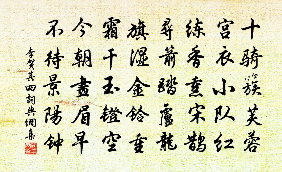 詩詞名句歷史字典書法欣賞書法字典國語詞典說文解字康熙字典古漢語字典標 題 作 者 詩 句 其四作者:李賀 朝代:唐代其四原文十騎簇芙蓉,宮衣小隊紅。練香熏宋鵲,尋箭踏盧龍。旗濕金鈴重,霜乾玉鐙空。今朝畫眉早,不待景陽鍾。詩詞問答問:其四的作者是誰?答:李賀問:其四寫於哪個朝代?答:唐代問:李賀的名句有哪些?答:李賀名句大全李賀其四書法欣賞其四書法作品注釋全唐詩詩詞推薦和全父弟立秋喜雨陽枋〔宋代〕造化仁民意,瀟瀟夜雨聲。焦原換得潤,枯黍喜更生。染出林陰密,濯余天氣清。秋河從此挽,盡洗北來兵。同楊方叔游開寶上方有懷裡中二三故人韓維〔宋代〕京都寡臨觀,茲地高且明。仲科一來望,曠然寫予情。千載豪傑盡,夷門荊棘生。時平盛民物,華屋連飛甍。長煙北七寺方信孺〔宋代〕國清尊勝北山隅,證果報恩同一區。地藏荒蕪並報國,尚余悟性鬥牛墟。送高郎中北使杜審言〔唐代〕北狄願和親,東京發使臣。馬銜邊地雪,衣染異方塵。歲月催行旅,恩榮變苦辛。歌鐘期重錫,拜手落花春。句趙蕃〔宋代〕青雲道遠龍媒老,白雪詞高鬼膽寒。奉送少訥還青神文同〔宋代〕濕雲堆空泄淫雨,日與三嵎氣相軋。春陽沈伏不得動,萬木屈櫱草藏茁。叢岡復嶺誰敢度,旦暮寒雞叫泥滑。少訥贈陰陽家童國用曾豐〔宋代〕生於參政侍郎村,它尚詩書況近孫。鐵硯無功招白眼,金函有訣動朱門。天開西北眾星聚,地辟東南元氣溫。要就天馬歌何麟瑞〔宋代〕崑崙高哉二千五百餘里,日月相隱避。黃河發源下有渥窪水,大宛群馬飲其澨。天馬下與群馬戲,產駒一日可千里放言王禹偁〔宋代〕人生唯問道如何,得喪升沉總是虛。寧可飛鳥隨四皓,未能魚腹葬三閭。傅岩偶夢誰調鼎,彭澤高歌自荷鋤。不向題禹廟二首張鎡〔宋代〕從來大智特閒閒,手足胼胝意不艱。千古夏王崇廟祀,濬川功用只隨山。嘉泰三年皇后冊寶十三首佚名〔宋代〕端門曉開,端氣雲凝。有儼良輔,踵武告延。肅肅王命,是將是承。登冊穆清,萬幾永膺。水調歌頭佚名〔宋代〕霽色滿空碧,爽氣正橫秋。登高行樂,□來只說古巴州。掃□塵埃來坐,攜取煙雲杖屨,容□□清游。坐上盡佳客黃鶴洞中仙 繼重陽韻馬鈺〔元代〕火院須當遠。塵事難為染。因遇風仙棄冤親,做個投真馬,得得超彼岸。即達逍遙岸。鍊氣如素練。專下工夫分假送蘇修撰赴闕四首張載〔宋代〕道大寧容小不同,顓愚何敢與機通。並疆師律三王事,請議成功器業中。溪村晚望王鎡〔宋代〕宿路分行落照邊,村藏深樹遠吹煙。天然詩句無人識,劃記寒沙抄一篇。晨起白雲樓寄龍興江準上人兼呈竇秀才許渾〔唐代〕茲樓今是望鄉台,鄉信全稀曉雁哀。山翠萬重當檻出,水華千里抱城來。東岩月在僧初定,南浦花殘客未回。欲吊早春魚亭山薛稷〔唐代〕春氣動百草,紛榮時斷續。白雲自高妙,裴回空山曲。陽林花已紅,寒澗苔未綠。伊余息人事,蕭寂無營欲。客行書文山卷後謝翱〔宋代〕魂飛萬里程,天地隔幽明。死不從公死,生如無此生。丹心渾未化,碧血已先成。無處堪揮淚,吾今變姓名。律僧智遠〔唐代〕濾水與龕燈,長長護有情。自從青草出,便不下階行。北闕應無夢,南山舊有名。將何喻浮世,惟指浪漚輕。送同年張孝孫勾簿潁陰宋祁〔宋代〕雪序繁雲掠苑回,行人此地一銜杯。東西溝上歌流水,南北枝頭怨贈梅。綿竹誦篇沈秘幄,堵坡題字晦輕埃。莫辭名句推薦櫚庭多落葉,慨然知已秋。陶淵明《酬劉柴桑》 不怕三十而死,只怕死後無名。佚名《增廣賢文·下集》 土膏欲動雨頻催,萬草千花一餉開;范成大《春日田園雜興》 大嫂采芙蓉,溪湖千萬重。李白《湖邊採蓮婦》 一笛當樓,謝娘懸淚立風前史達祖《玉蝴蝶·晚雨未摧宮樹》 離人心上秋。吳文英《唐多令·惜別》 相思血,都沁綠筠枝。姜夔《小重山令·賦潭州紅梅》 夫兩貴之不能相事,兩賤之不能相使,是天數也。荀子《荀子·王制》 古之人,得志,澤加於民;不得志,修身見於世。窮則獨善其身,達則兼善天下。孟子《孟子·盡心章句上·第九節》 深林人不知,明月來相照。王維《竹里館》