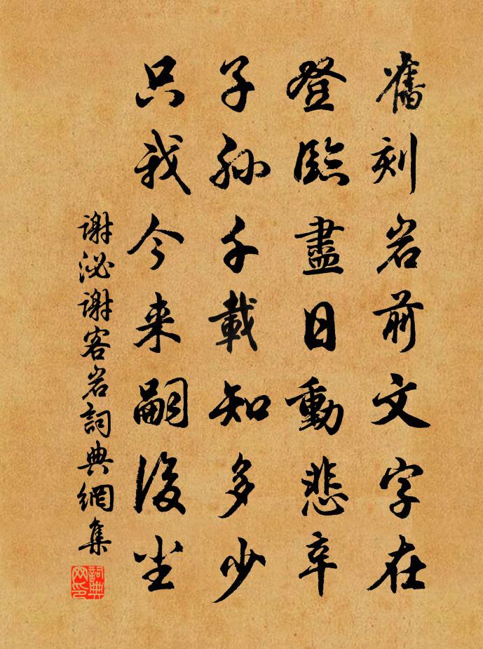 詩詞名句歷史字典書法欣賞書法字典國語詞典說文解字康熙字典古漢語字典標 題 作 者 詩 句 謝客岩作者:謝泌 朝代:宋代謝客岩原文舊刻岩前文字在,登臨盡日動悲辛。子孫千載知多少,只我今來嗣後塵。詩詞問答問:謝客岩的作者是誰?答:謝泌問:謝客岩寫於哪個朝代?答:宋代謝泌謝客岩書法欣賞謝客岩書法作品詩詞推薦戴唐卿輓詞林季仲〔宋代〕湖海長為客,干戈僅脫身。來尋林下友,半與鬼為鄰。馬上人何在,庭前草自春。平生饒意氣,寂寞委荊榛。崇政殿試御試貢士中昃不暇食因私賦宋庠〔宋代〕曩聖勤周日,虛懷軫睿思。方圖天輯命,詎恤食踰時。坐誡繁機壅,居忘側景疲。眷賢資德飽,詢善尉調飢。事帝和劉後村梅花百詠方蒙仲〔宋代〕不慕清官況熱官,竹籬紙帳睡差安。卻愁帝敕梅龍去,第一瑤台分外寒。和陶命子韻示津調官吳芾〔宋代〕我幸此生,不忘本始。身雖朝廷,心實田裡。所以暮年,知足知止。以進為憂,以退為喜。送十二兄還江西孔武仲〔宋代〕匣有青萍笥有書,西風隻影渡江湖。剩收嶽麓春前景,寫入新詩勝畫圖。溪上夜釣陸游〔宋代〕少時妄意學金丹,八十溪頭把釣竿。露濕茭叢姑惡哭,煙深沙渚鷺鷥寒。登臨每嘆乾坤大,強健猶應歲月寬。作意鷓鴣天(荊州別同官)張孝祥〔宋代〕又向荊州住半年。西風催放五湖船。來時露菊團金顆,去日池荷疊綠錢。斟別酒,扣離弦。一時賓從最多賢。今宵詠以人與天地萬物為一體刻印章詩徐元傑〔宋代〕三才中立囿形均,昧者拘拘利乃身。不道有身皆有血,豈應知我不知人。其間一物容虧性,是即四肢頑不仁。洞洞望牛頭寺杜甫〔唐代〕牛頭見鶴林,梯逕繞幽深。春色浮山外,天河宿殿陰。傳燈無白日,布地有黃金。休作狂歌老,回看不住心。陪王侍御同登東山最高頂宴姚通泉,晚攜酒泛江杜甫〔唐代〕姚公美政誰與儔,不減昔時陳太丘。邑中上客有柱史,多暇日陪驄馬游。東山高頂羅珍羞,下顧城郭銷我憂。清江玉真台趙彥端〔宋代〕春色無窮巷,農鄉有太和。病嗟聞道晚,貧喜得閒多。草徑供徐步,鄰花獲屢過。層台宜抗榭,誰與 * 波。蝶戀花(自東江乘晴過蟆頤渚園小飲)程垓〔宋代〕晴帶溪光春自媚。繞翠縈青,來約東風醉。雲補斷山疏復綴。雨回綠野清還麗。拄杖不妨舒客意。臨水人家,問有樵人十詠樵擔陸龜蒙〔唐代〕輕無斗儲價,重則筋力絕。欲下半岩時,憂襟兩如結。風高勢還卻,雪厚疑中折。負荷誠獨難,移之贈來哲。挽楊承事並夫人詩二首王洋〔宋代〕夢協幽蘭故可夸,來從君子更宜家。疏恩自合開新邑,比備還應副六珈。解使威儀同詁訓,聊隨輕薄事鉛華。自從萬安賴秀才家拾青樓二首周必大〔宋代〕經術逢辰富貴兼,取名銀艾未傷廉。更須喚作藏書閣,別貯鄴侯三萬簽。齋戒白居易〔唐代〕每因齋戒斷葷腥,漸覺塵勞染愛輕。六賊定知無氣色,三屍應恨少恩情。酒魔降伏終須盡,詩債填還亦欲平。從此和希深避暑香山寺梅堯臣〔宋代〕有客乘新霽,雲林共扣扃。輕舟過下渡,遠水漲前汀。原隰含幽藹,岑嵐入杳冥。誰知得深趣,履齒石苔青。謝三提乾召飲三首陳造〔宋代〕坐上紅衣未放歌,客間冷麵釂金荷。驚飛可待聞檀板,擬奈吾家故事何。送柳宜歸黃庭堅〔宋代〕折腳鐺邊煨淡粥,曲枝桑下飲離杯。書生不是南遷客,魑魅驚人須早回。閒閒公為上清宮道士寫經並以所養鵝群付之諸王洋〔宋代〕會稽筆法老無塵,今代閒閒是後身。只有愛鵝緣已盡,舉群還付和來人。名句推薦桃根桃葉終相守,伴殷勤、雙宿鴛鴦。納蘭性德《一叢花·詠並蒂蓮》 說詩者,不以文害辭,不以辭害志。以意逆志,是為得之。孟子《孟子·萬章章句上·第四節》 先行其言而後從之。孔子弟子《論語·為政篇》 流星透疏木,走月逆行雲。賈島《宿山寺》 初驚河漢落,半灑雲天裡。李白《望廬山瀑布水二首》 更深人去寂靜,但照壁孤燈相映。周邦彥《關河令·秋陰時晴漸向暝》 輕舟泛月尋溪轉,疑是山陰雪後來李白《東魯門泛舟二首》 聖人之為國也,觀俗立法則治,察國事本則宜。商鞅《商君書·算地》 念疇昔風流,暗傷如許。柳如是《金明池·詠寒柳》 絲長魚誤恐,枝弱禽驚踐。崔護《五月水邊柳》
