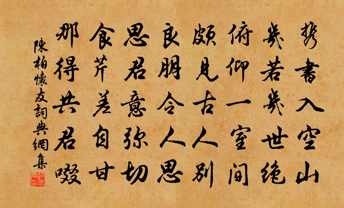 詩詞名句歷史字典書法欣賞書法字典國語詞典說文解字康熙字典古漢語字典標 題 作 者 詩 句 懷友作者:陳柏 朝代:宋代懷友原文攜書入空山,幾若幾世絕。俯仰一室間,頗見古人別。良朋令人思,思君意彌切。食芹差自甘,那得共君啜。詩詞問答問:懷友的作者是誰?答:陳柏問:懷友寫於哪個朝代?答:宋代陳柏懷友書法欣賞懷友書法作品詩詞推薦蕙香囊/鵲橋仙歐陽修〔宋代〕身作琵琶,調全宮羽,佳人自然用意。寶檀槽在雪胸前,倚香臍、橫枕瓊臂。組帶金鉤,背垂紅綬,纖指轉弦韻細和前韻廖行之〔宋代〕久雨送春晚,倦遊憐客窮。不因人事謬,安得詩篇工。鶯語喚昨夢,雞聲驚曉風。此時無好句,愁絕有誰同。六橋行(西湖)周端臣〔宋代〕芙蓉苑。記試酒清狂,嚲鞭游遍。翠紅照眼。凝芳露、洗出青霞一片。垂楊兩岸。窺鏡底、新妝深淺。應料似、錦燕史彌寧〔宋代〕管鮑交情已矣夫,君看門上翟公書。茅檐不鄙頻來往,叔末衣冠得似渠。詩一首薛紹彭〔宋代〕晉大司馬至洛陽,威略已著推砍羌。聲馳江龍傳國光,右軍筆陣爭堂堂。妙用作意驅後鋩,驚鴻乍起游龍翔。仁祖齊鳳皇銜書伎辭江淹〔南北朝〕皇齊啟運從瑤璣。靈鳳銜書集紫微。和樂既洽神所依。超商卷夏耀英輝。永世壽昌聲華飛。水調歌頭張元乾〔宋代〕雨斷翻驚浪,山瞑擁歸雲。麥秋天氣,聊泛征棹泊江村。不羨腰間金印,卻愛吾廬高枕,無事閉柴門。搔首煙波上菩薩蠻(喜雪)郭應祥〔宋代〕當年瑞雪多盈尺。今年僅有些兒白。天欲兆豐年。須教趁臘前。南枝初破萼。風味渾如昨。快與瀉銀瓶。寒醅醉易趙仲瑜小景二首陳某〔宋代〕老樹依岩壑,危橋隔遠村。桃花春滿岸,雲氣曉當門。白鳥來書屋,青山落酒樽。漁舟忽相過,疑是武陵源。桂張煒〔宋代〕痴兒總向月中求,不信人間賸有秋。萬點盡垂金粟顆,一枝宜上玉搔頭。清香已壓龍涎倒,墮萼宜將蟻醑浮。吟得題陳主管小壺天三首陳造〔宋代〕棋枰外世故,喧靜信奇偏。俗網恢三面,冰壺令一天。時供詩友課,未斷宰官緣。付我紅塵去,如君自半仙。跋小寺舊題劉克莊〔宋代〕禪幾曾陪白氎巾,柑花似雪斗芳新。而今柑子圓如彈,不見澆花供佛人。次韻周教授秋懷陳與義〔宋代〕一官不辦作生涯,幾見秋風捲岸沙。宋玉有文悲落木,陶潛無酒對黃花。天機袞袞山新瘦,世事悠悠日自斜。誤矣亦好園初春次韻喻良能〔宋代〕初日宜征轡,輕寒怯裌衣。蟹黃經雨潤,鴨綠得春肥。蓮花峰陳岩〔宋代〕風動雲開淨客顏,三千丈石錦爛斑。淤泥不是花開處,擢出天河綠水間。擬古閨怨三首王炎〔宋代〕花開復花謝,墮在藩溷邊。不惜花落盡,惜無長少年。將到金陵投宿烏江寺李彌遜〔宋代〕閱世真成一夢闌,塵埃誰復共開顏。辛壬癸甲常為客,南北東西只問山。縈樹遠雲高作蓋,護田流水曲於環。秋風冬夜陸游〔宋代〕百錢買菅席,錦茵亦何加;疋布縫麤裘,安用狐腋奢。昨者南山僧,松肪寄一車,可以照讀書,堅坐待朝霞。顧影感皇恩(和廣德知軍韻)吳潛〔宋代〕老去最難禁,流光如水。甲子從頭試□指。年年生日,怕被旁人拈起。若攀兒額,頹齡猶未。方丈瀛洲,藍溪碧沚滁上謫居王禹偁〔宋代〕跡忝詞林舊,官為郎署卑。同群甘鳥獸,苟祿為妻兒。未有一事立,空驚雙鬢衰。唯憐文集裡,添得謫官詩。名句推薦新來雁闊雲音,鸞分鑒影,無計重見。盧祖皋《宴清都·初春》 誰信多情道,相思漸覺詩狂少。吳綺《惜分飛·寒夜》 見人初解語嘔啞,不肯歸眠戀小車。韋莊《與小女》 擲地,當作金石聲房玄齡《晉書·列傳·第二十六章》 射人先射馬,擒賊先擒王。杜甫《前出塞九首·其六》 溫故,而知新,敦厚以崇禮。子思《中庸·第二十七章》 洞庭春溜滿,平湖錦帆張。陰鏗《渡青草湖》 不務天時,則財不生;不務地利,則倉廩不盈管仲《管子·牧民》 柳絲長,桃葉小。深院斷無人到。晏幾道《更漏子·柳絲長》 萬條千縷綠相迎。舞煙眠雨過清明。晏幾道《浣溪沙·二月和風到碧城》