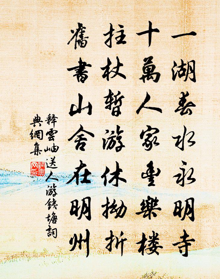 詩詞名句歷史字典書法欣賞書法字典國語詞典說文解字康熙字典古漢語字典標 題 作 者 詩 句 送人游錢塘作者:釋雲岫 朝代:宋代送人游錢塘原文一湖春水永明寺,十萬人家豐樂樓。拄杖暫游休拗折,舊書山舍在明州。詩詞問答問:送人游錢塘的作者是誰?答:釋雲岫問:送人游錢塘寫於哪個朝代?答:宋代釋雲岫送人游錢塘書法欣賞送人游錢塘書法作品詩詞推薦秋夜同暢當宿潭上西亭盧綸〔唐代〕圓月出山頭,七賢林下游。梢梢寒葉墜,灩灩月波流。鳧鵠共思曉,菰蒲相與秋。明當此中別,一為望汀洲。蠟梅袁燮〔宋代〕金相玉質舊同科,暗裡清香萬斛多。絕俗風流寧不似,調羹功用竟如何。輓歌詩陸機〔魏晉〕流離親友思。惆悵神不泰。素驂佇轜軒。玄駟騖飛蓋。哀鳴興殯宮。回遲悲野外。魂輿寂無響。但見冠與帶。備物聲聲慢(逃禪作梅、瑞香、水仙,字之曰三香)周密〔宋代〕瑤台月冷,佩渚煙深,相逢共話淒涼。曳雪牽雲,一般淡雅梳妝。樊姬歲寒舊約,喜玉兒、不負蕭郎。臨水鏡,看還文雅師書帙梅堯臣〔宋代〕編絕不加新,於今十二春。綠窗重展目,靜幾勿生塵。豈愛吾廬日,終將道者親。莫嫌同刺字,漫滅看難真。月岩趙師恕〔宋代〕眷此岩壑勝,領客共登臨。危棧臨不測,巘塗歷崎嵌。俯仰極高低,上下窮幽深。來登空明山,千崖正沉沉。下瞰賀表兄傅仁仲常後院生男王邁〔宋代〕昔君與我夜對床,知君著意選專房。為言東鄰有女寶,胡不貯之芸輝堂。君時為我一慫恿,以斗量金買嬌寵。小君戊辰冬和湯南萬韻杜范〔宋代〕我聞抱膝翁,高臥南中廬。方其未遇時,邈若與世疎。起來扶漢業,肉骨成豐腴。青簡萬世名,寒窗一編書。出處蝶戀花(再次韻千里照花)葛勝仲〔宋代〕百紫千紅今爛熳。舉燭輝花,莫厭燒令短。酒里逢花須細看。人生誰似英雄半。安得紅顏為老伴。妙舞花前,楊柳夜興陸游〔宋代〕夜闌扶策繞中庭,雲罅三三兩兩星。安得南風捲雲盡,爛然河白映天青。癸丑臘大暖志之葛洪〔宋代〕歲晏風裂肉,今乃頓和柔。玄冥在休許,而使威令收。陰冰澌已泮,礎柱汗交流。敝扇出故篋,老體捐輕裘。細人上陸鹽生辰五首黃公度〔宋代〕名家詩禮有諸郎,飛入南宮鴻雁行。不向人前稱閥閱,要須仙桂五枝芳。次韻苗彥先題薛獻可新居四首林季仲〔宋代〕仙隱深深竹徑中,杖藜還許我相從。君能惜取清陰在,斤斧須令赦籜龍。次韻鄉人賀歸項安世〔宋代〕早知芳樹不如歸,底用青天接翅飛。但了寢門安與否,更關城廓是和非。預愁計日當還次,安得窮年只掩扉。羨殺哭沈生張玉孃〔宋代〕中路婁長別,夜寒如隋雪。顧將今日意,化作陽台雲。晨起陸游〔宋代〕海燕翩將乳,戎葵粲己繁。魚船初入市,蒪擔未過門。年耄停朝課,家貧省小餐。所欣行藥處,秧稻遍村村。友生失意王珪〔唐代〕夢到天閽寤翼傷,拂衣歸去樂江鄉。丈夫豈識原非病,丞相應嗤蓋有狂。失馬未須嗟北塞,過關重約使南陽。君知送洪右史赴召三首喻良能〔宋代〕長公前日辭揆塗,少公今日被鋒車。路人共指拜內相,天子久欲登鴻儒。黃麻端擬似經訓,金蓮不獨榮傳呼。如聞玉山縣南樓晚望陸游〔宋代〕小樓在何許,正在南溪上。空濛過釣船,斷續聞漁唱。征途苦偪仄,舒嘯喜清曠。安得此溪水,為我發春釀。玉井亭觀白蓮二首楊萬里〔宋代〕紅芙蕖雜白芙蕖,紅底終稠白底疏。速折當頭一蓮葉,莫令遮卻雪肌膚。名句推薦樹樹皆秋色,山山唯落暉。王績《野望》 白髮三千丈,緣愁似個長。李白《秋浦歌十七首》 晚歲登門最不才,蕭蕭華發映金罍蘇洵《九日和韓魏公》 物各為主,無所責也。李大師、李延壽《南史·列傳·卷十六》 天門中斷楚江開,碧水東流至此回。李白《望天門山》 若教眼底無離恨,不信人間有白頭。辛棄疾《鷓鴣天·晚日寒鴉一片愁》 宮中彩女顏如花,飄然揮手凌紫霞,從風縱體登鸞車。李白《飛龍引二首·其一》 顛沛之揭,枝葉未有害,本實先撥詩經《盪》 落花水香茅舍晚,斷橋頭賣魚人散。馬致遠《壽陽曲·遠浦帆歸》 曾苦傷春不忍聽,鳳城何處有花枝李商隱《流鶯》